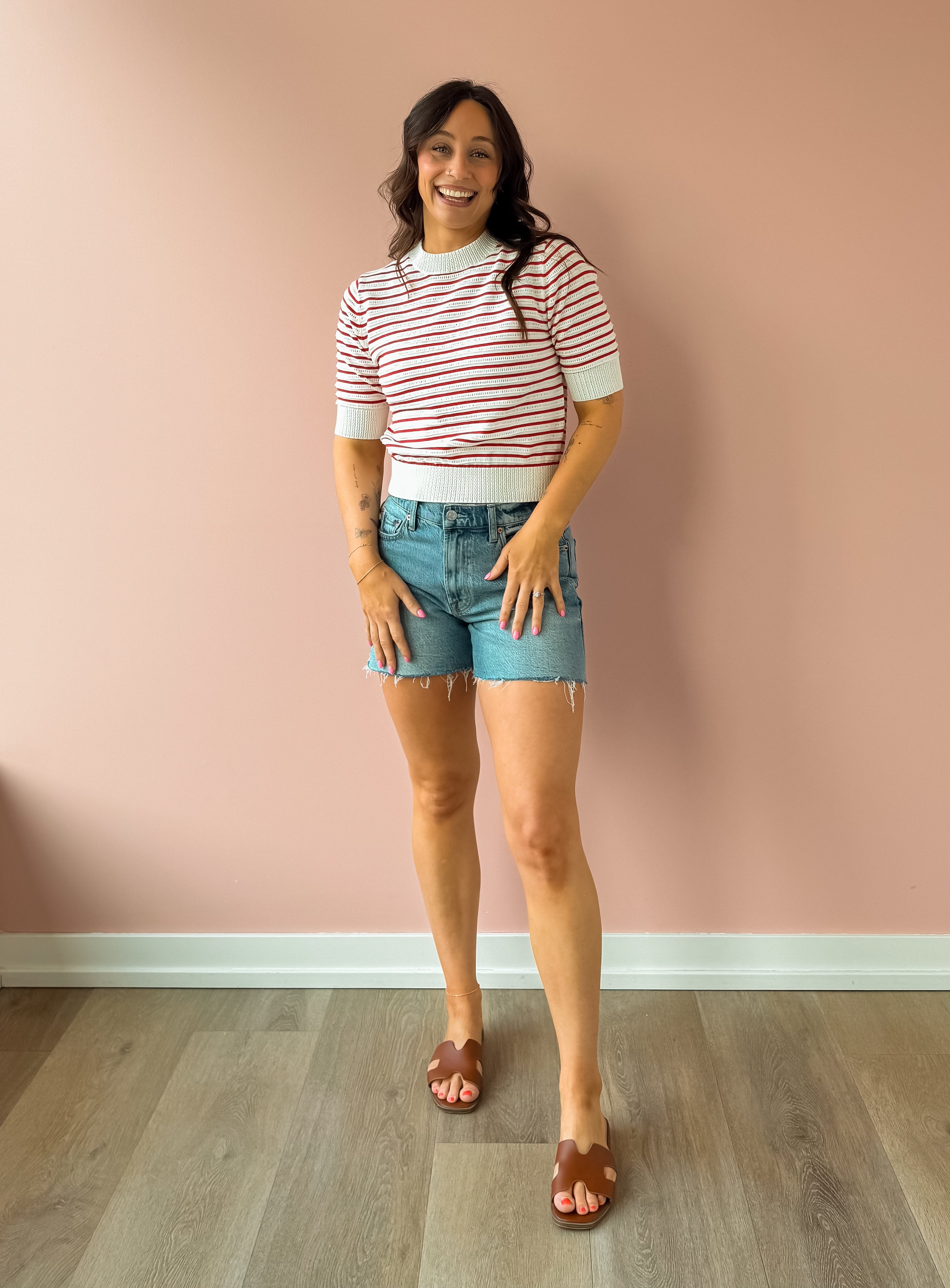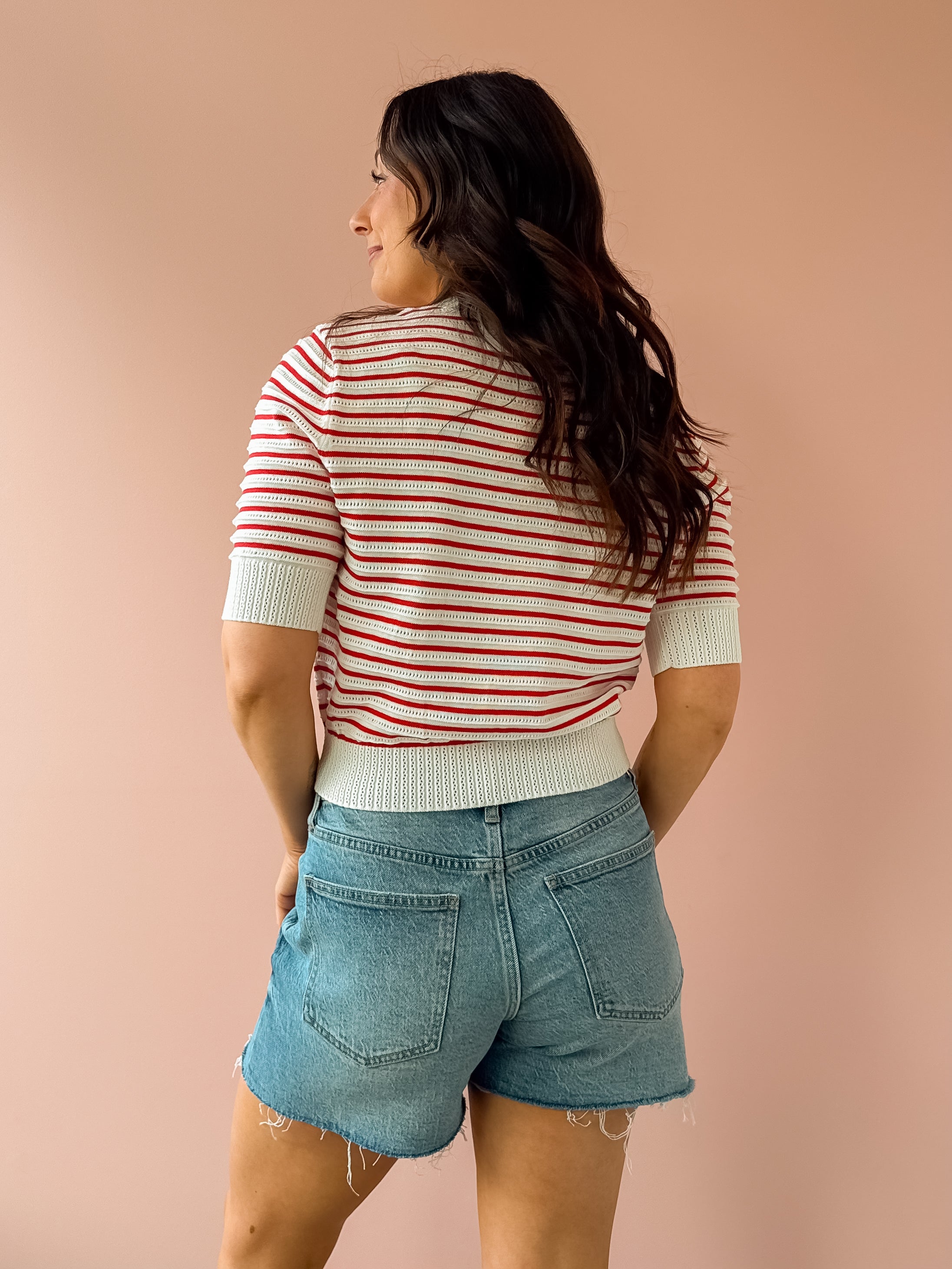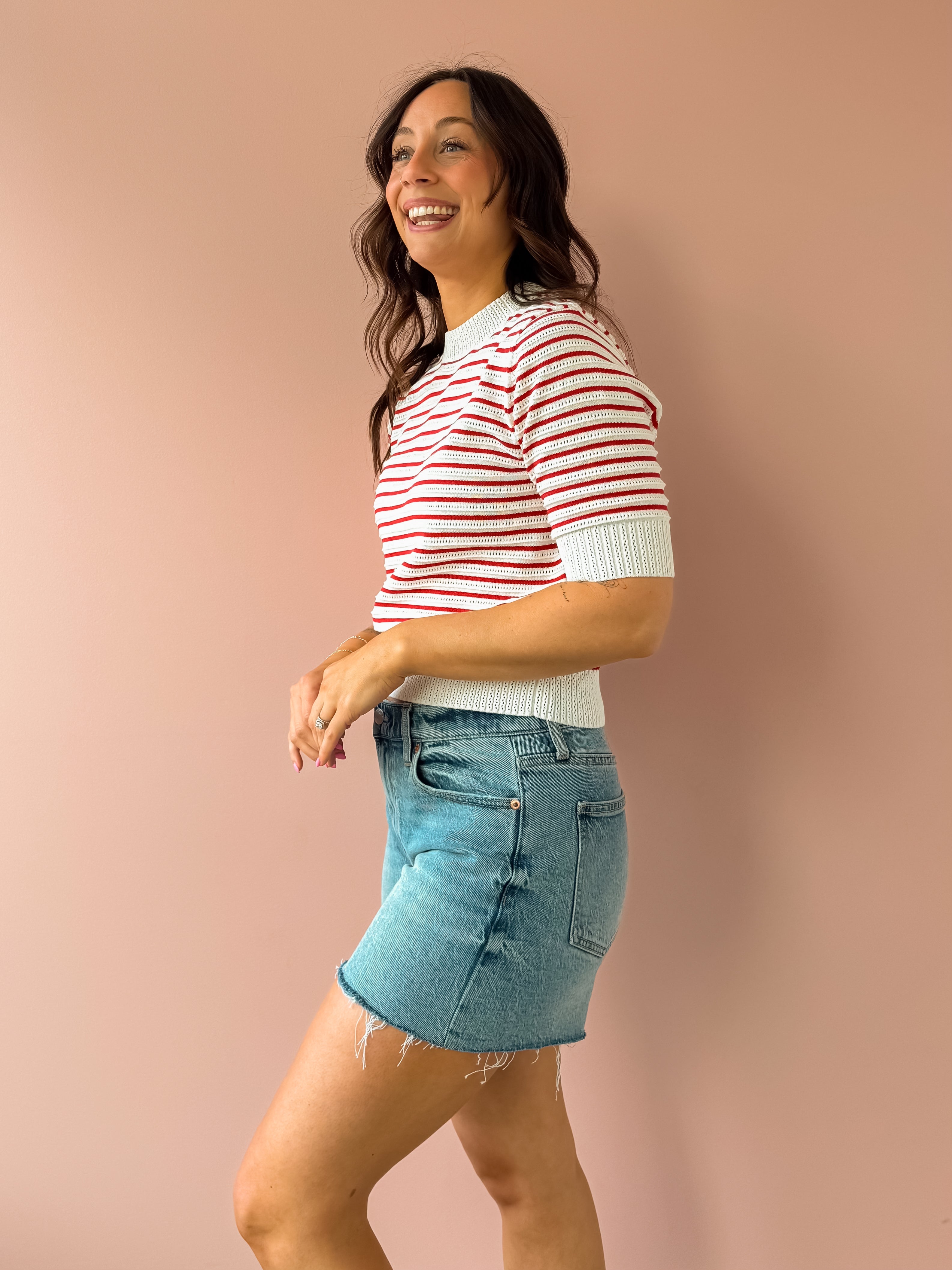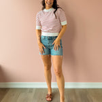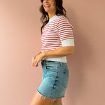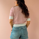 The Elise Top is a refined knit with classic red and white stripes and subtle texture throughout. Designed with a flattering mock neck and ribbed trim at the neckline, cuffs, and hem, it has a polished structure while still feeling comfortable and easy. Style it with high-rise denim and ballet flats for a timeless everyday look!