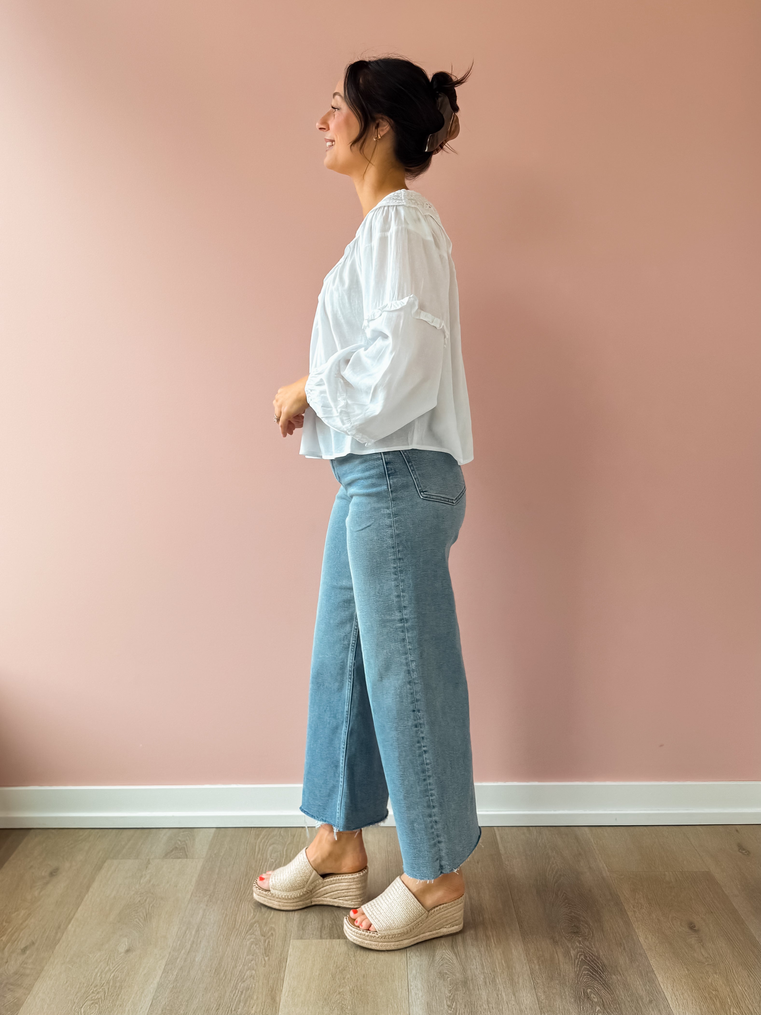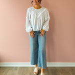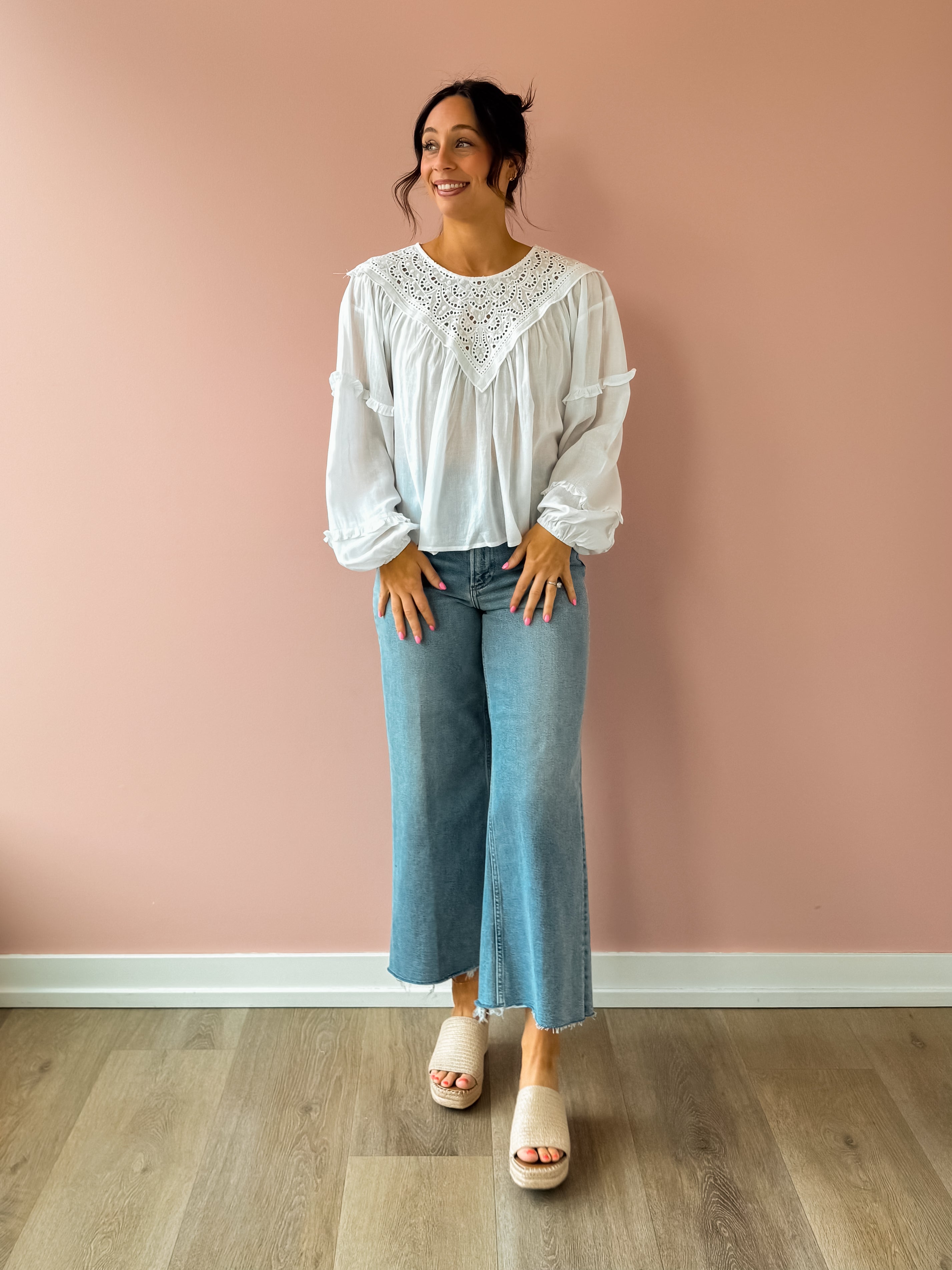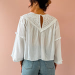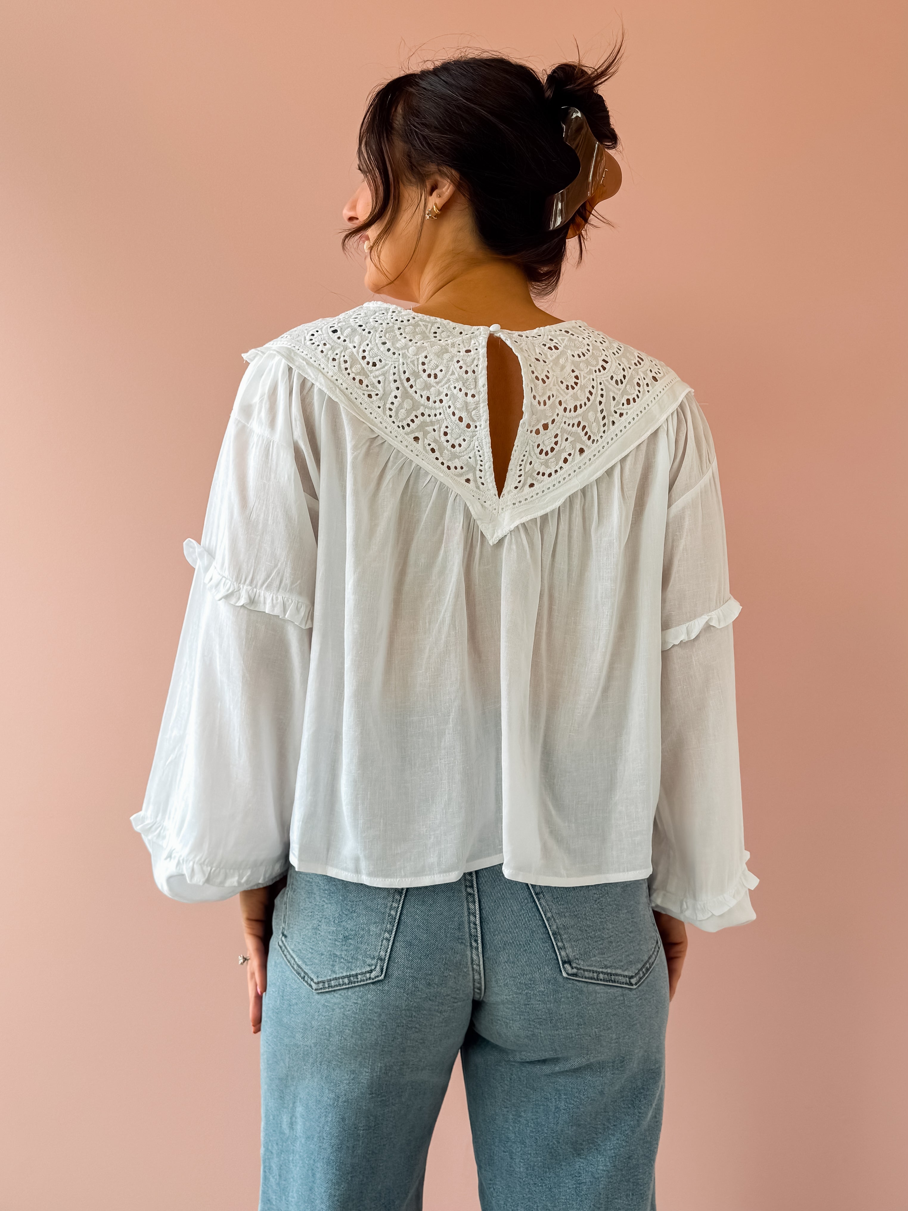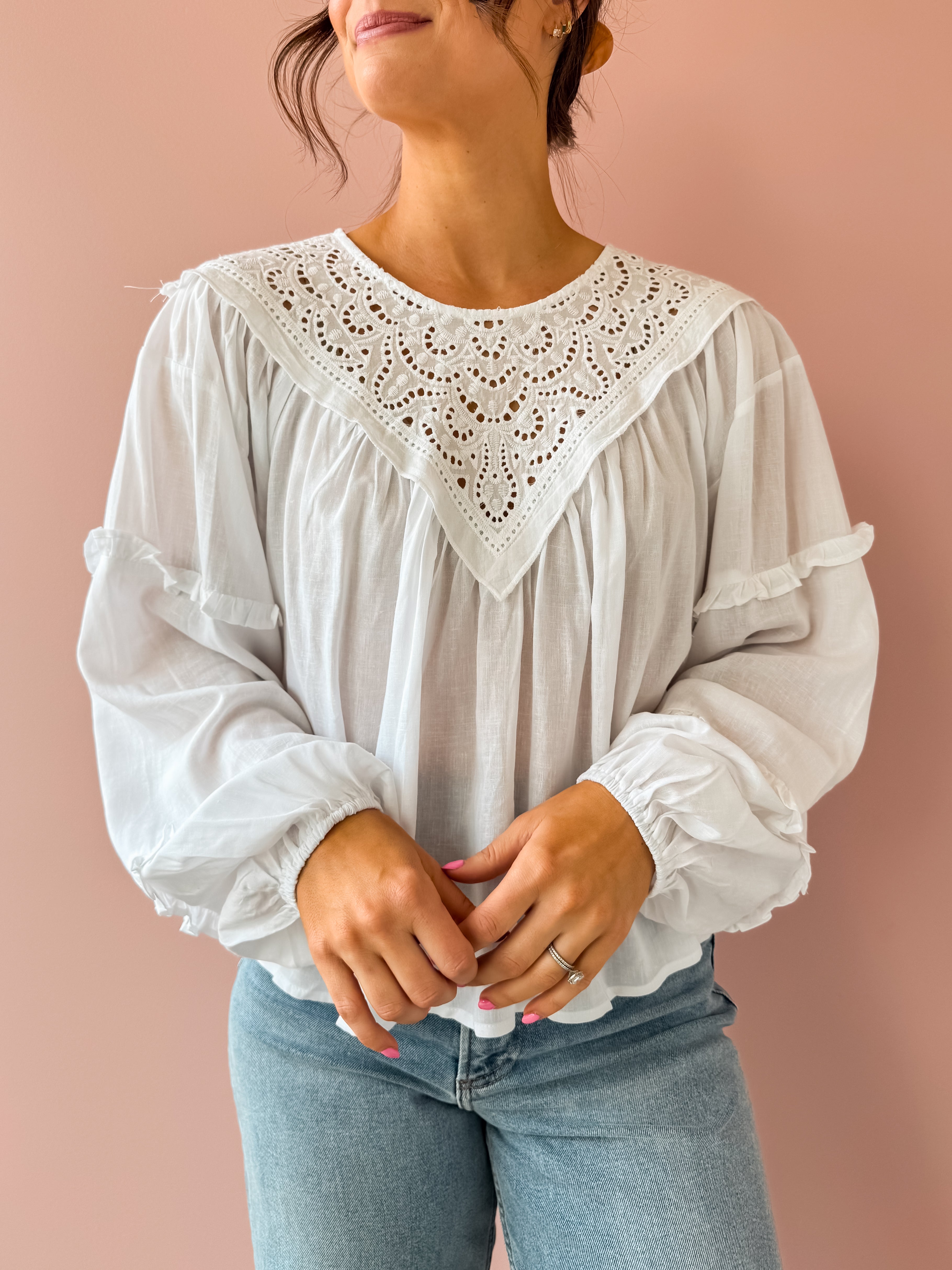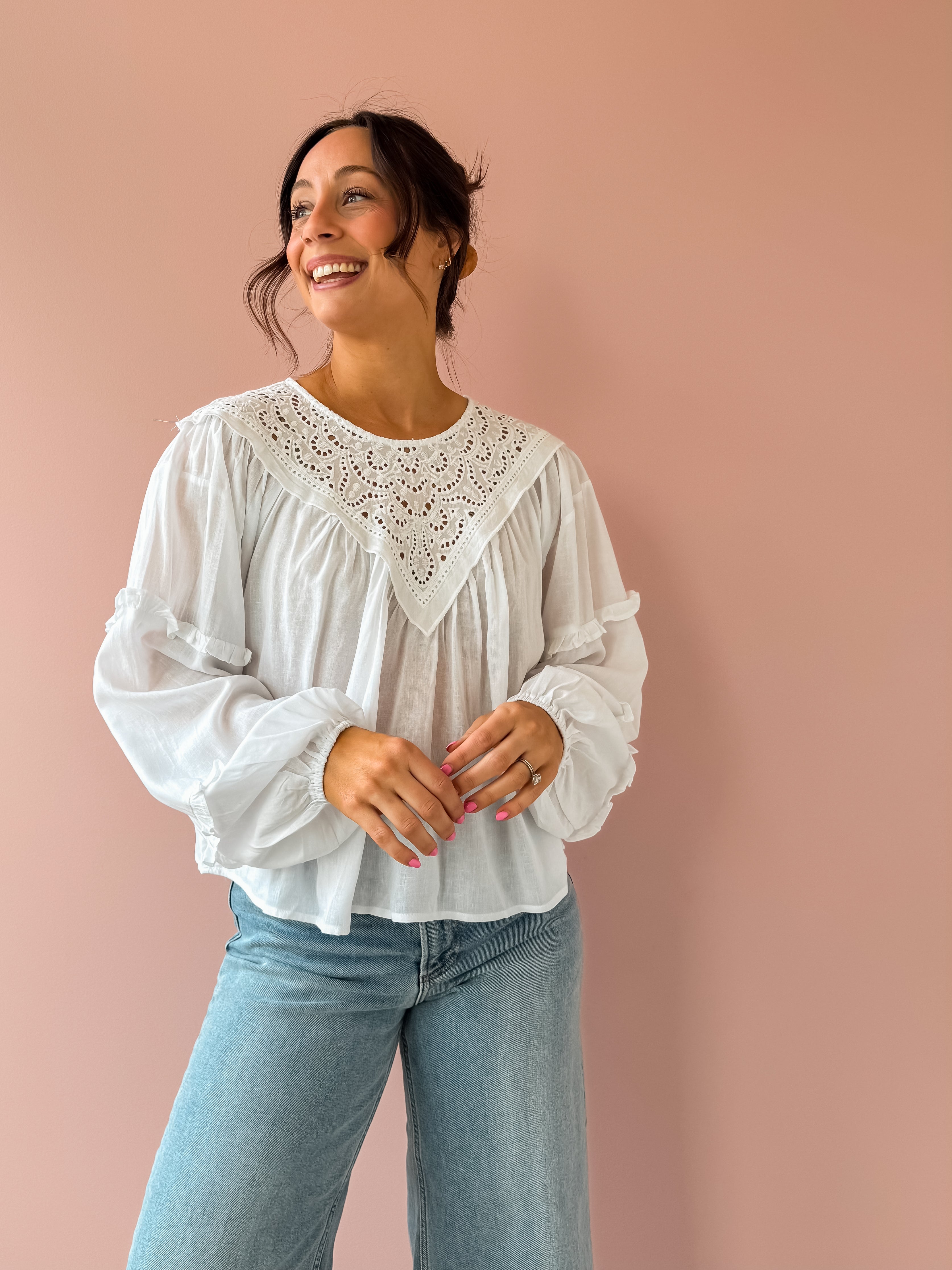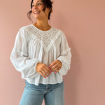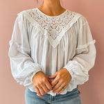 The Linda Top brings effortless elegance to your wardrobe. This white, airy top features delicate lace detailing with a refined high neckline and gracefully flowing hem. Perfect for styling with trousers for a polished work look, or pair it with jeans and sandals for an easy spring aesthetic. Versatile, classy, and undeniably charming.