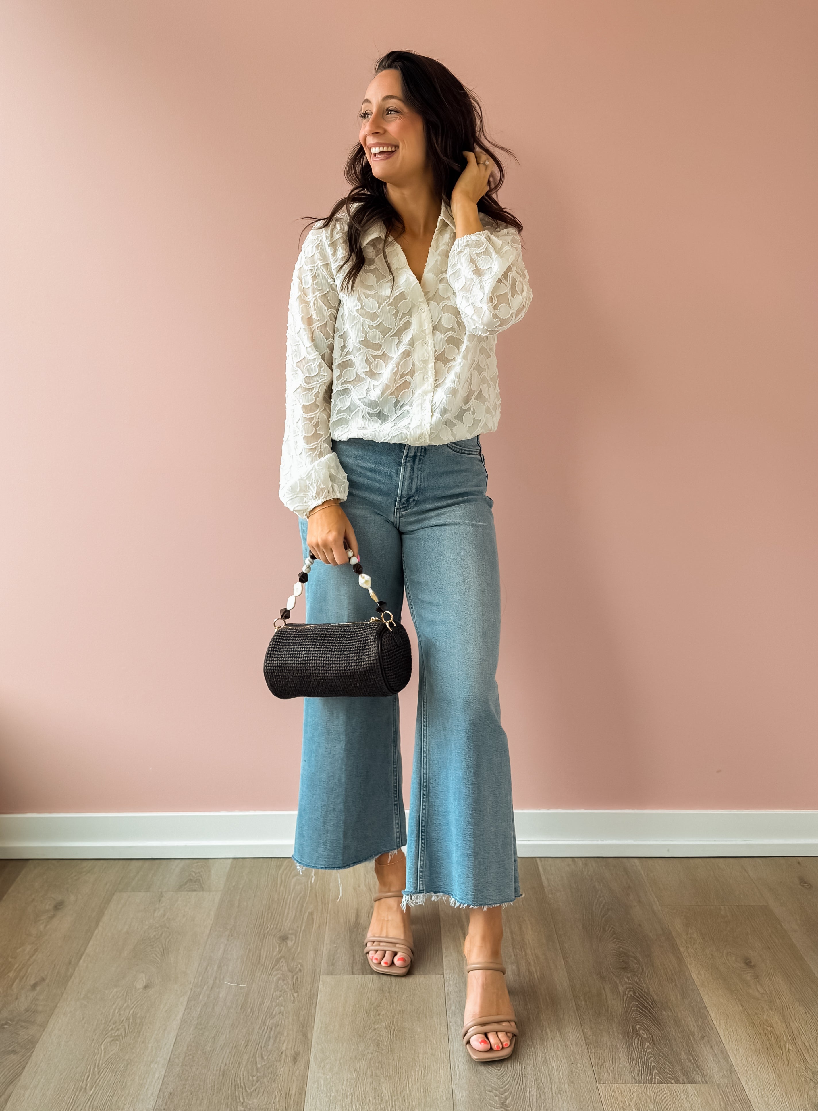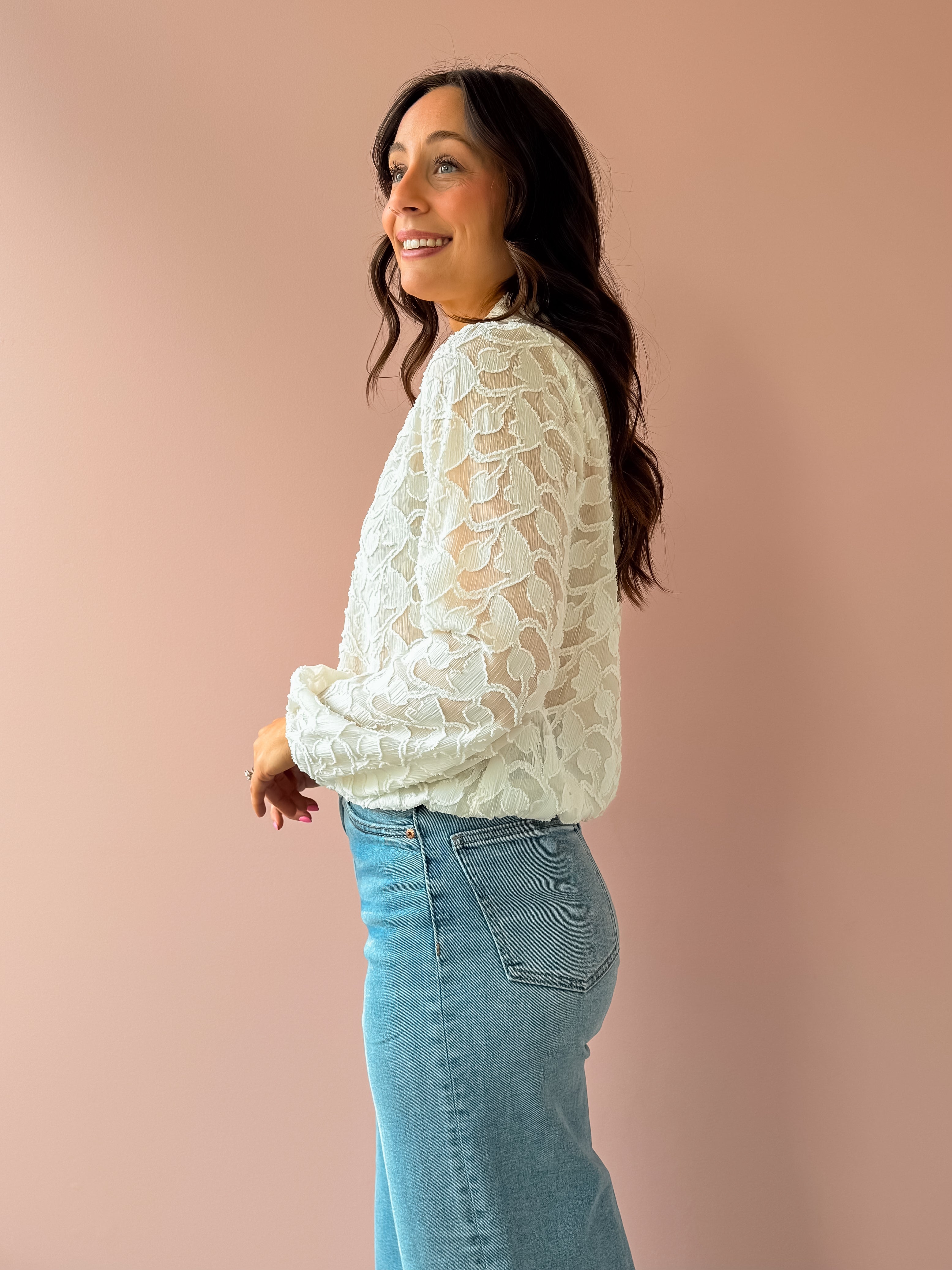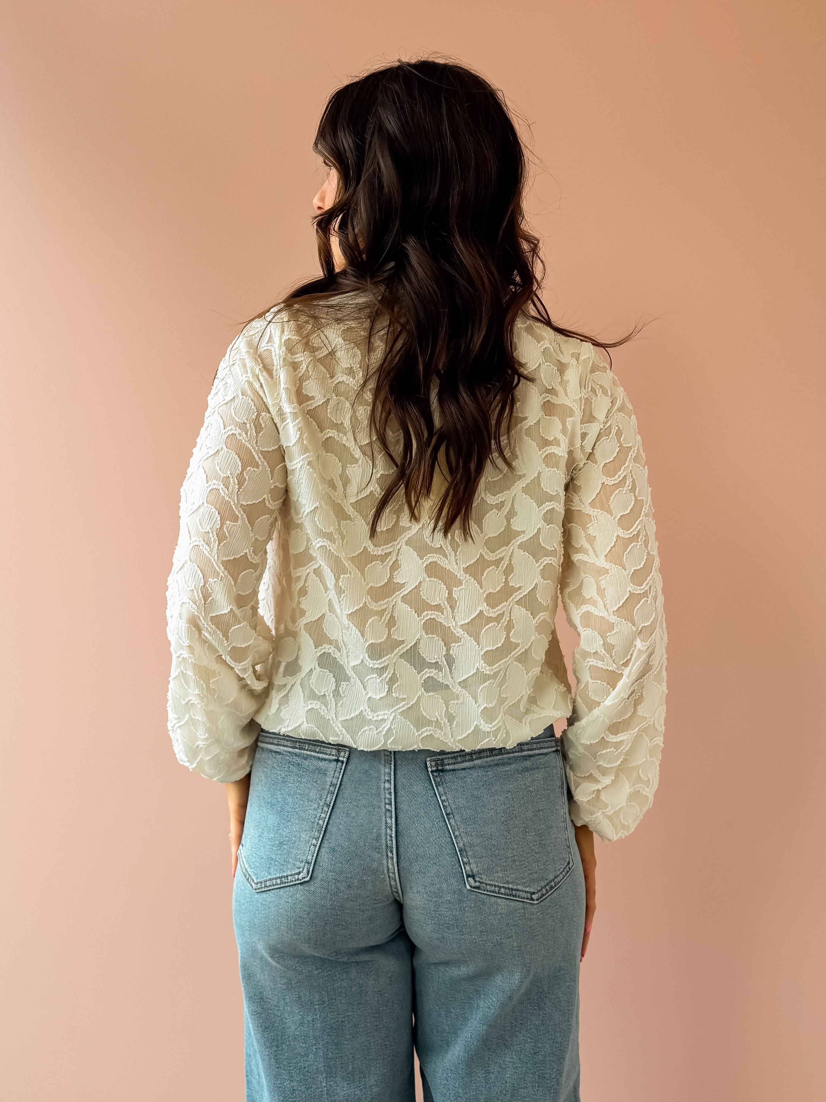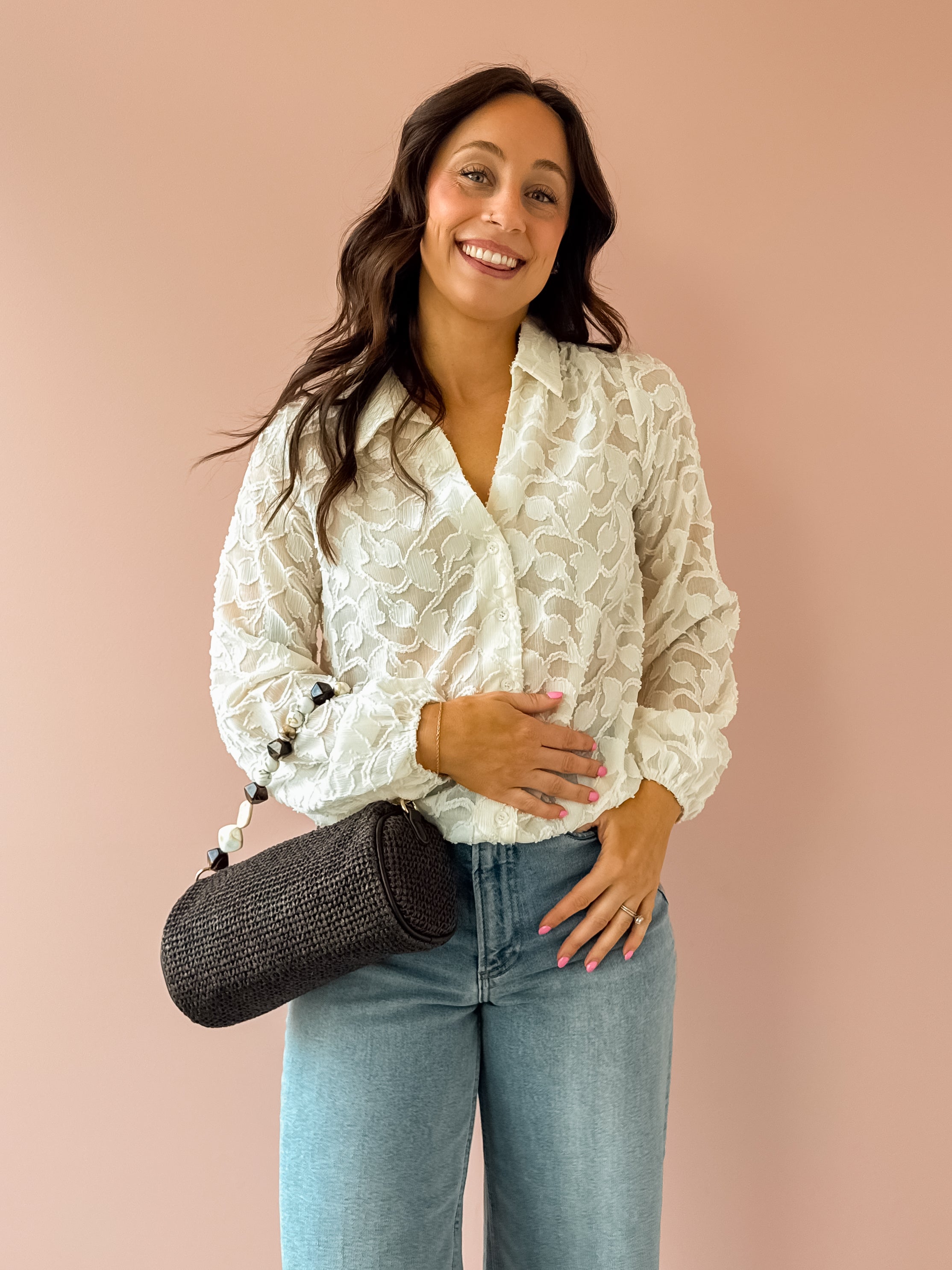 The Amelia Blouse effortlessly transitions from office to evening with its versatile design. Crafted from lightweight, sheer fabric, this collared V-neck blouse features an all-over floral textured pattern and relaxed, flowing silhouette. Pair it with tailored trousers for polished workday style, or dress it down with shorts and flats for a casual date night.