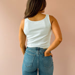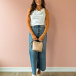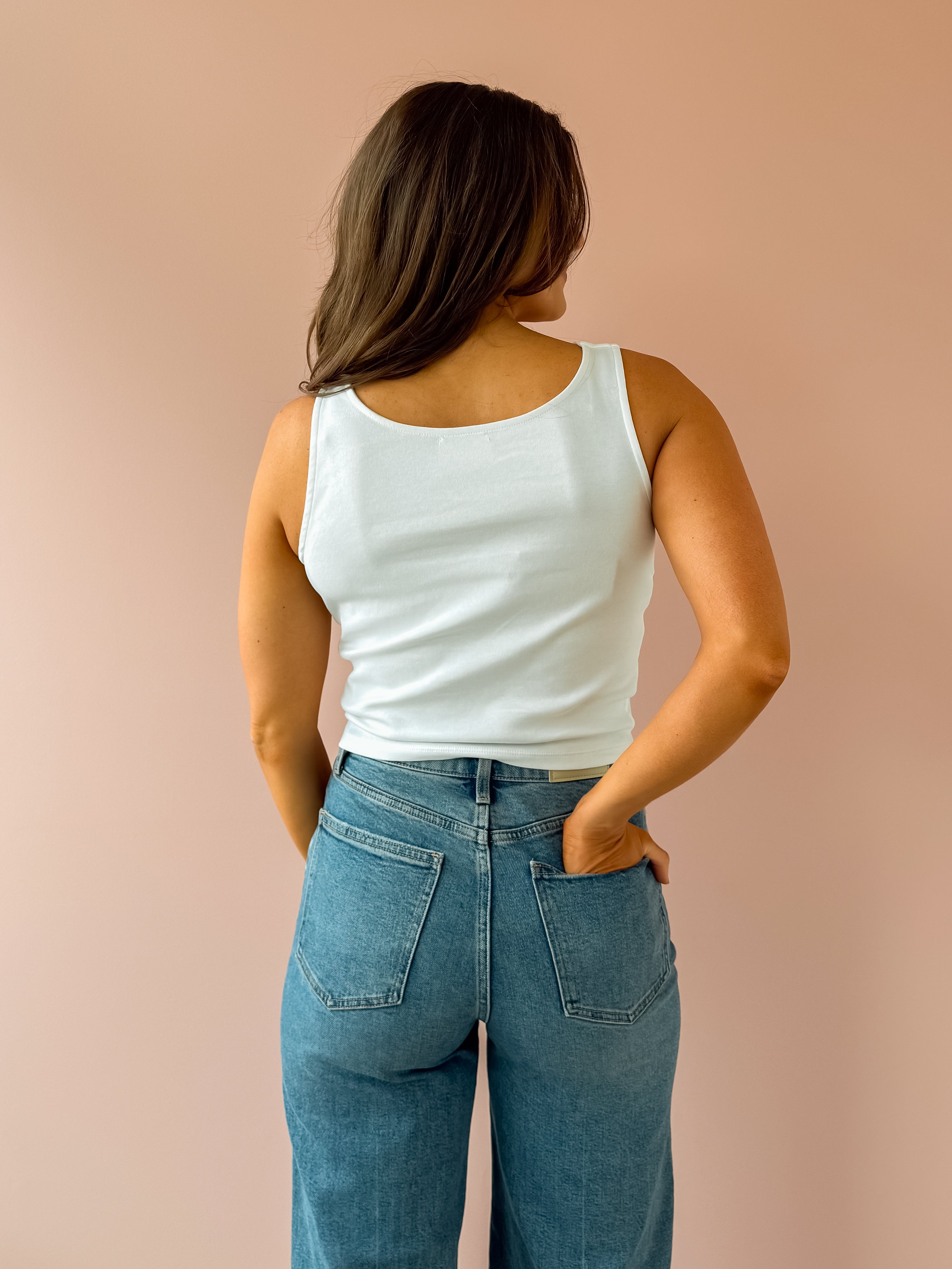 The Bella Top is a crisp white sleeveless essential with an elegantly draped neckline that feminine charm to any outfit. Cut to hit right at the hem, it pairs effortlessly with jeans and flats for a polished, classy look. Perfect for creating versatile everyday styles with timeless appeal.