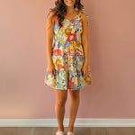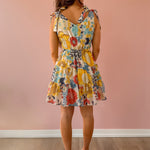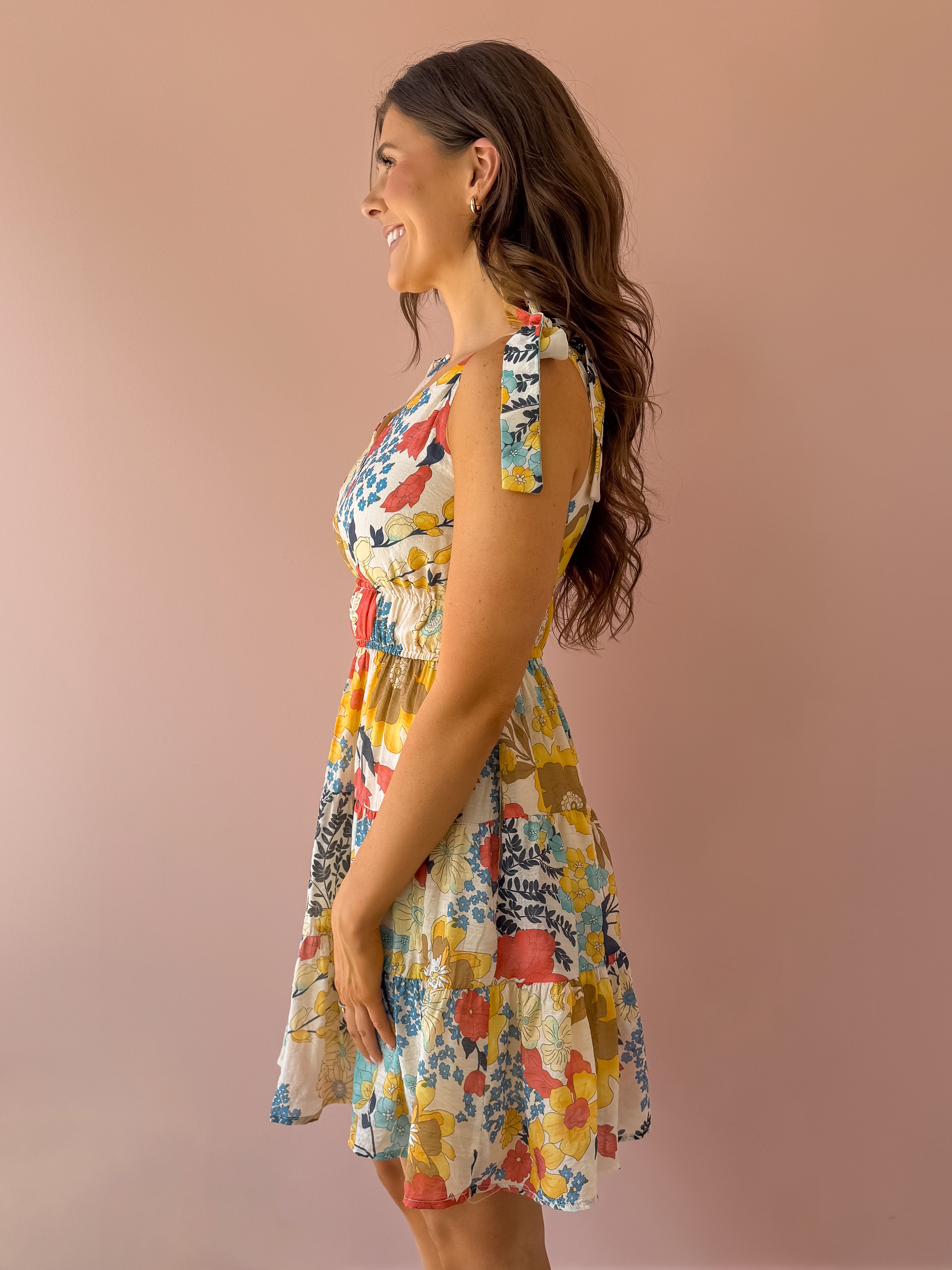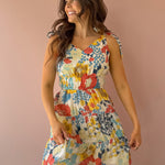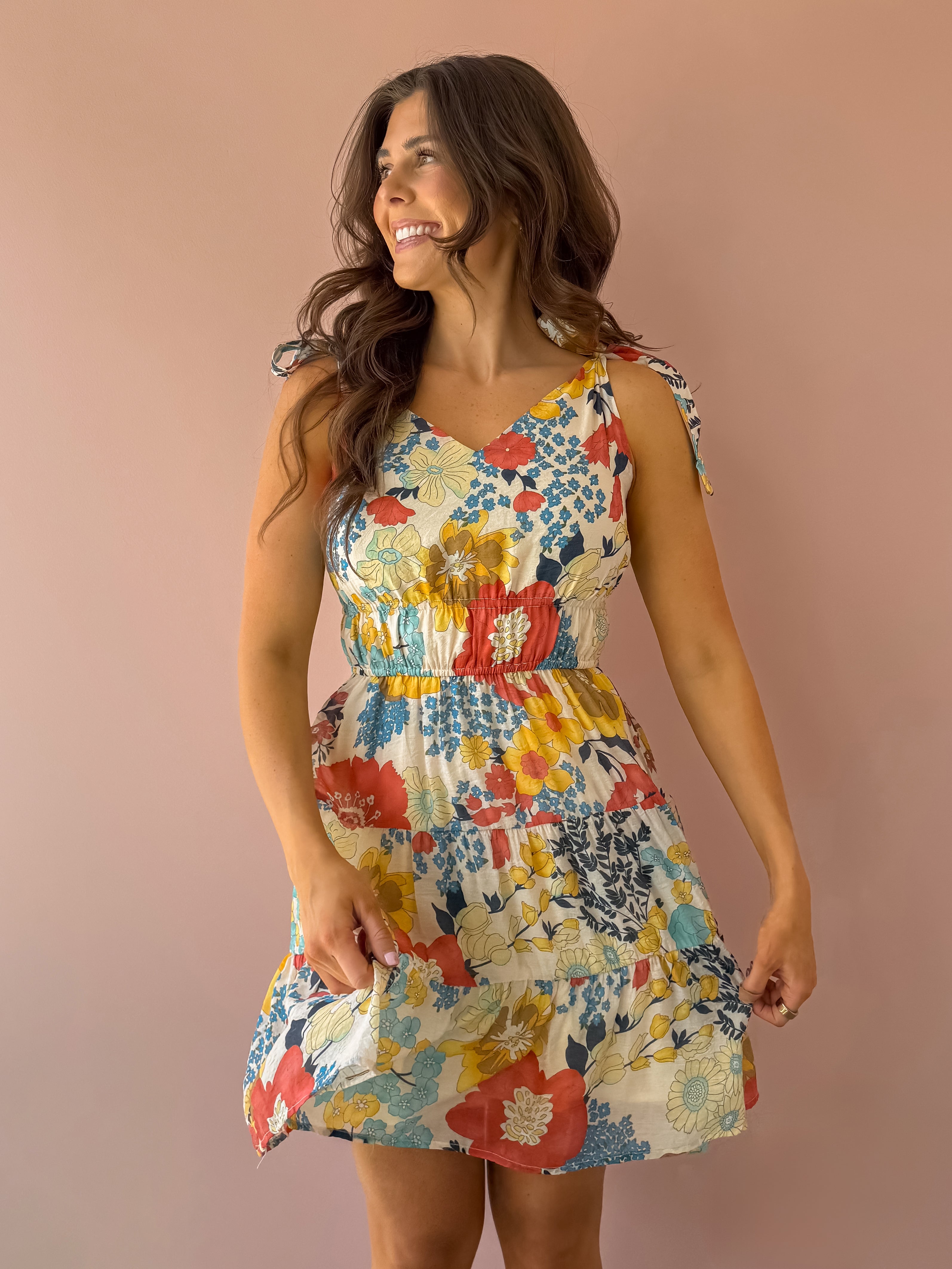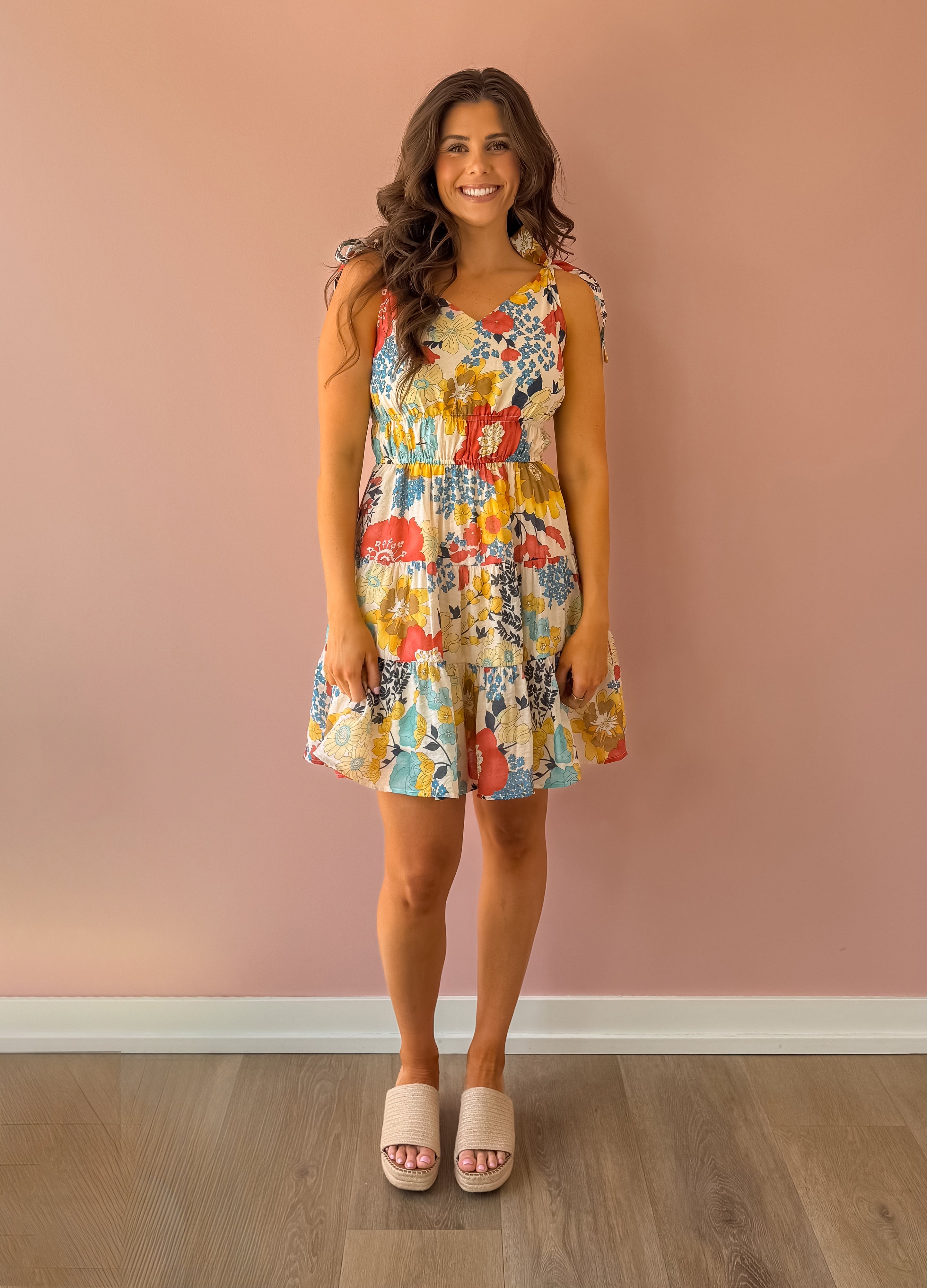 Step into soft, feminine charm with the Jackie Mini Dress. This flirty floral mini features a flattering V-neckline and a sleeveless silhouette, finished with delicate bow tie details at the shoulders. Designed in a a colorful floral palette, it’s cinched at the waist to create a beautifully defined shape. Easy and romantic, it’s perfect for with a wedge or sandal.
