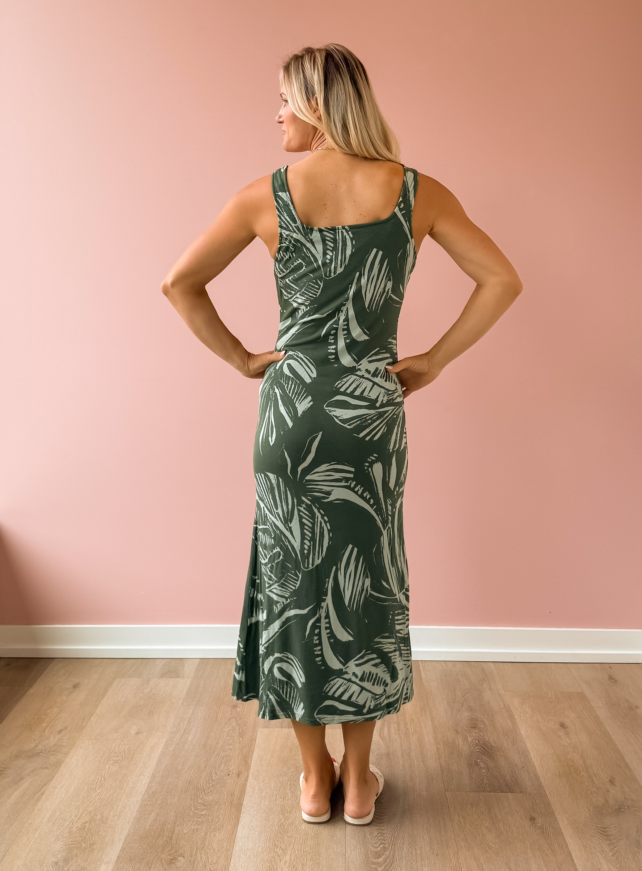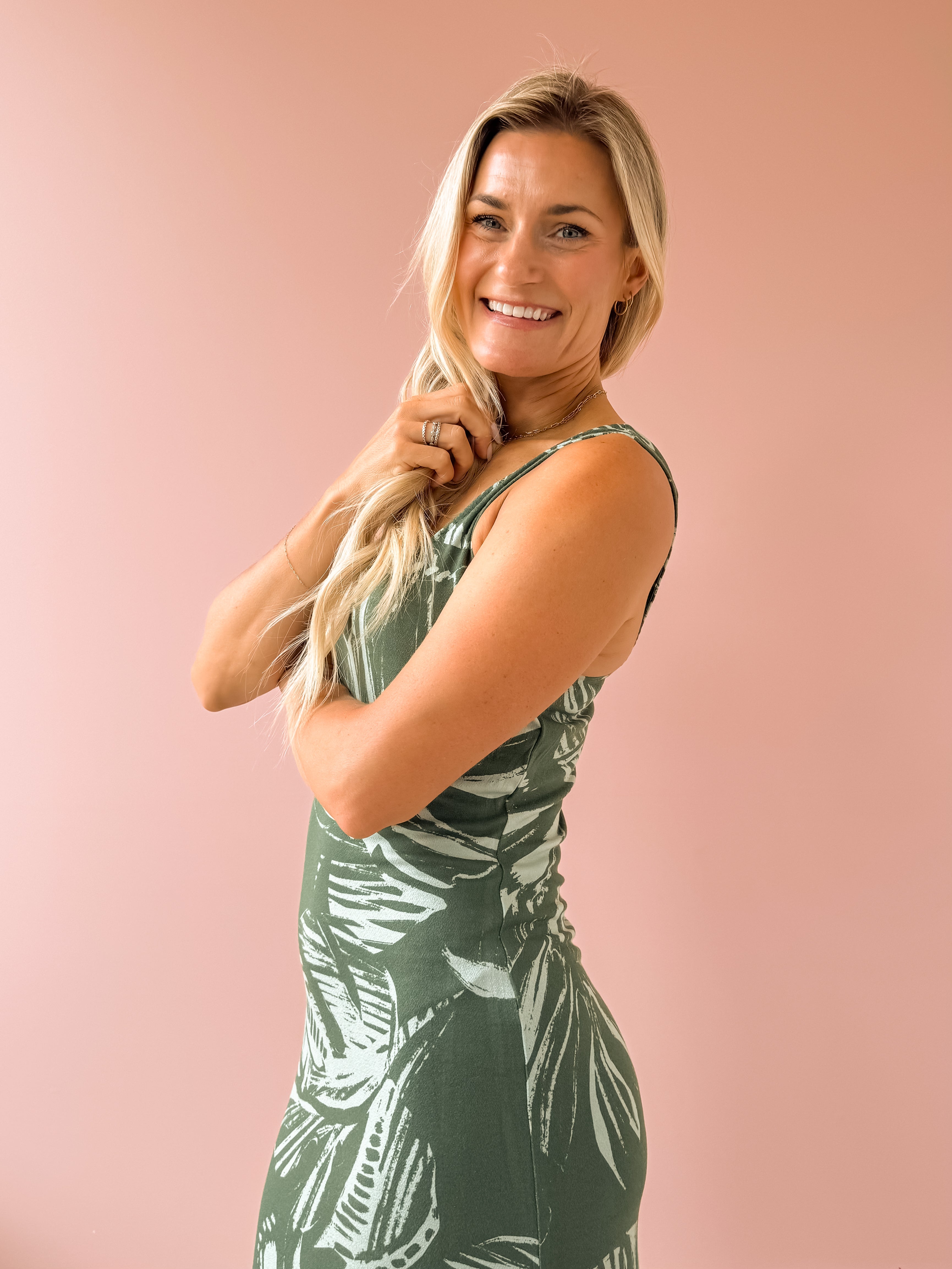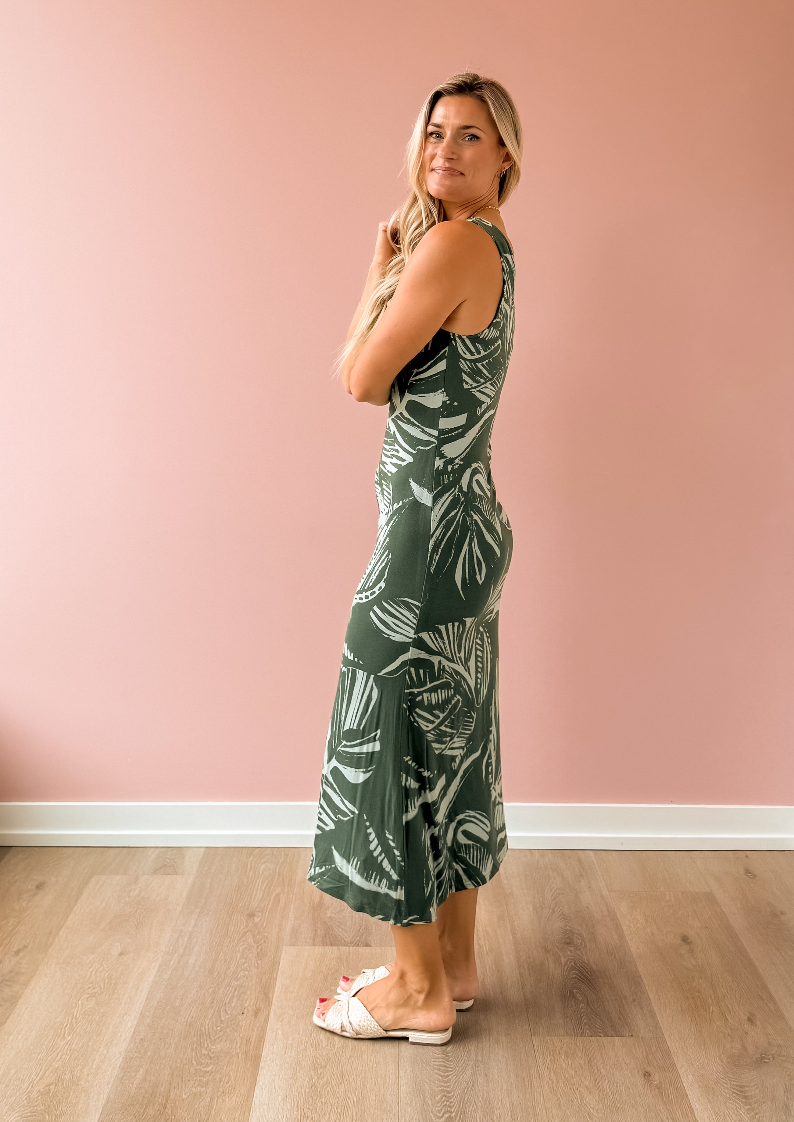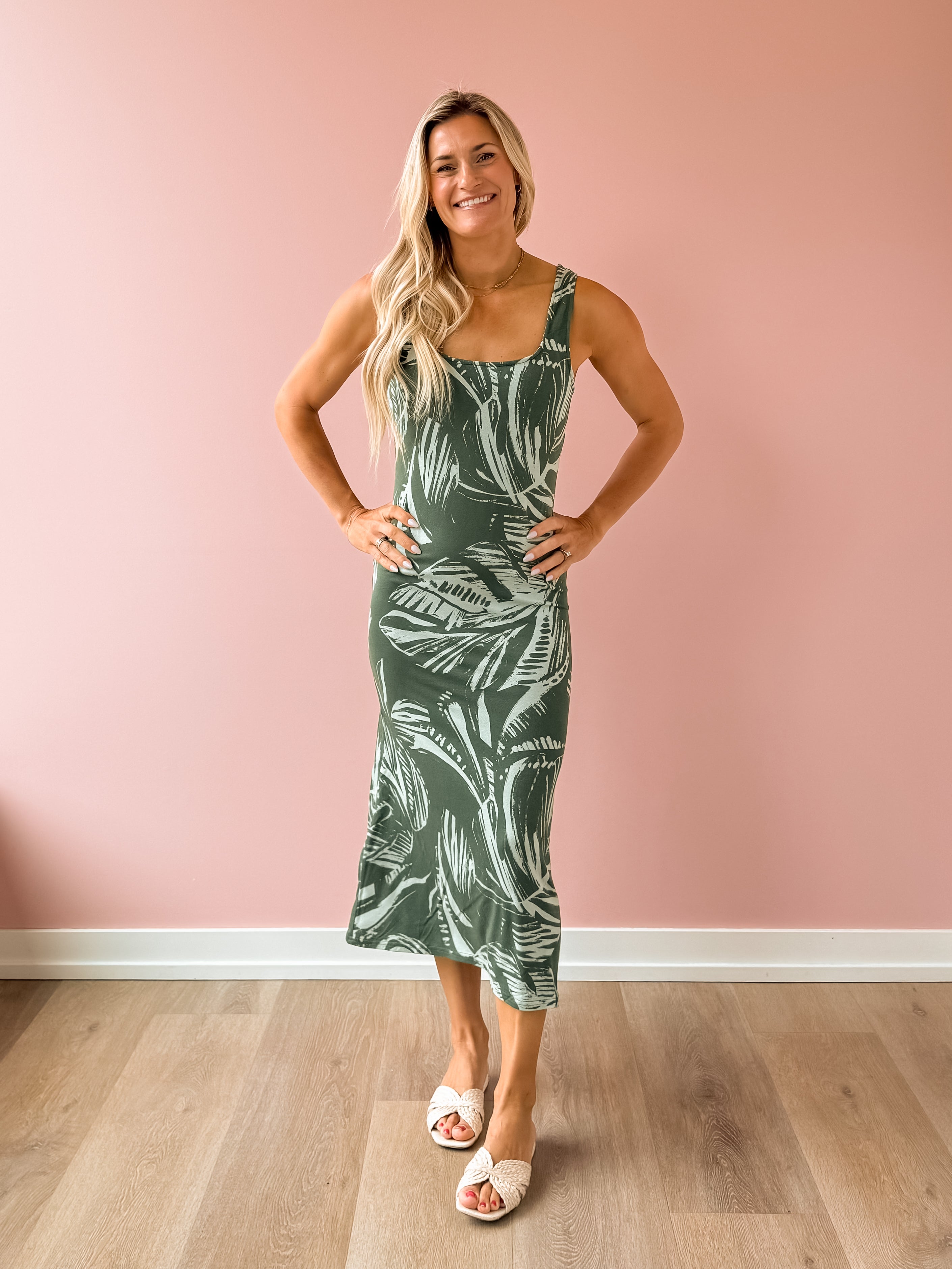 Turn heads in the Prosper Midi Dress—your new go-to for sun-soaked days and balmy nights. In a lush summer green with soft olive tones, this body-skimming silhouette flatters with its scoop neckline, thick straps, and allover palm leaf print for a bold yet effortless vibe. The lightweight, stretchy fabric moves with you while keeping things cool and comfortable. Style it with slides, gold hoops, and a woven bag for a tropical-chic look.