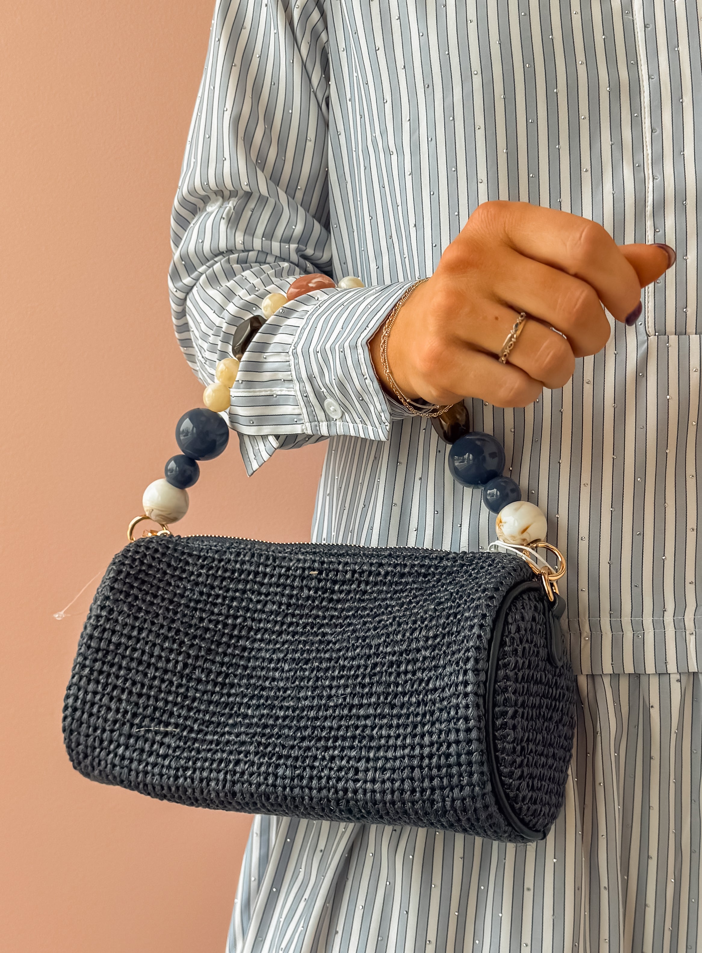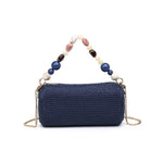 This sculptural barrel clutch makes a statement with its beaded handle and textured woven exterior. The compact zip-top design fits your phone, cards, and essentials, while the detachable chain strap converts to crossbody mode for hands-free carrying. Polished hardware and faceted beads add eye-catching detail that transitions seamlessly from evening events to daytime adventures. Versatile, chic, and ready for anything.
