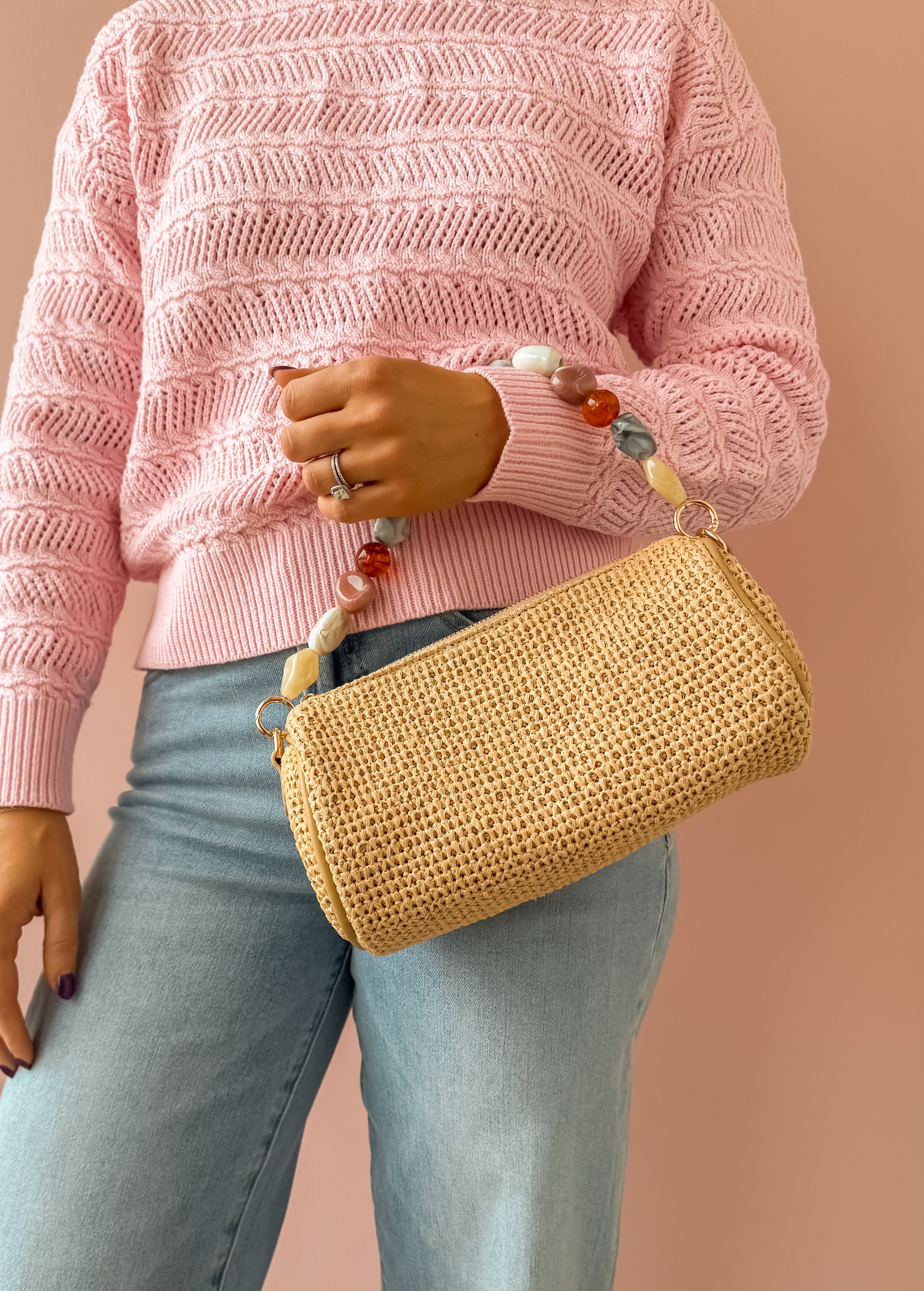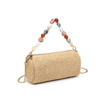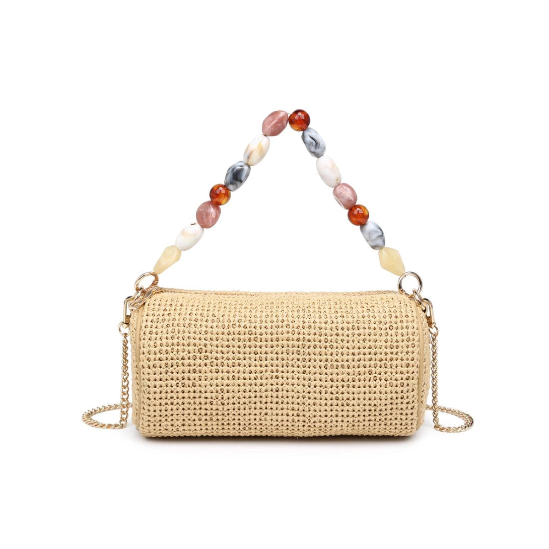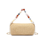 This sculptural barrel clutch makes a statement with its beaded handle and textured woven exterior. The compact zip-top design fits your phone, cards, and essentials, while the detachable chain strap converts to crossbody mode for hands-free carrying. Polished hardware and faceted beads add eye-catching detail that transitions seamlessly from evening events to daytime adventures. Versatile, chic, and ready for anything.
