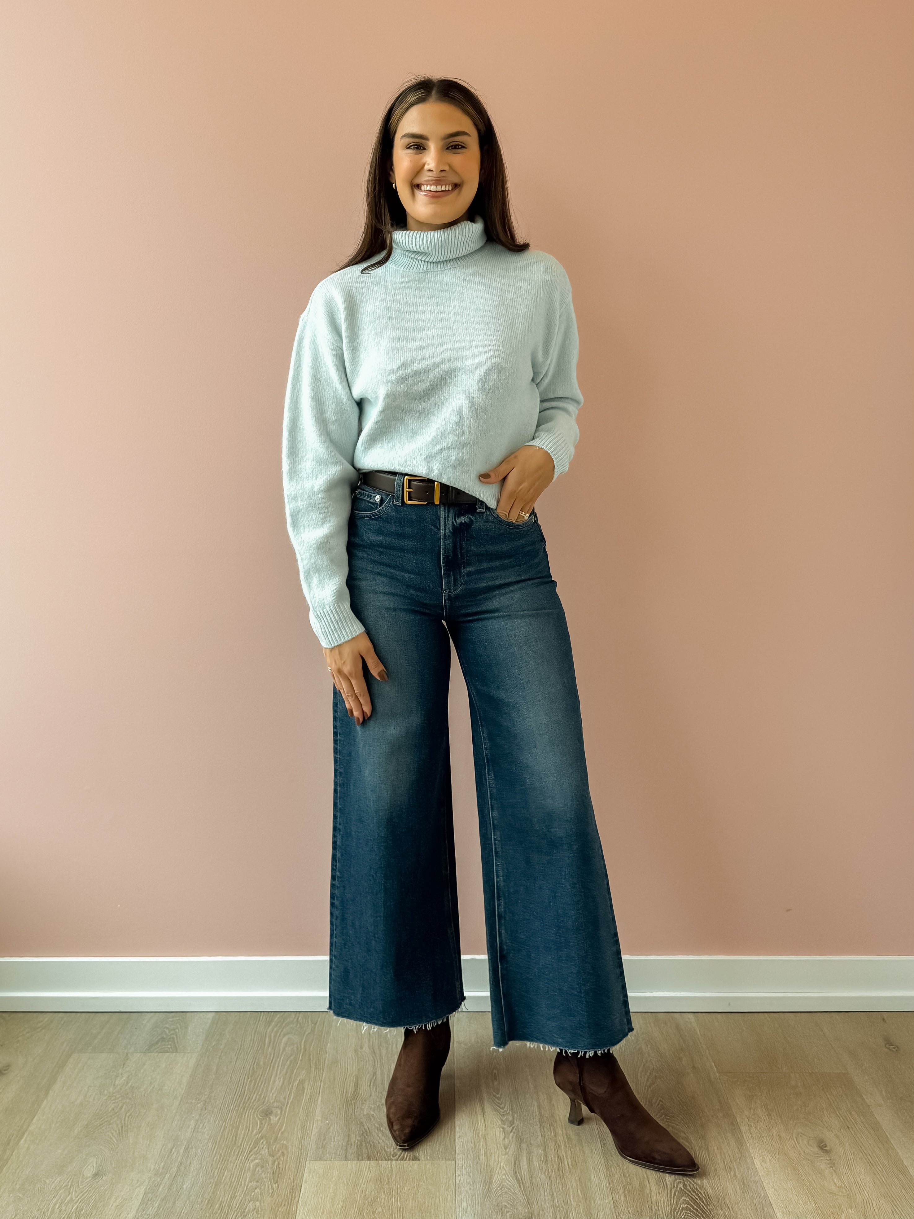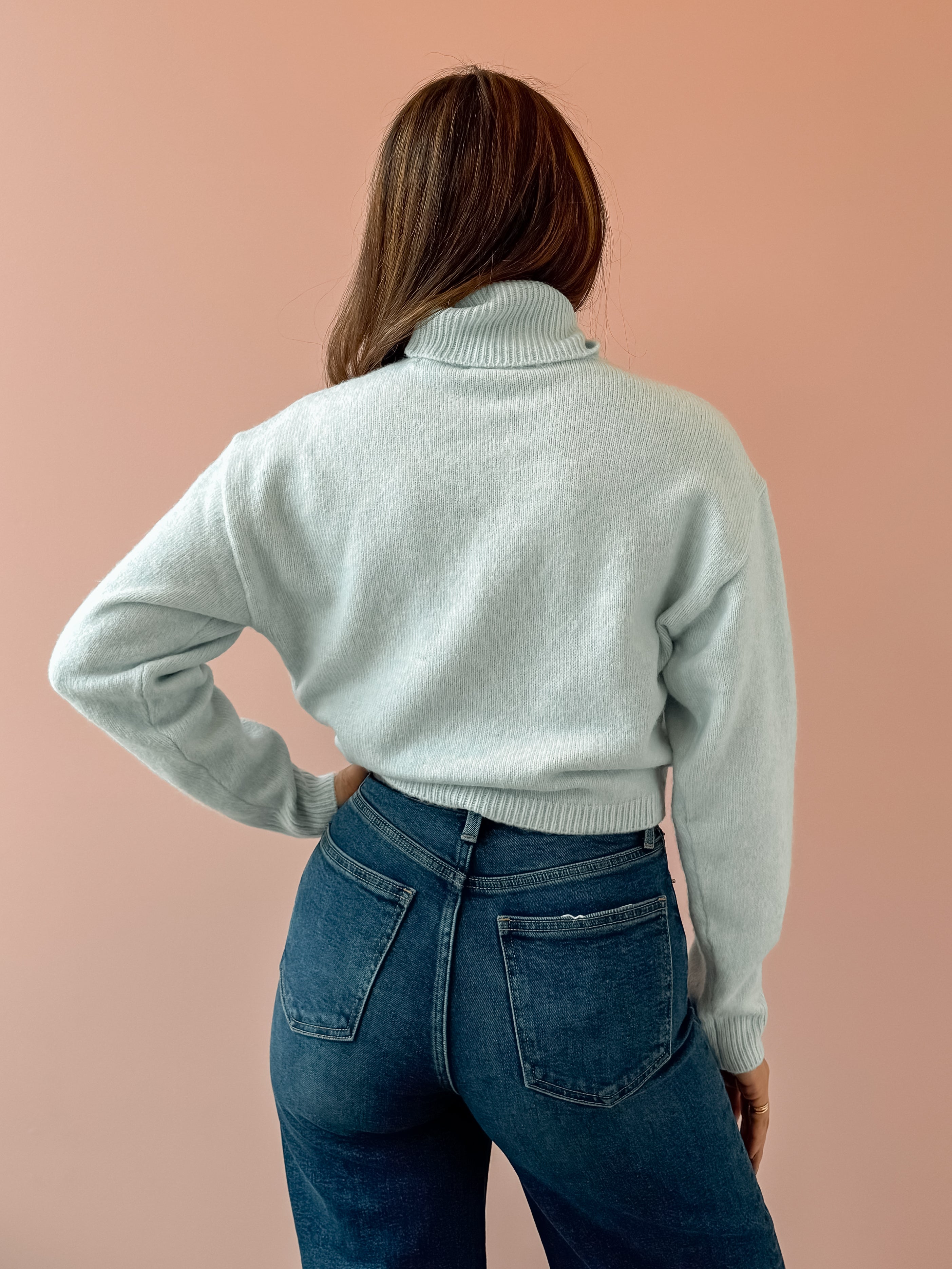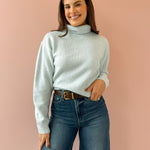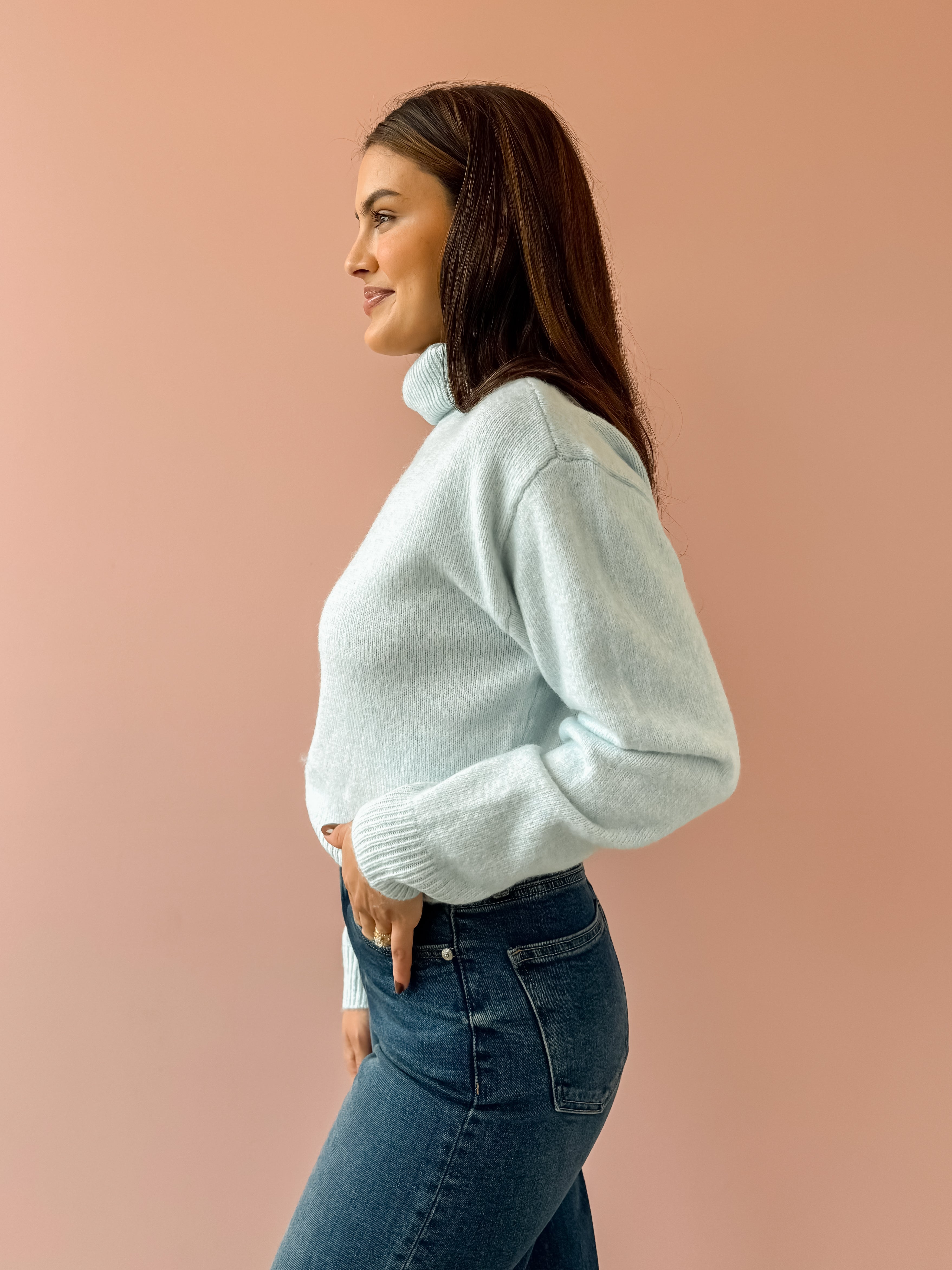 Meet the Raegann Sweater—a powder blue knit designed to bring effortless style to your everyday wardrobe. Its flattering cropped fit and cozy turtleneck blend modern charm with timeless comfort. Pair it with denim and your go-to boots for an easy, put-together look that feels confident, feminine, and perfectly on-trend.