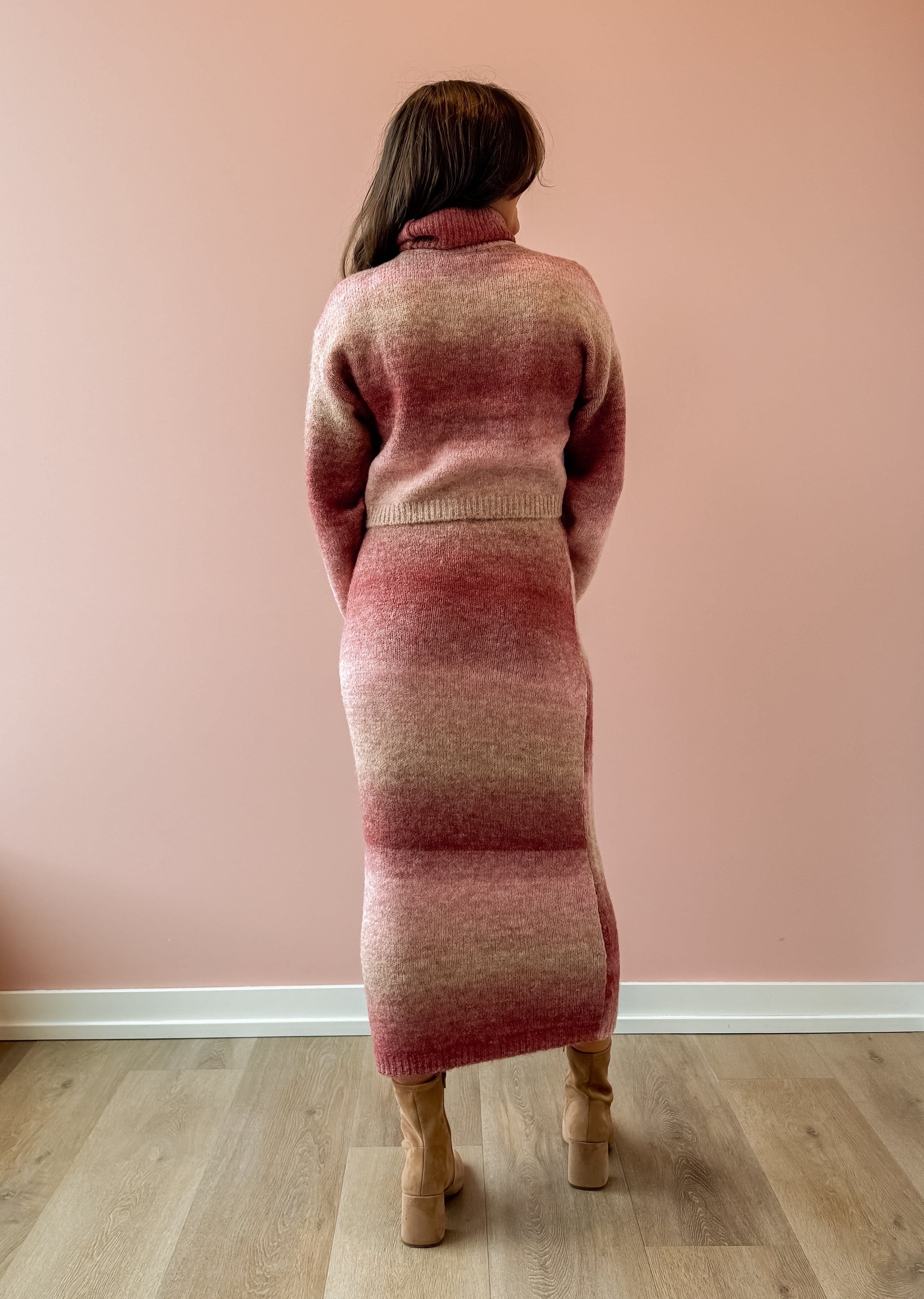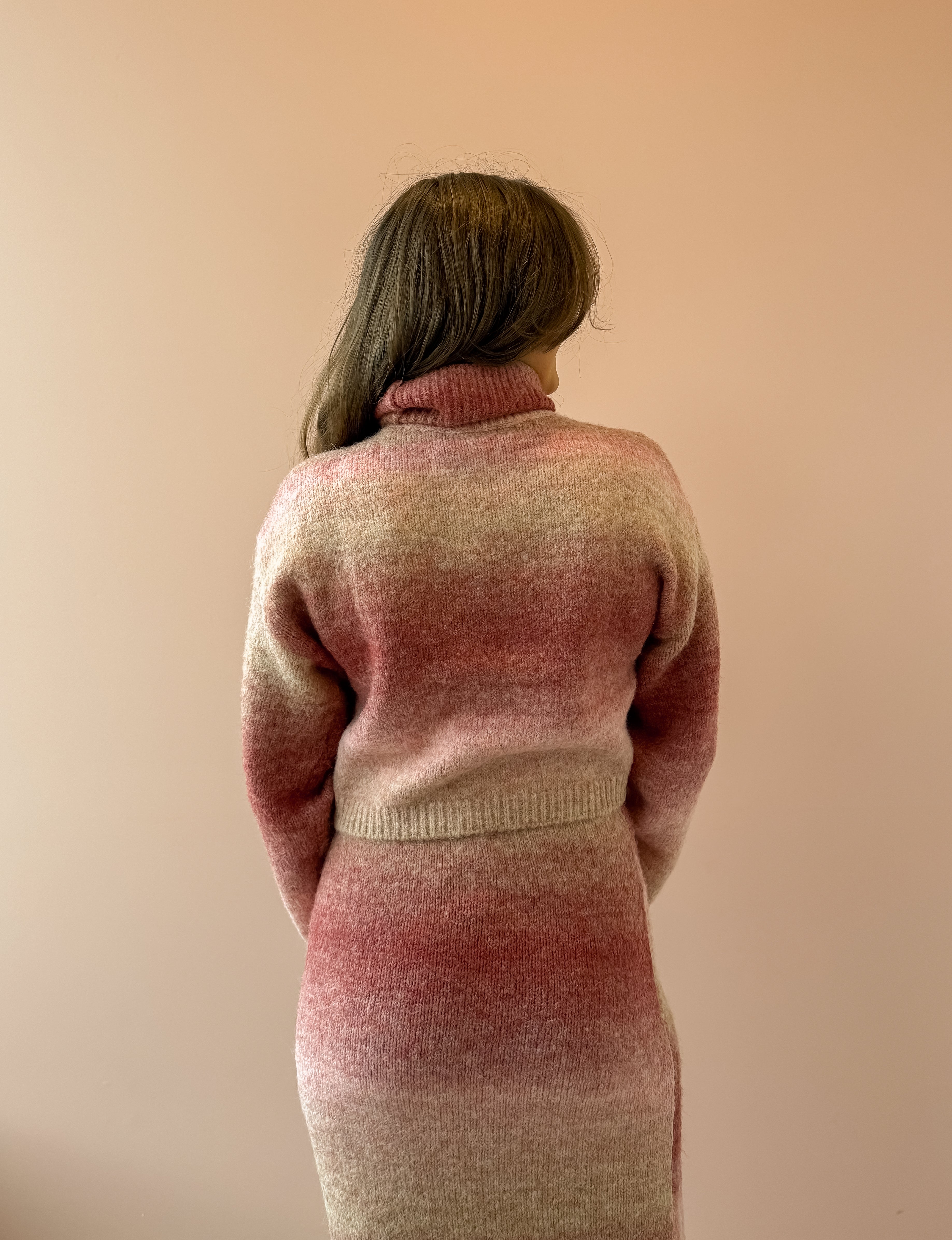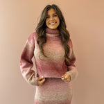 Meet the Raegann Sweater—a gorgeous pink ombre knit designed to bring effortless style to your everyday wardrobe. Its flattering cropped fit and cozy turtleneck blend modern charm with timeless comfort. Pair it with our Karmen Midi Skirt and your go-to boots for an easy, put-together look that feels confident, feminine, and perfectly on-trend.