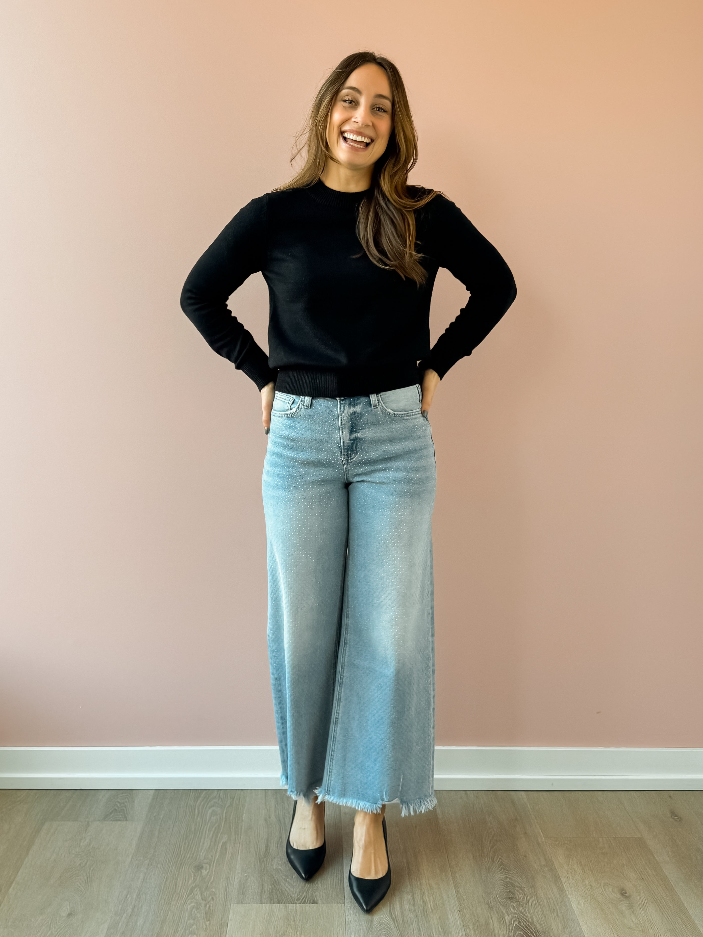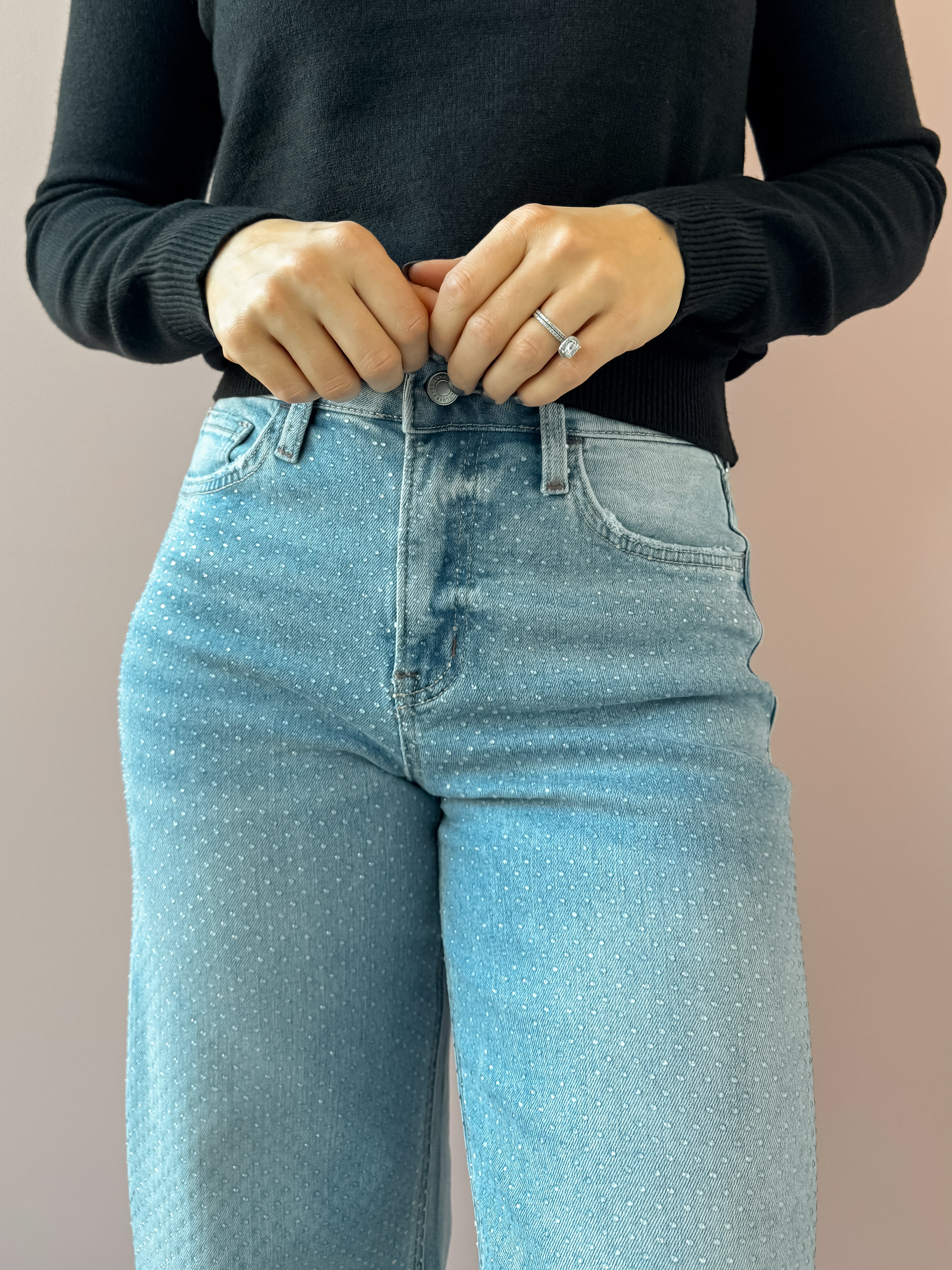 Step into sparkle with the Ray Rhinestone Jeans! These wide-leg, ankle-length jeans feature eye-catching rhinestone details that add just the right touch of glam. Perfect for festive gatherings or a fun night out, they effortlessly elevate your look. Pair them with heels for a chic vibe or keep it cool with a tee and sneakers for playful everyday style. Your new favorite jeans that shine as much as you do!