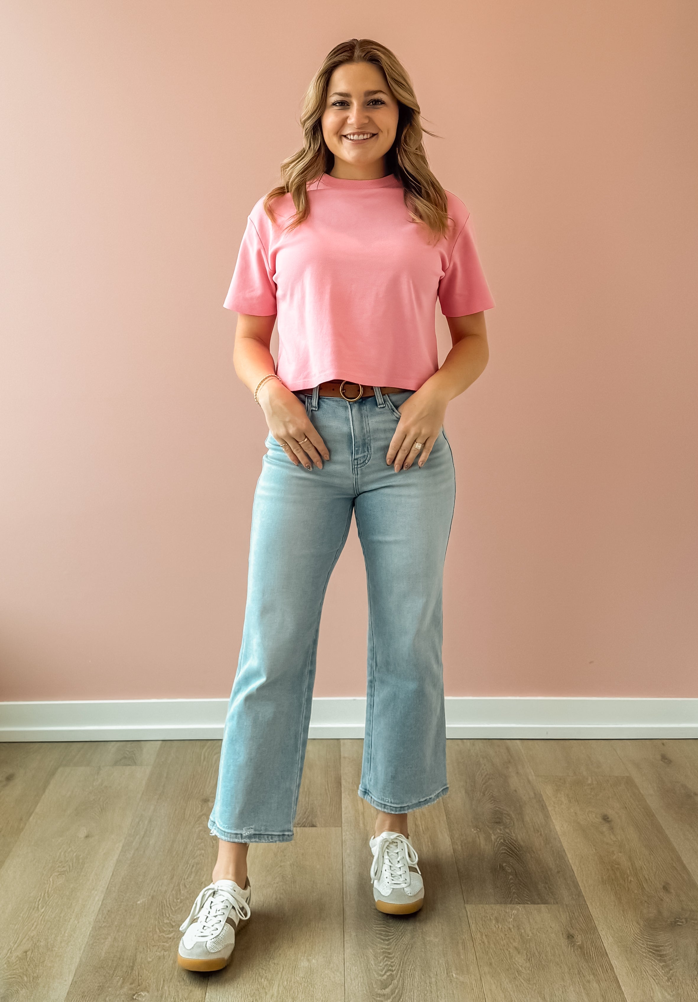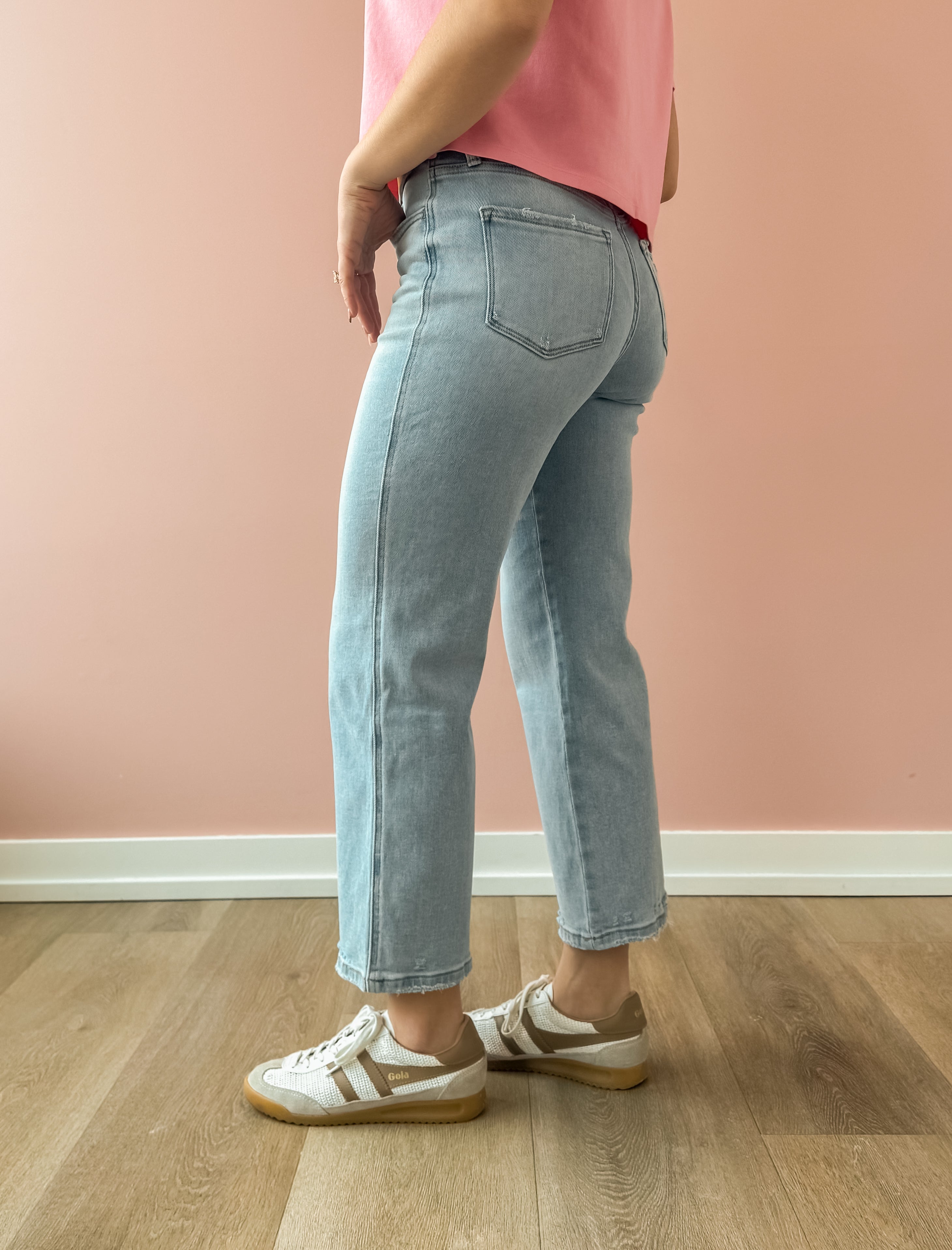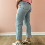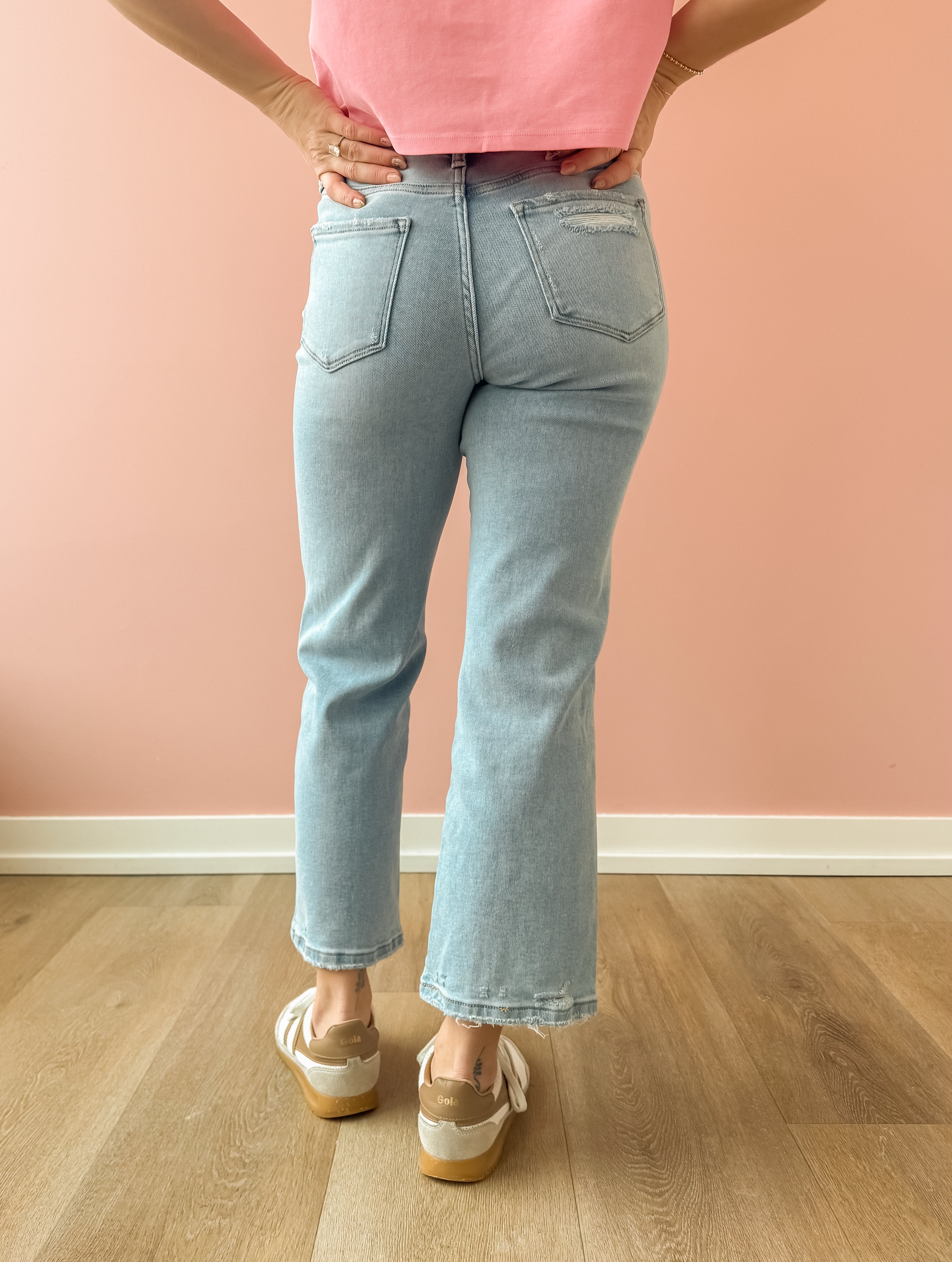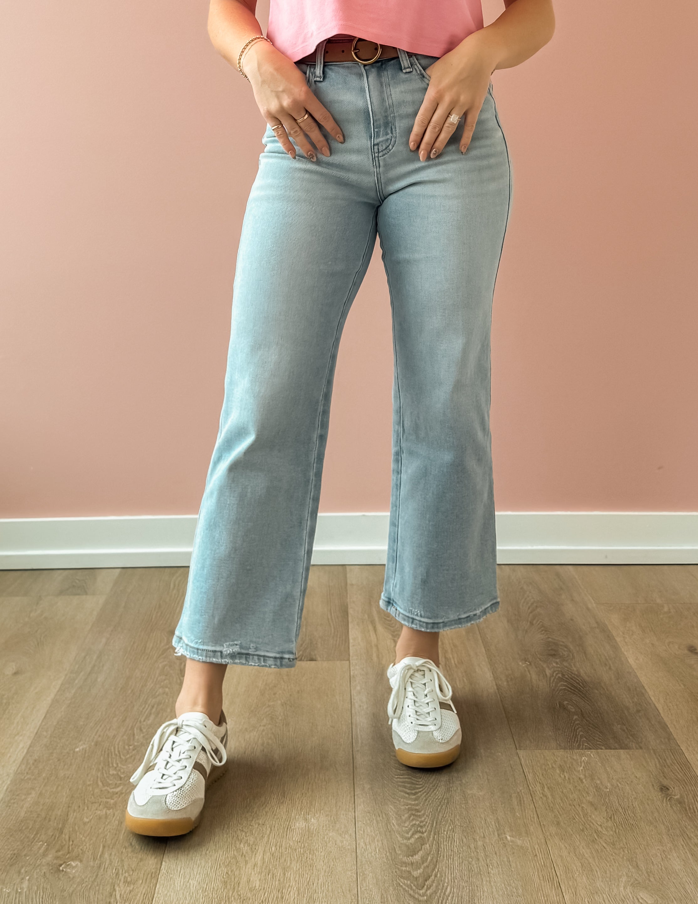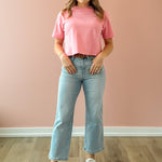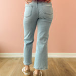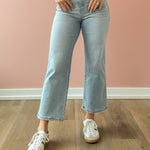 The Reverent High Rise Crop Jeans blend comfort and edge seamlessly. Crafted from stretch denim, they shape your figure with a high rise waist while offering flexibility throughout the day. Featuring a light wash in a slimmer wide leg crop cut and stylish distressed details, these jeans deliver a modern, worn-in vibe.