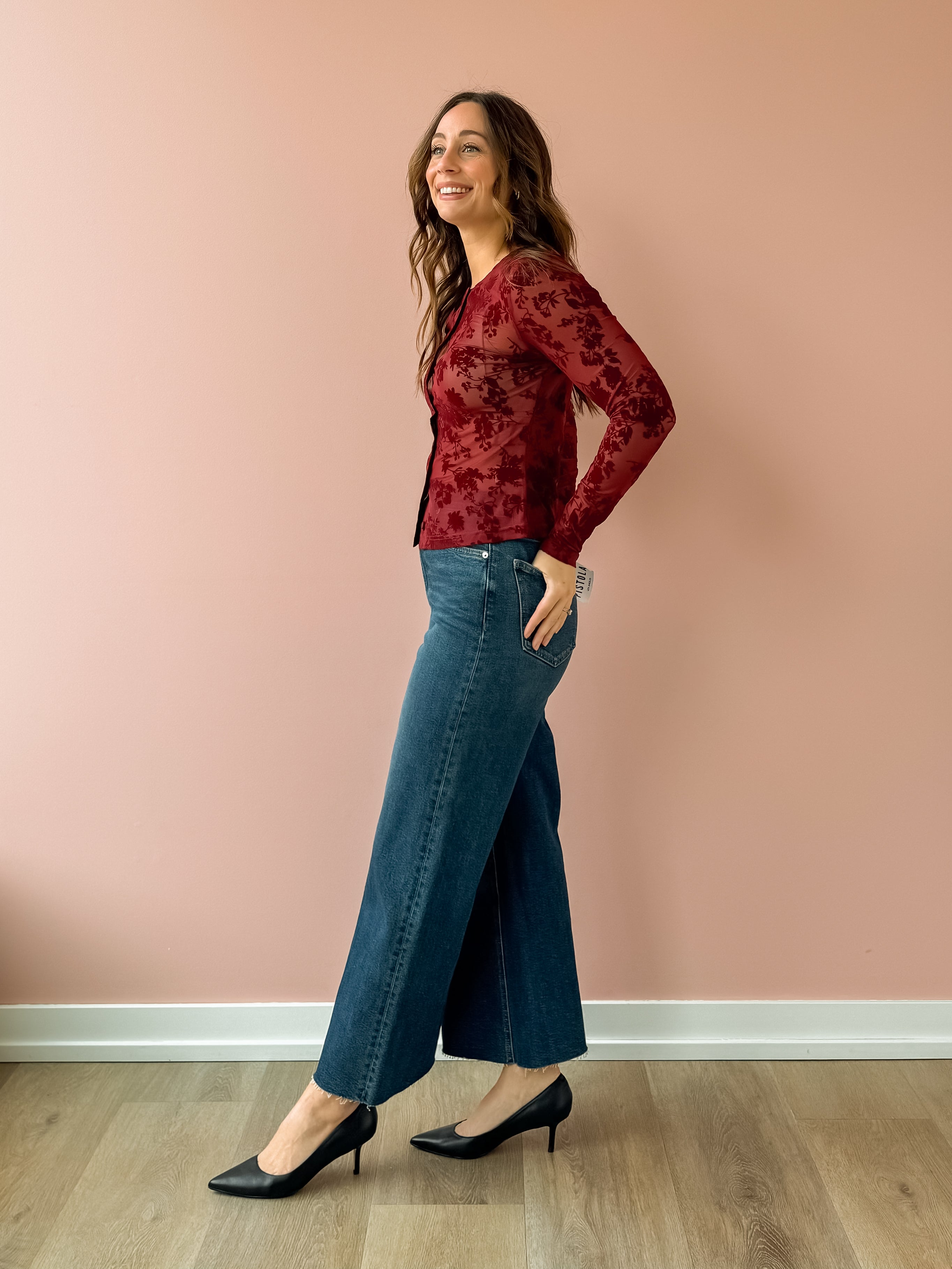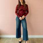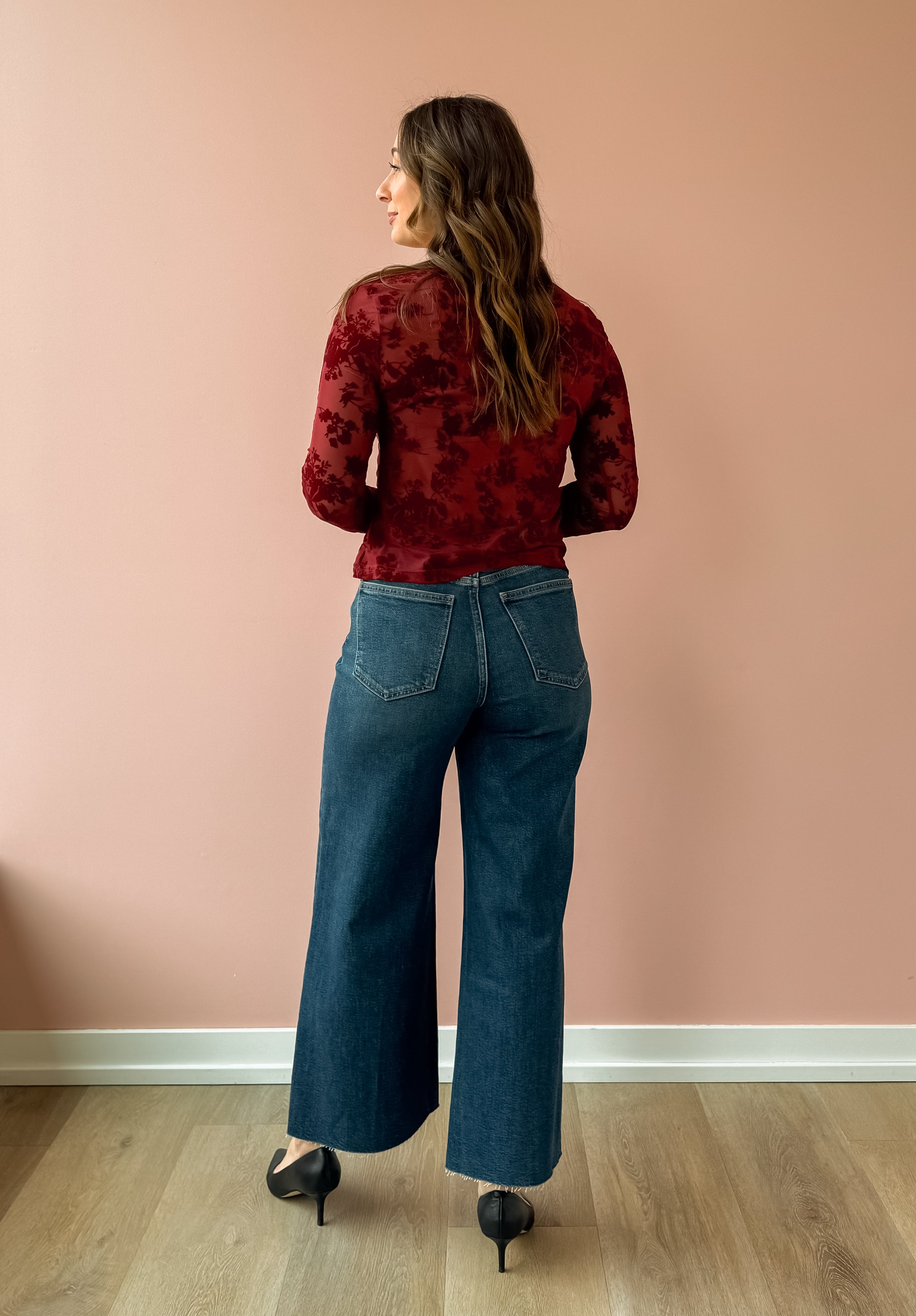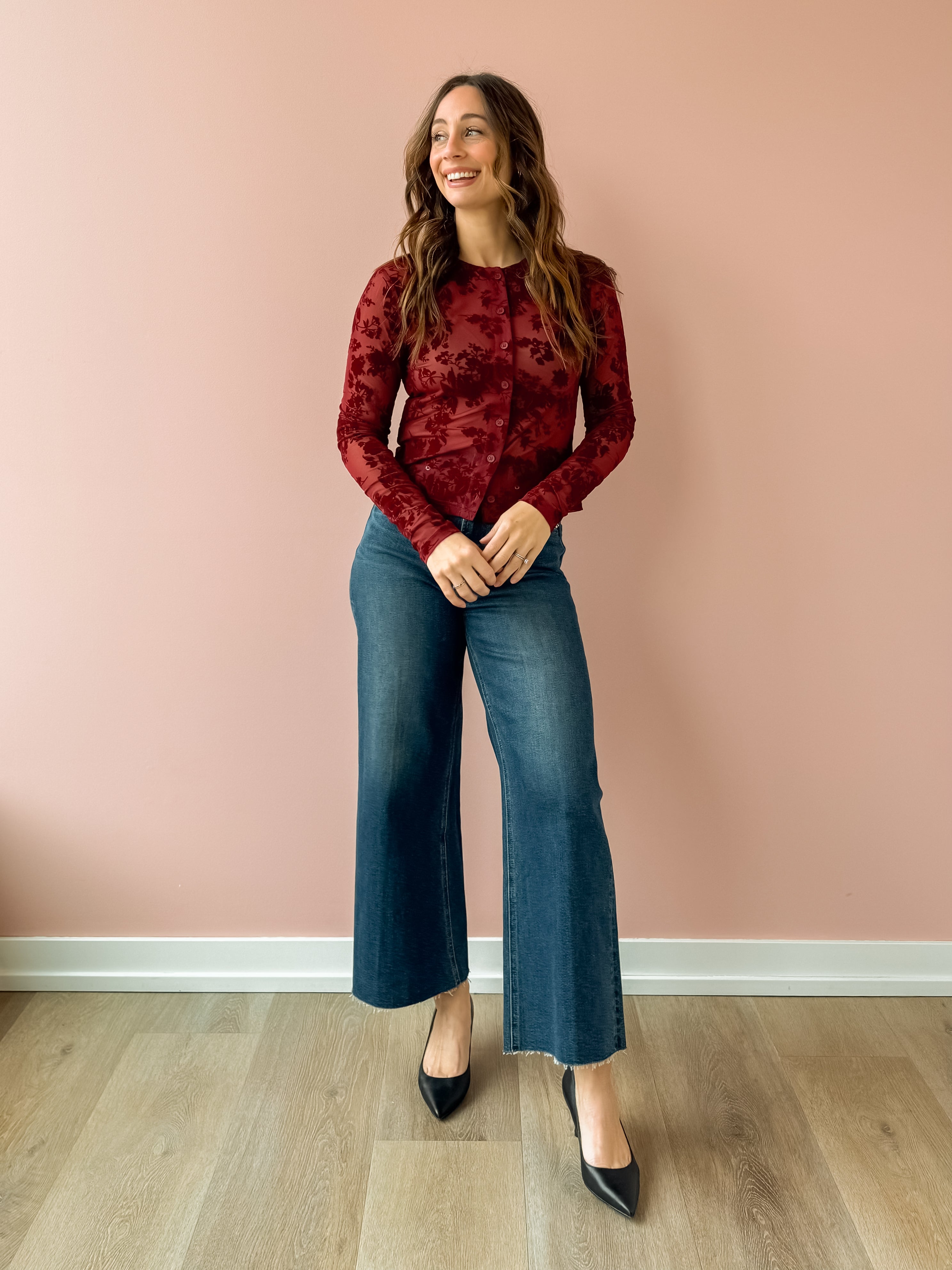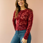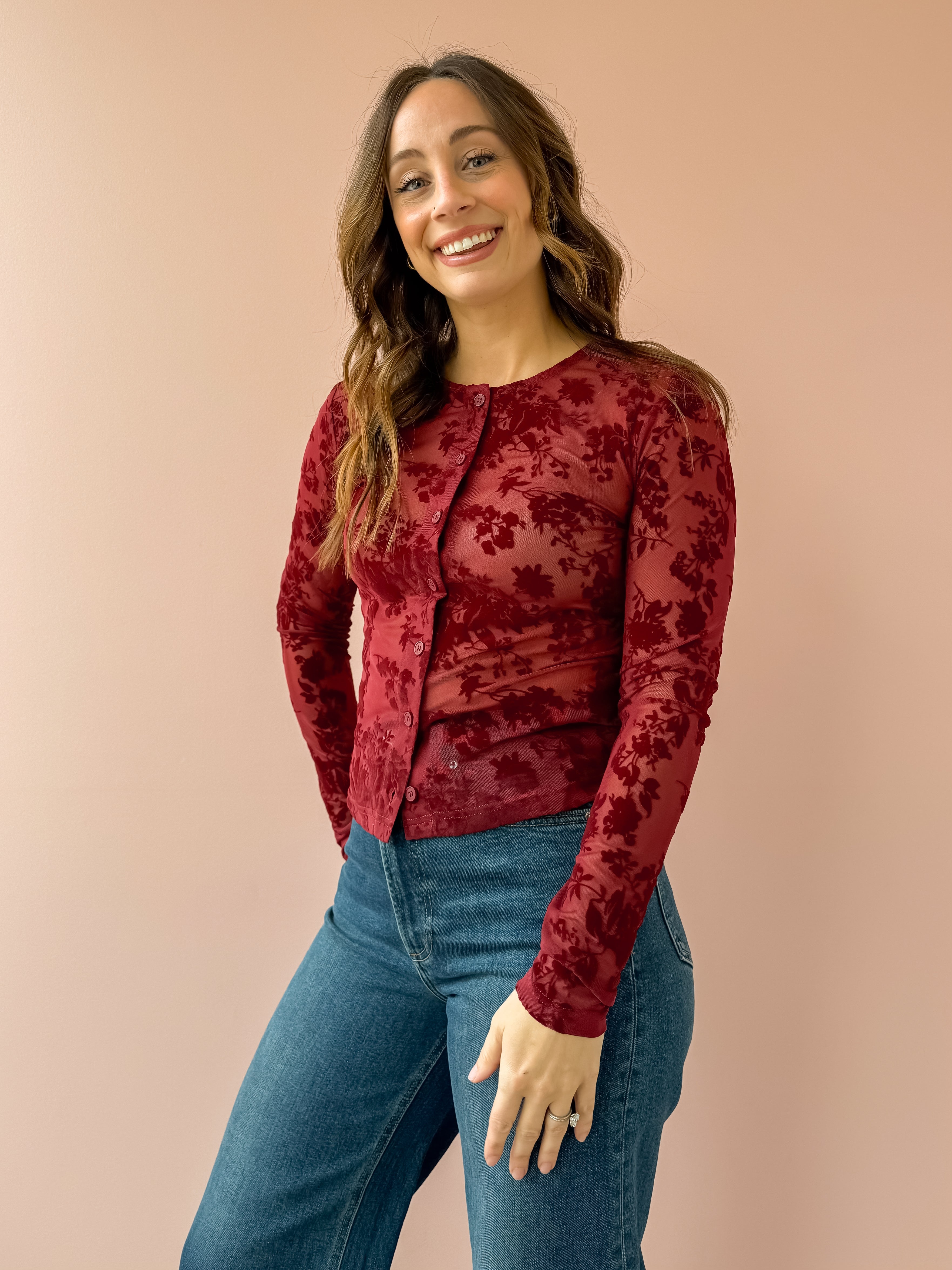 Turn heads in this elegant, semi-sheer velvet burnout top, crafted in a rich deep burgundy hue. Featuring a delicate floral pattern, this top combines soft texture with romantic detailing. The button-up front and classic round neckline offer a refined silhouette, while the sheer long sleeves add a touch of allure. Perfect for a night out or elevating your everyday style—pair it with high-waisted skirts or dark denim for a slightly edgy yet feminine look.