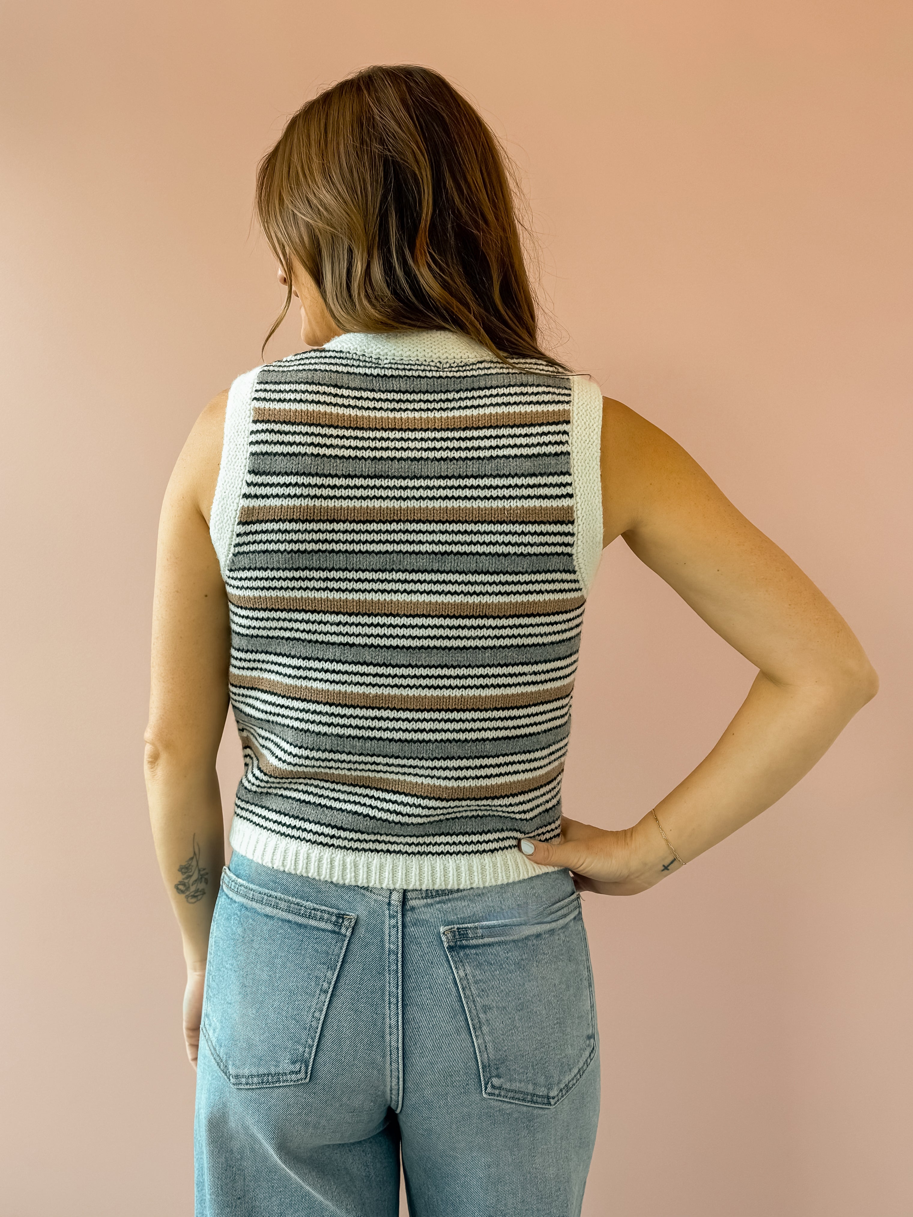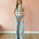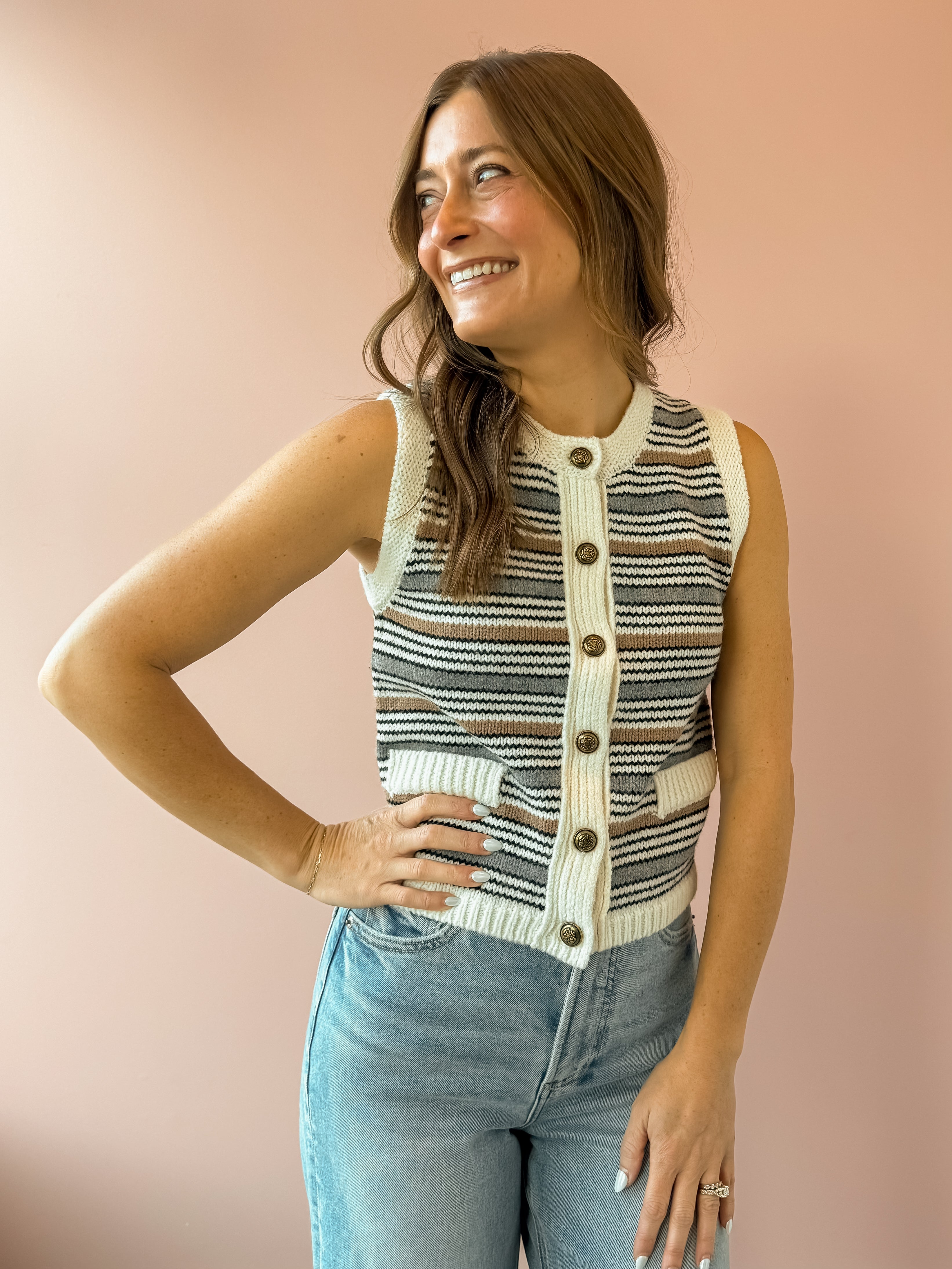The Rossi Vest is crafted from an incredibly soft melange knit that features a relaxed fit that moves with you, a classic crew neck, and charming novelty buttons for personality. Contrast ribbed edges add refined detail, while the timeless stripe pattern in ivory, beige, and blue works seamlessly with any season. Style it with denim and loafers for an instantly polished look.