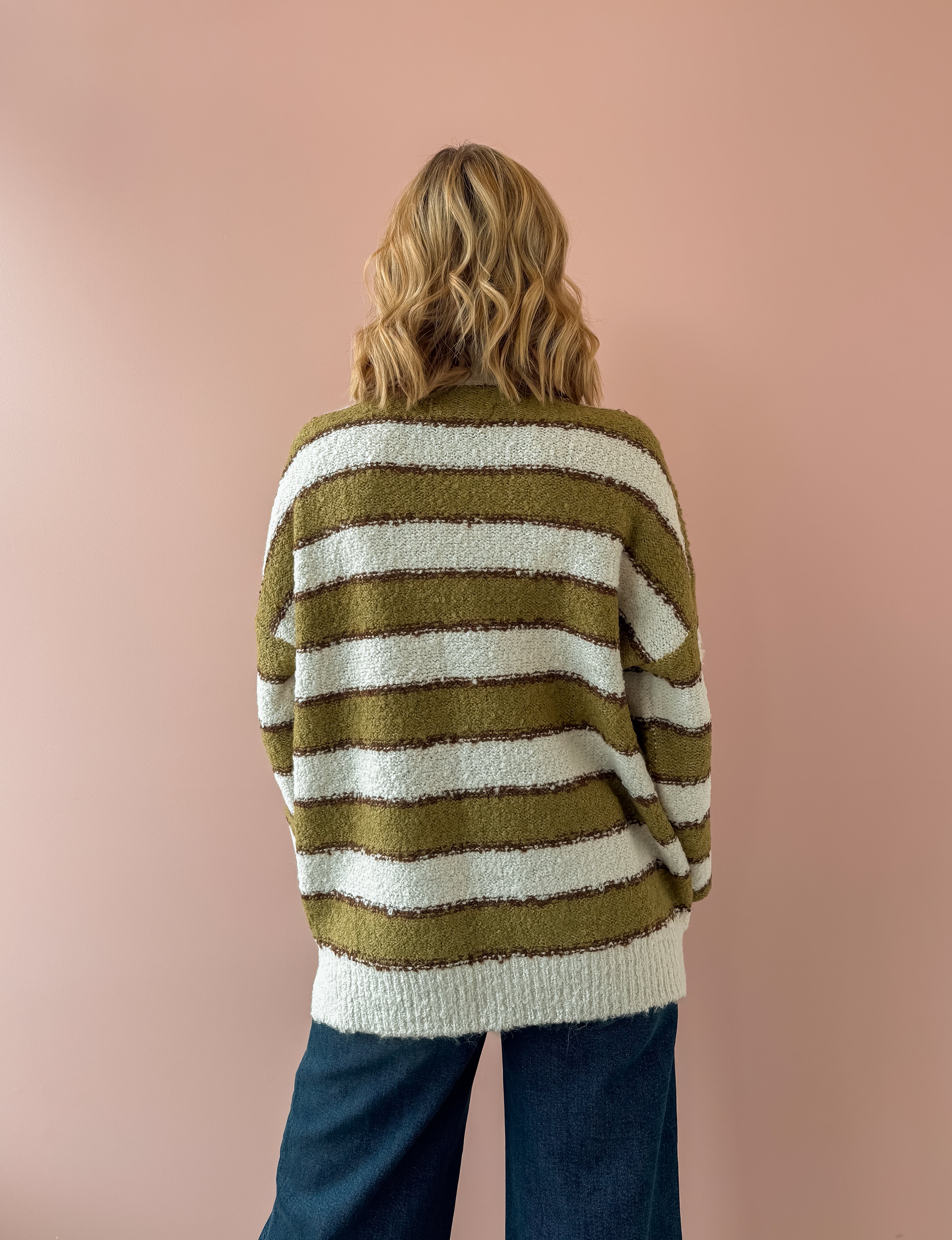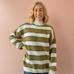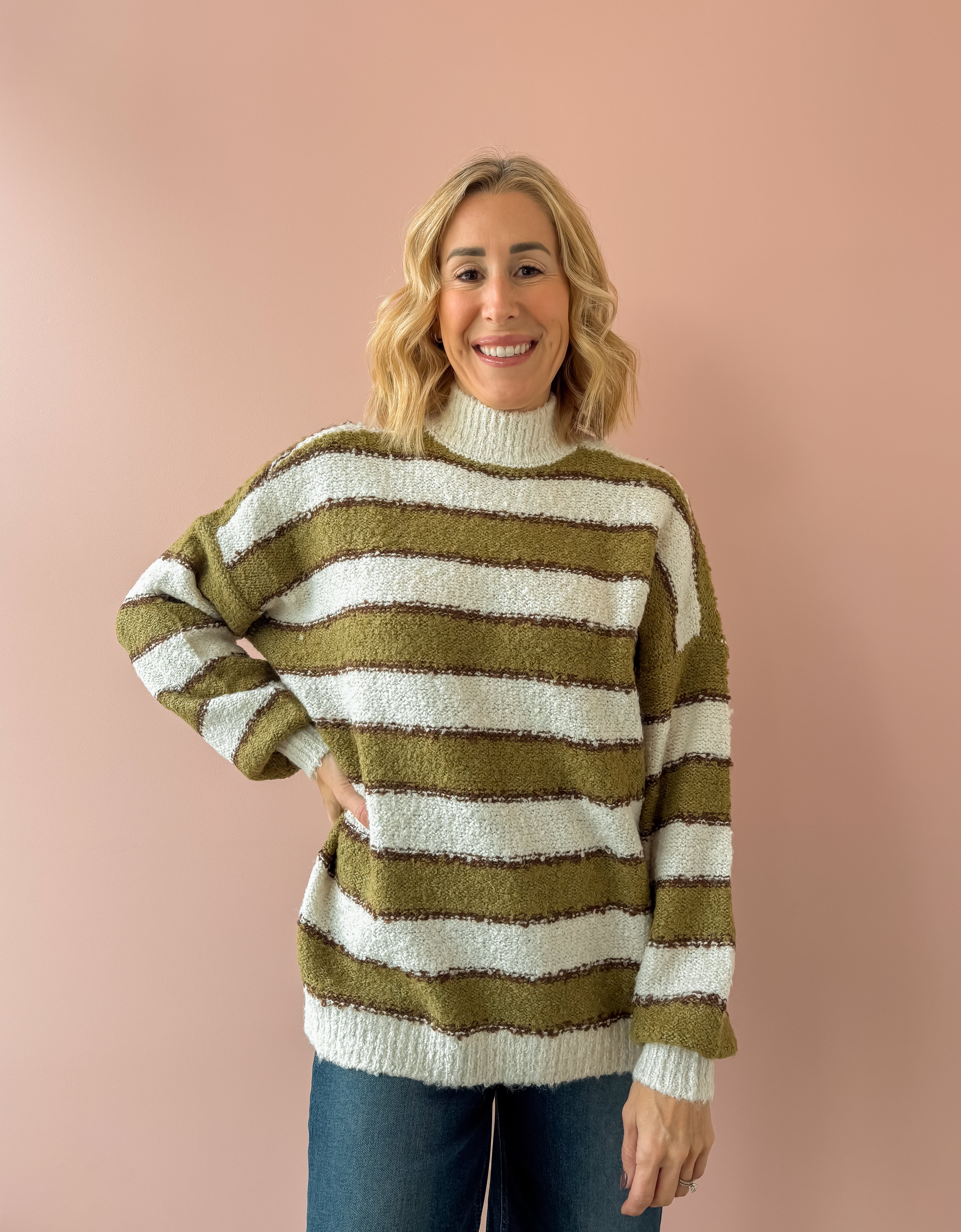 The Rowann Sweater delivers effortless style with its oversized silhouette and voluminous balloon sleeves. Designed with a cozy mock neck and relaxed fit, it strikes the perfect balance between comfort and sophistication. The striking green, brown, and ivory stripe pattern brings a bold touch to any wardrobe. Pair it with jeans and a bootie for a look that’s both chic and easy. This is the sweater you’ll reach for again and again all winter long!