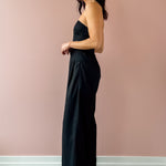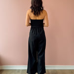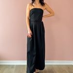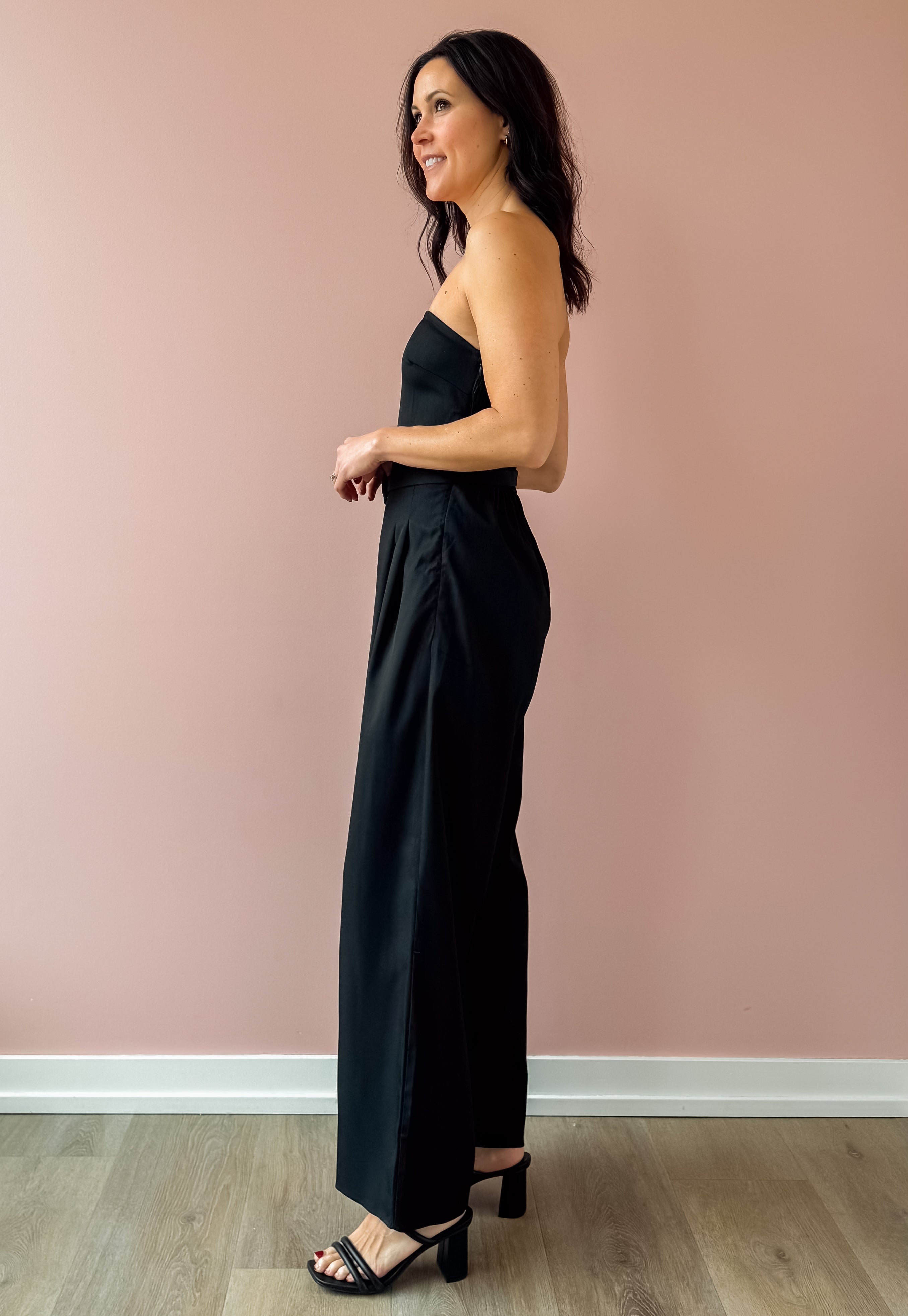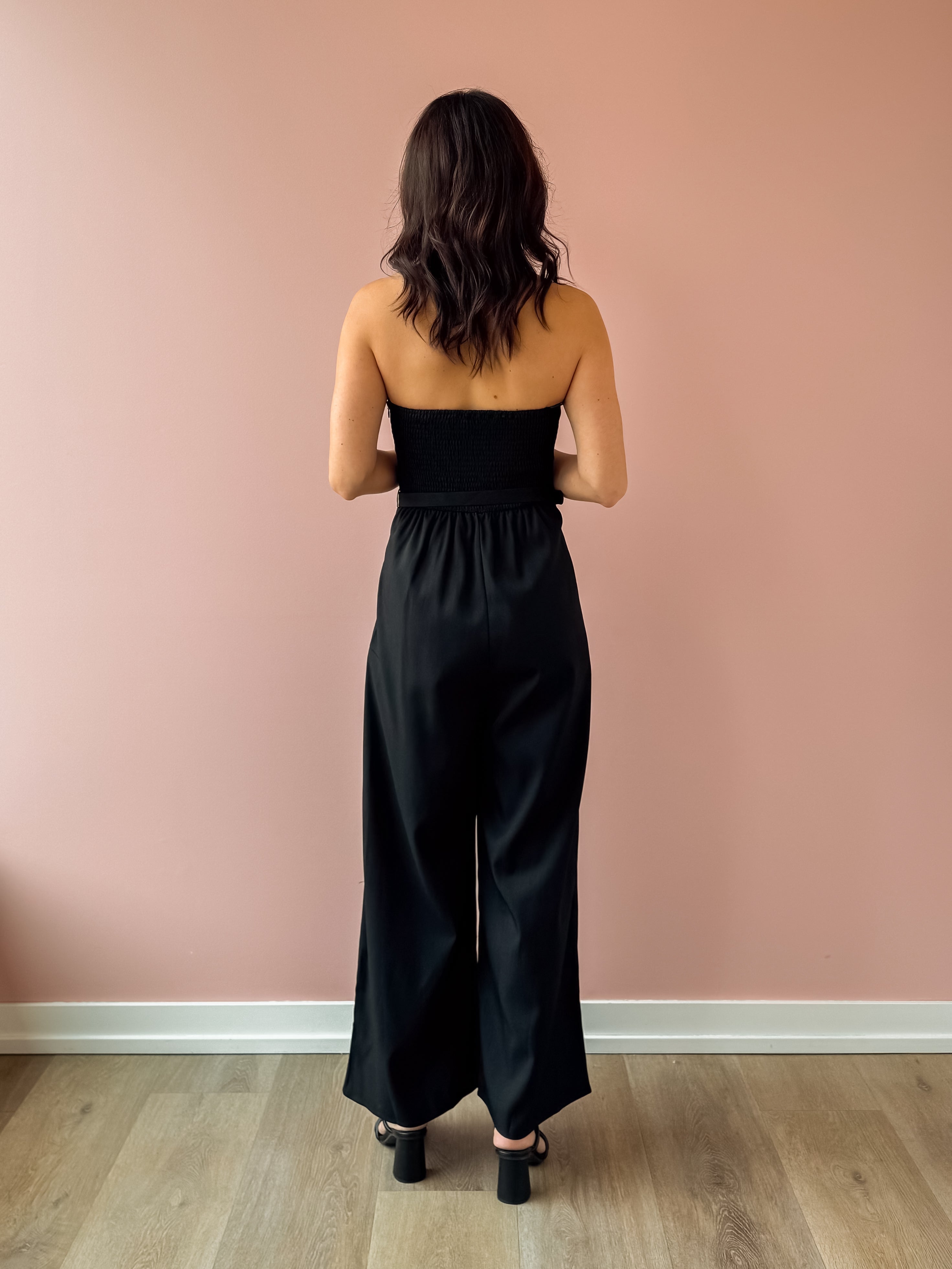 Make a statement in the Royale Tube Jumpsuit, a sleek black design that effortlessly transitions from day to night. The strapless silhouette and cinched waist belt create a flattering, defined look, while wide-leg pants offer comfort and movement. Pair with heels to elevate your style for any occasion—this versatile piece is your go-to for polished sophistication.