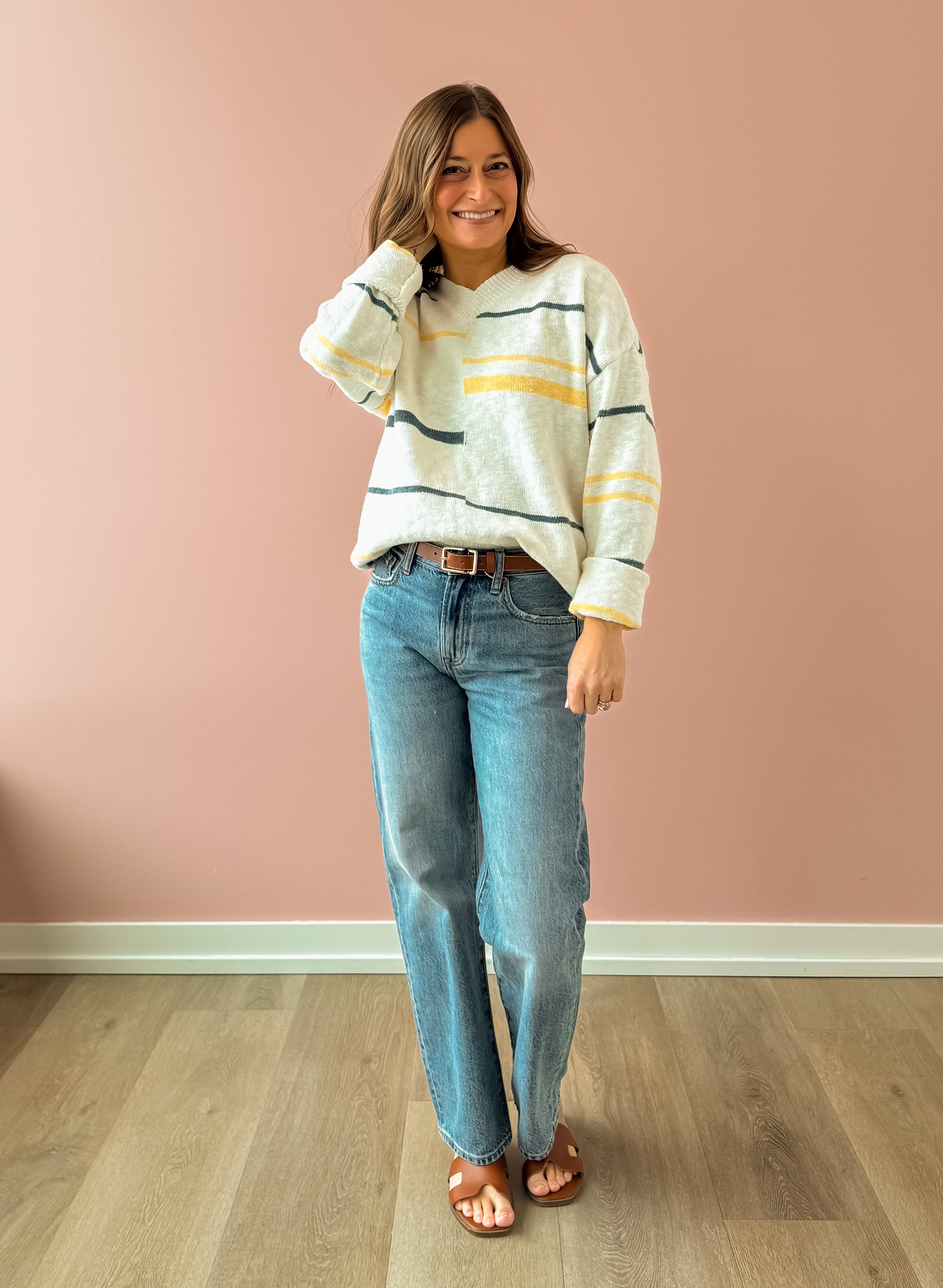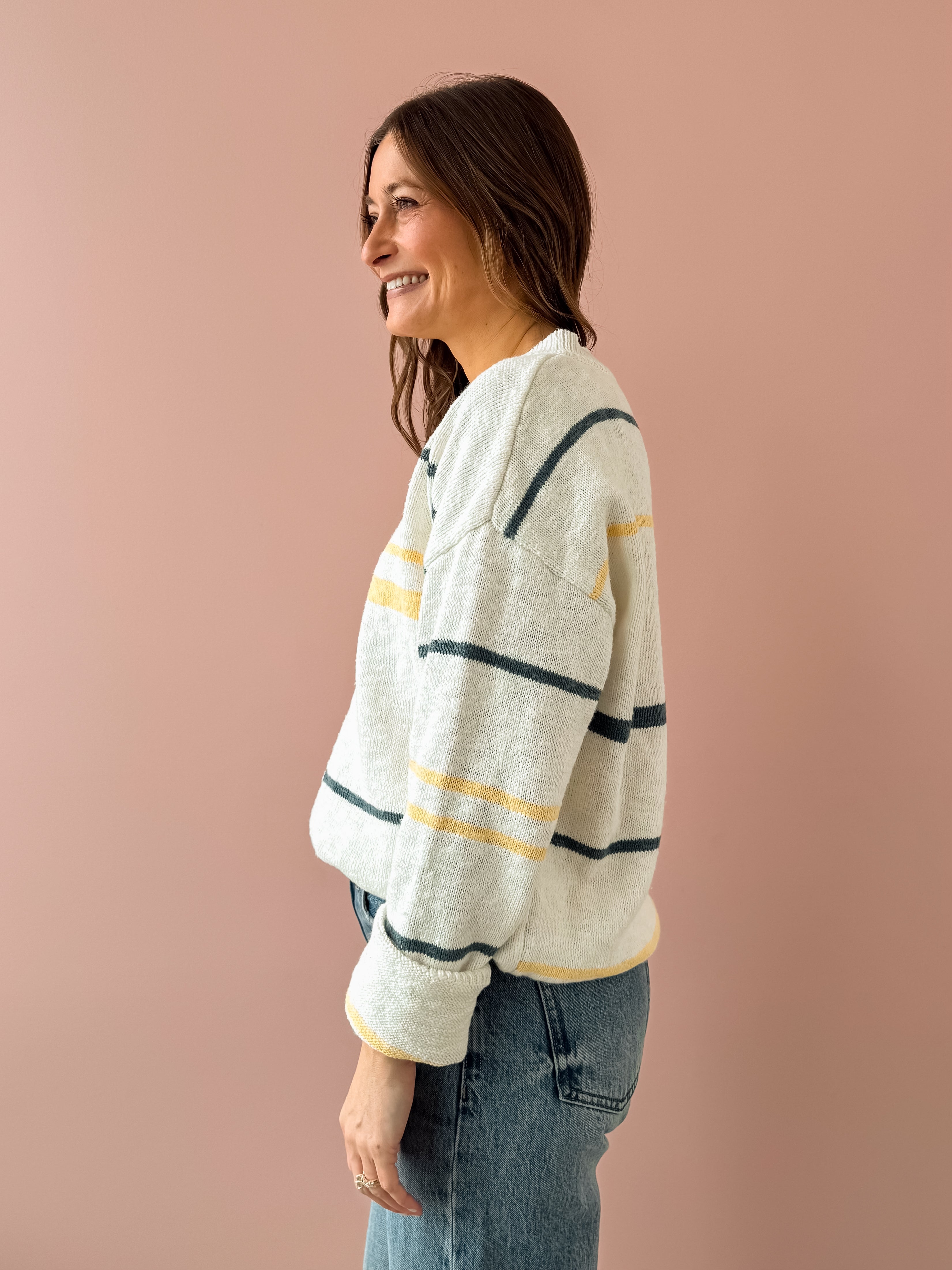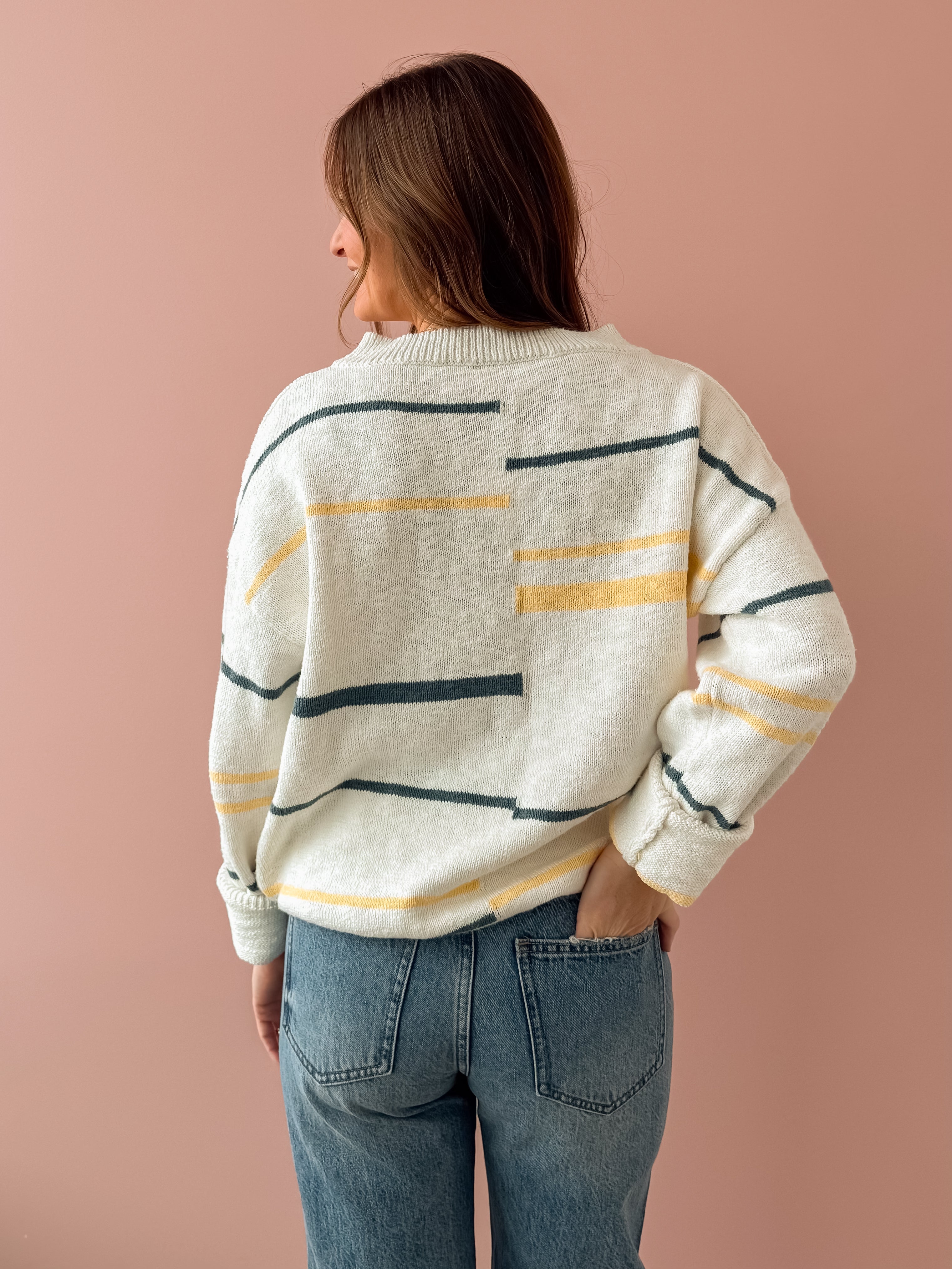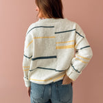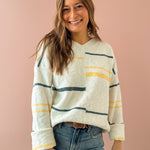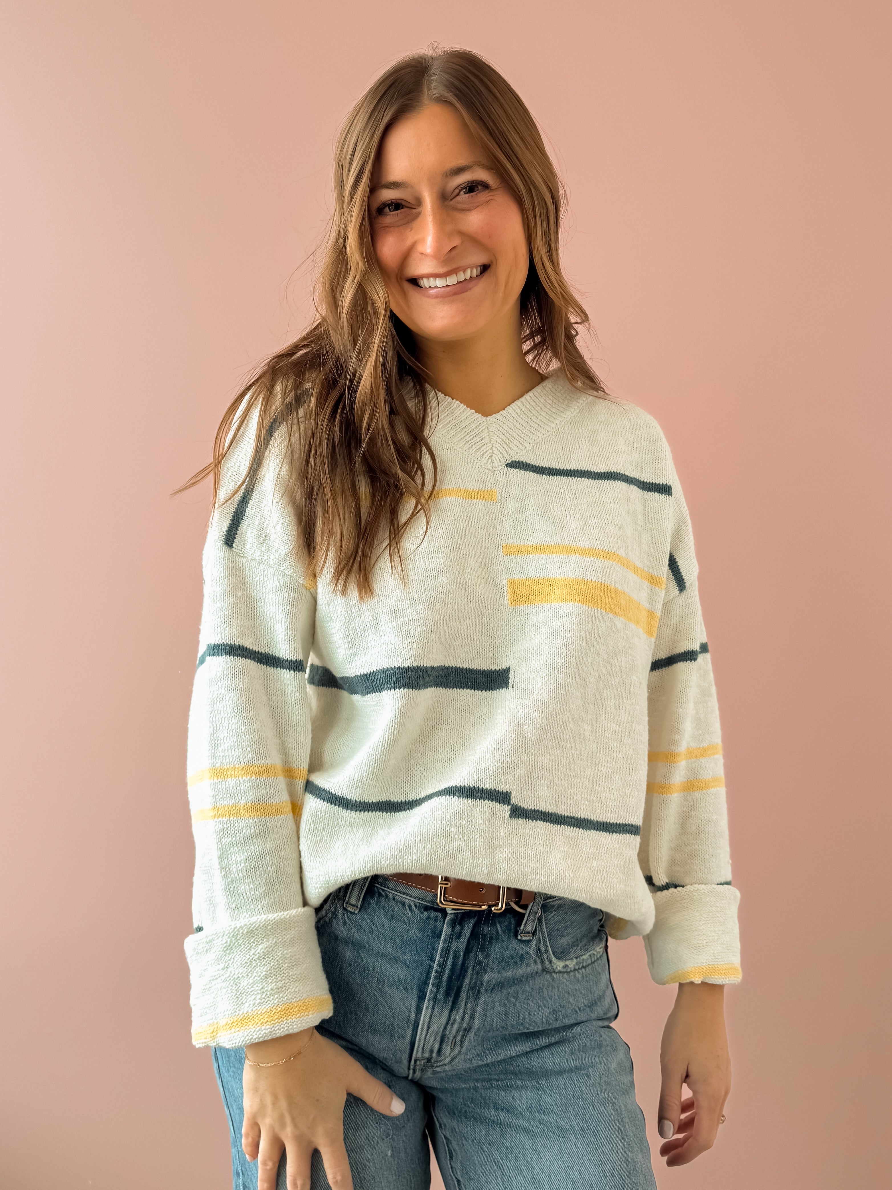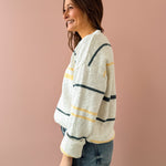 Meet your new go-to layering piece! The Peggy Sweater brings effortless style with its crisp white base accented by cheerful yellow and turquoise stripes. Cut in a relaxed, oversized silhouette that's perfect for throwing on any day, this sweater features a flattering V-neckline that works beautifully with everything in your closet. Pair it with your favorite denim and ballet flats for that coveted casual-chic vibe that never goes out of style.