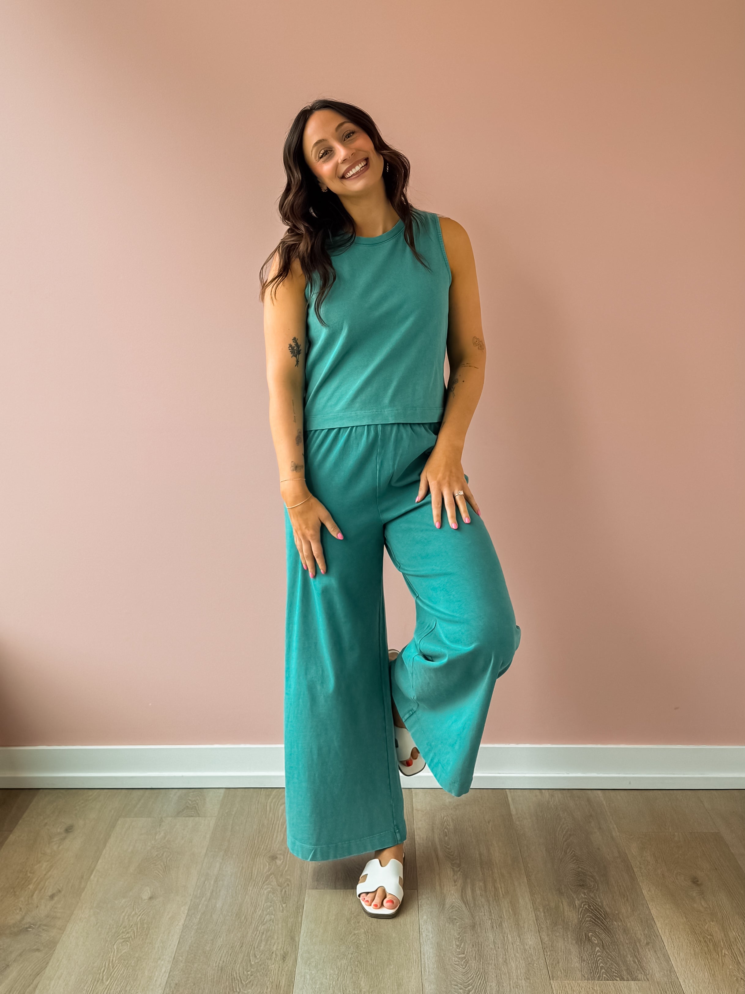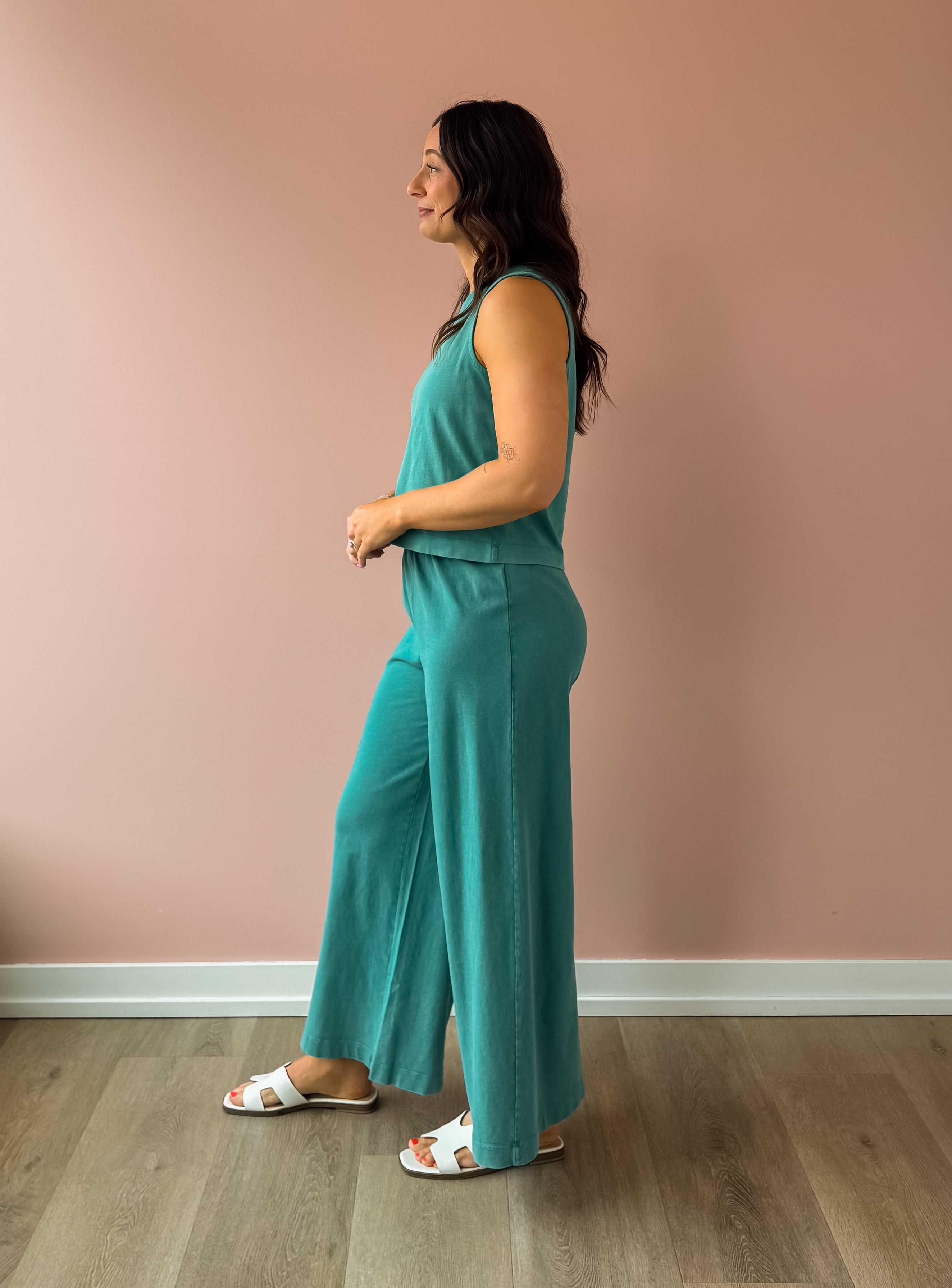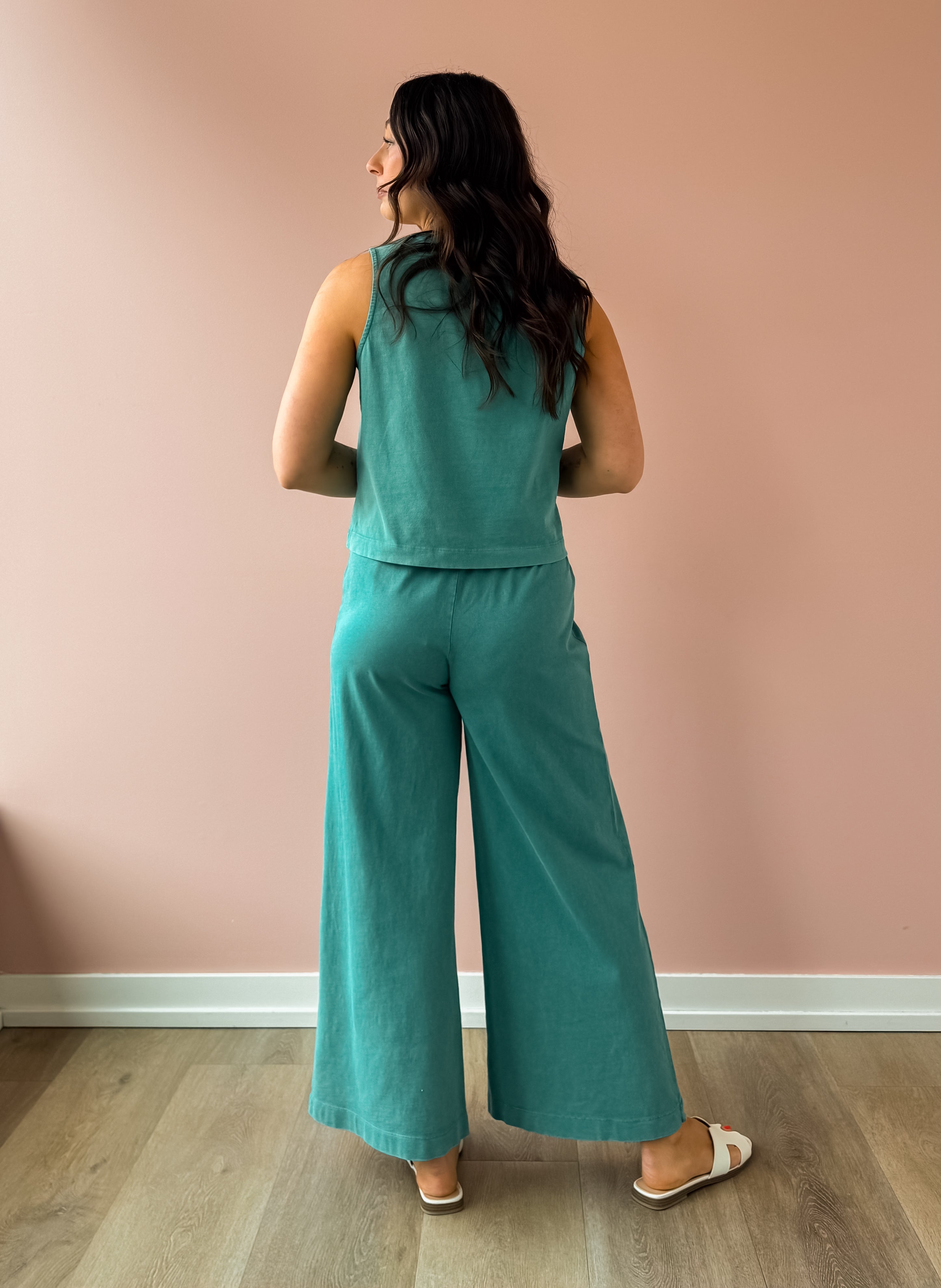 Discover the Scout Jersey Flare Pants in La Palma—a versatile wardrobe essential made from soft 100% cotton jersey knit. The high-rise, wide-leg design delivers a relaxed silhouette with polished appeal, while the elastic waistband ensures comfort throughout your day. Midweight fabric and ankle-length cut create a flattering silhouette. The mineral wash finish brings understated texture and visual interest. Perfectly paired with our Sloane Jersey Tank and sandals for an effortless, coordinated look!
