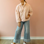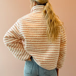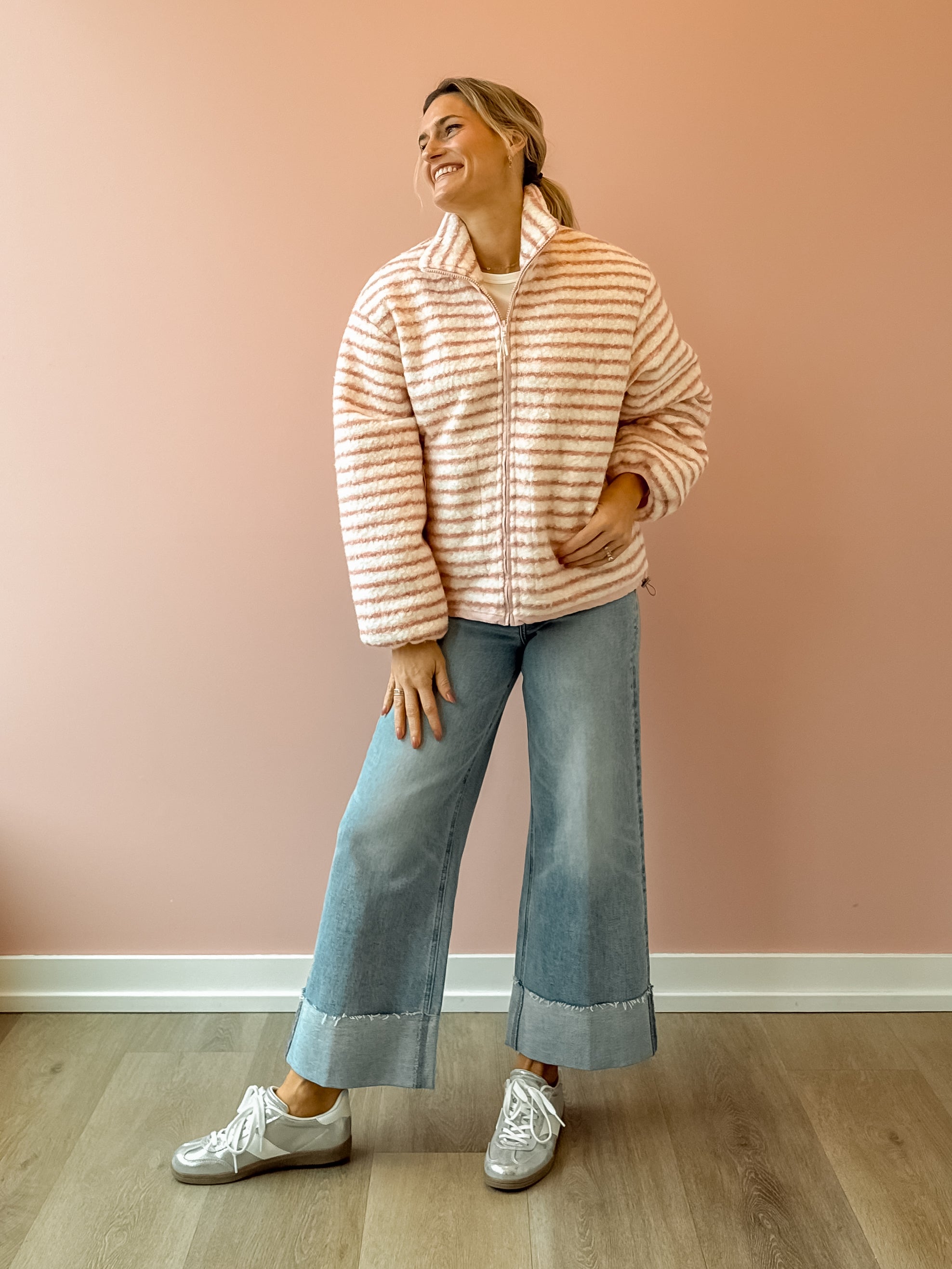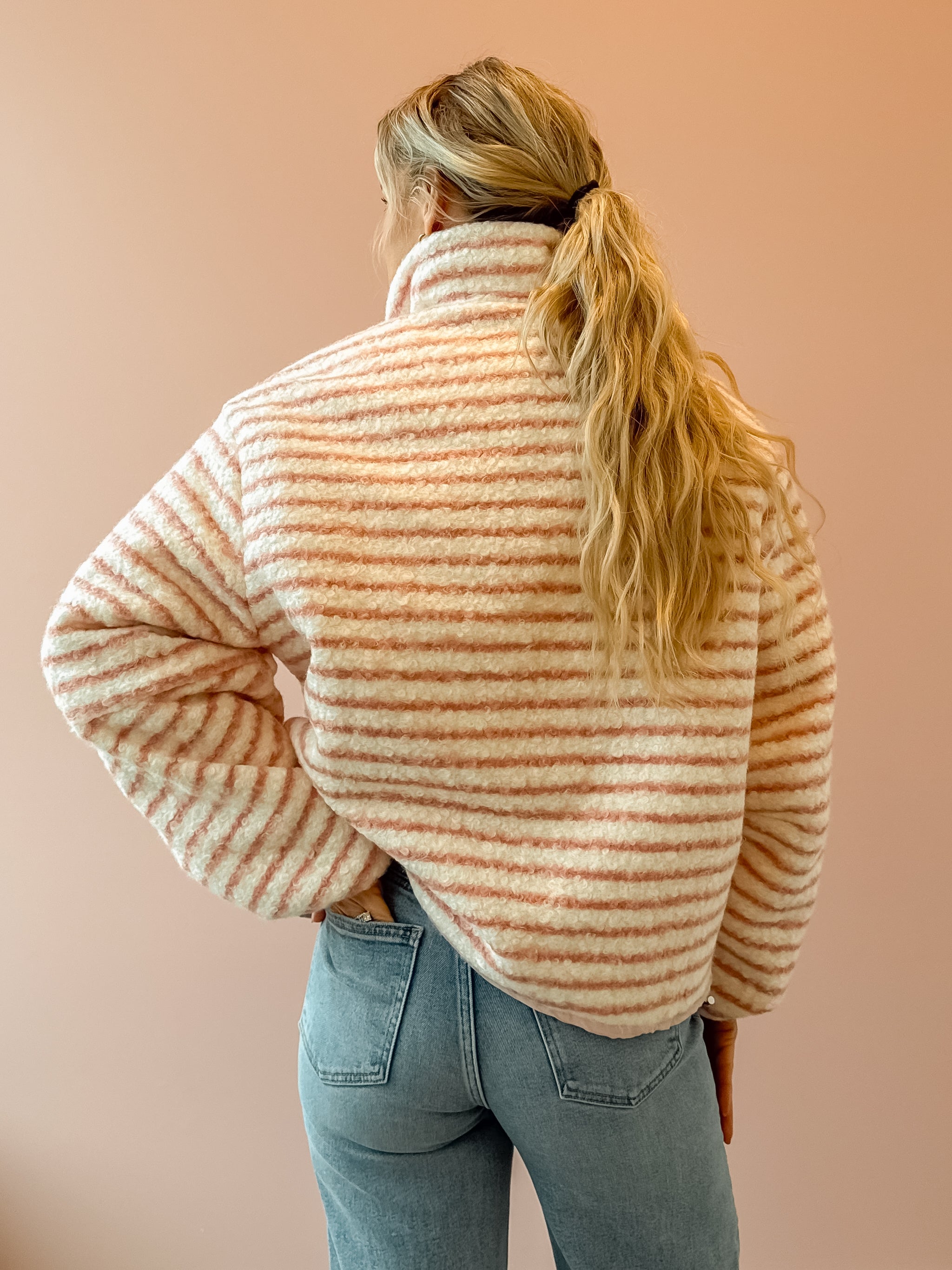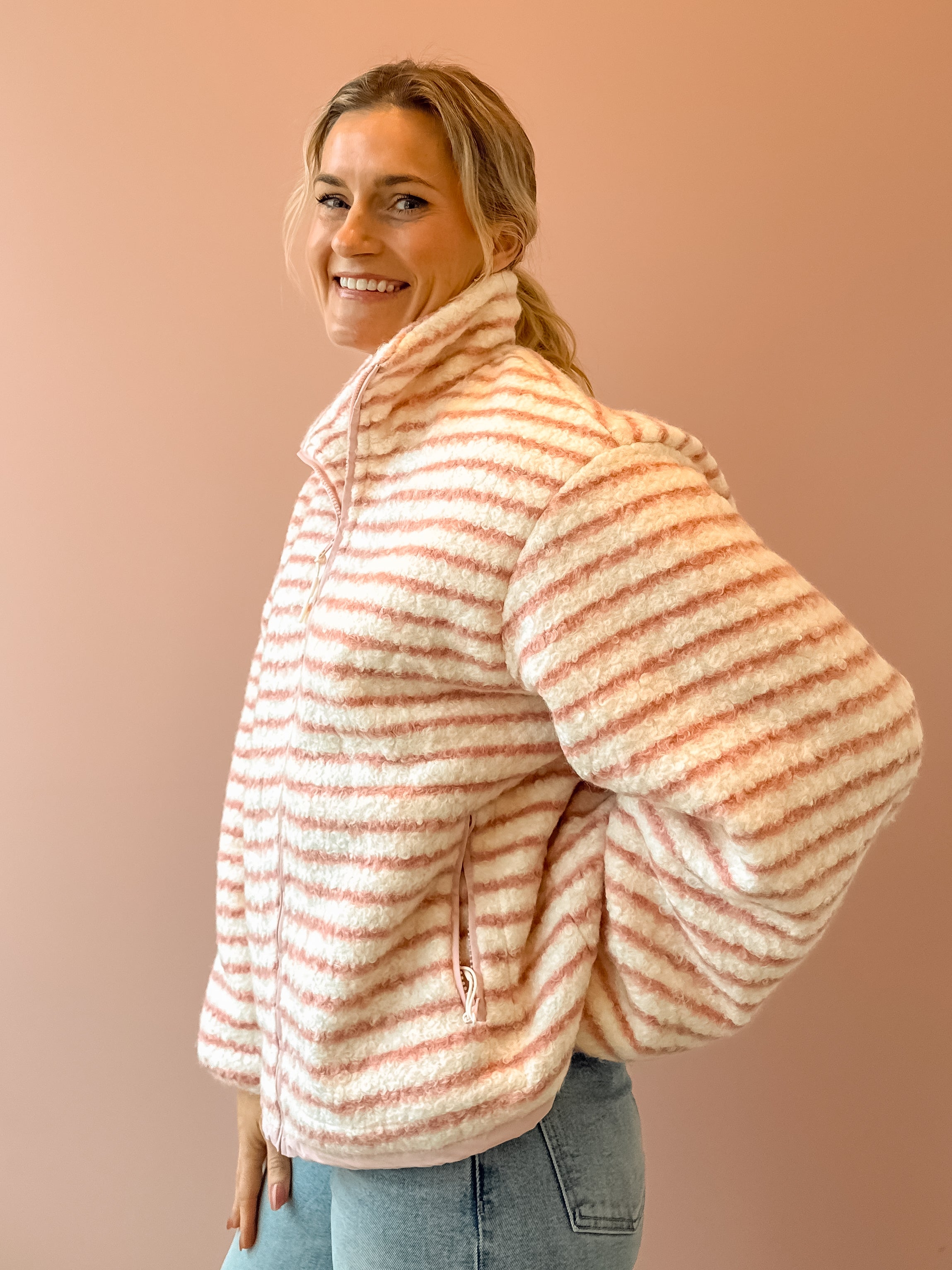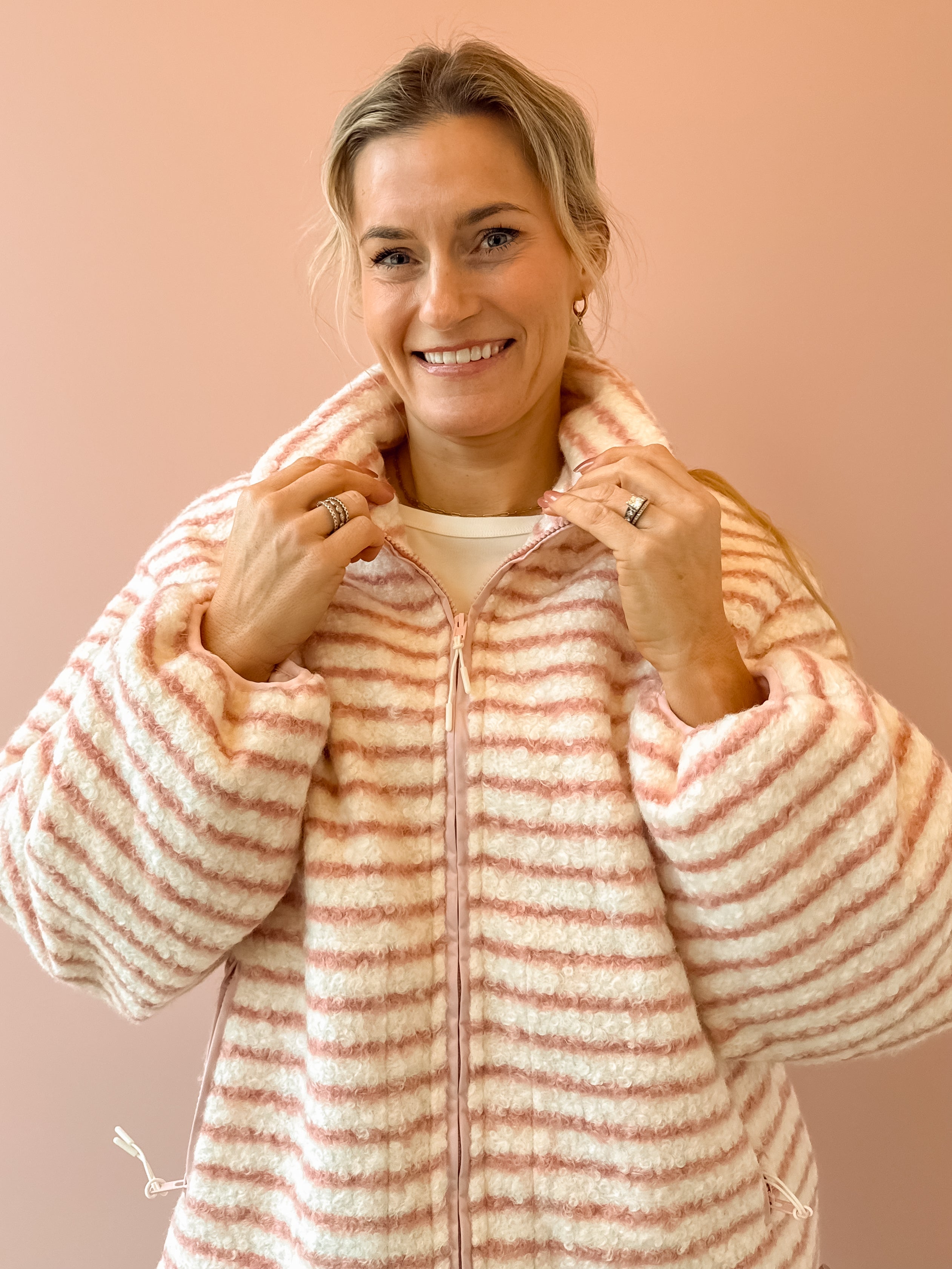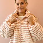 Wrap yourself in effortless comfort with the Seraphina Jacket. This cozy zip-up features a charming light blush pink and white striped design that pairs beautifully with any outfit. The slightly oversized silhouette provides the perfect amount of breathing room while maintaining a flattering fit, making it an ideal layering piece for transitional weather. Whether you're heading out for a casual day or need an extra layer indoors, the Seraphina delivers both style and warmth in one versatile essential.