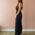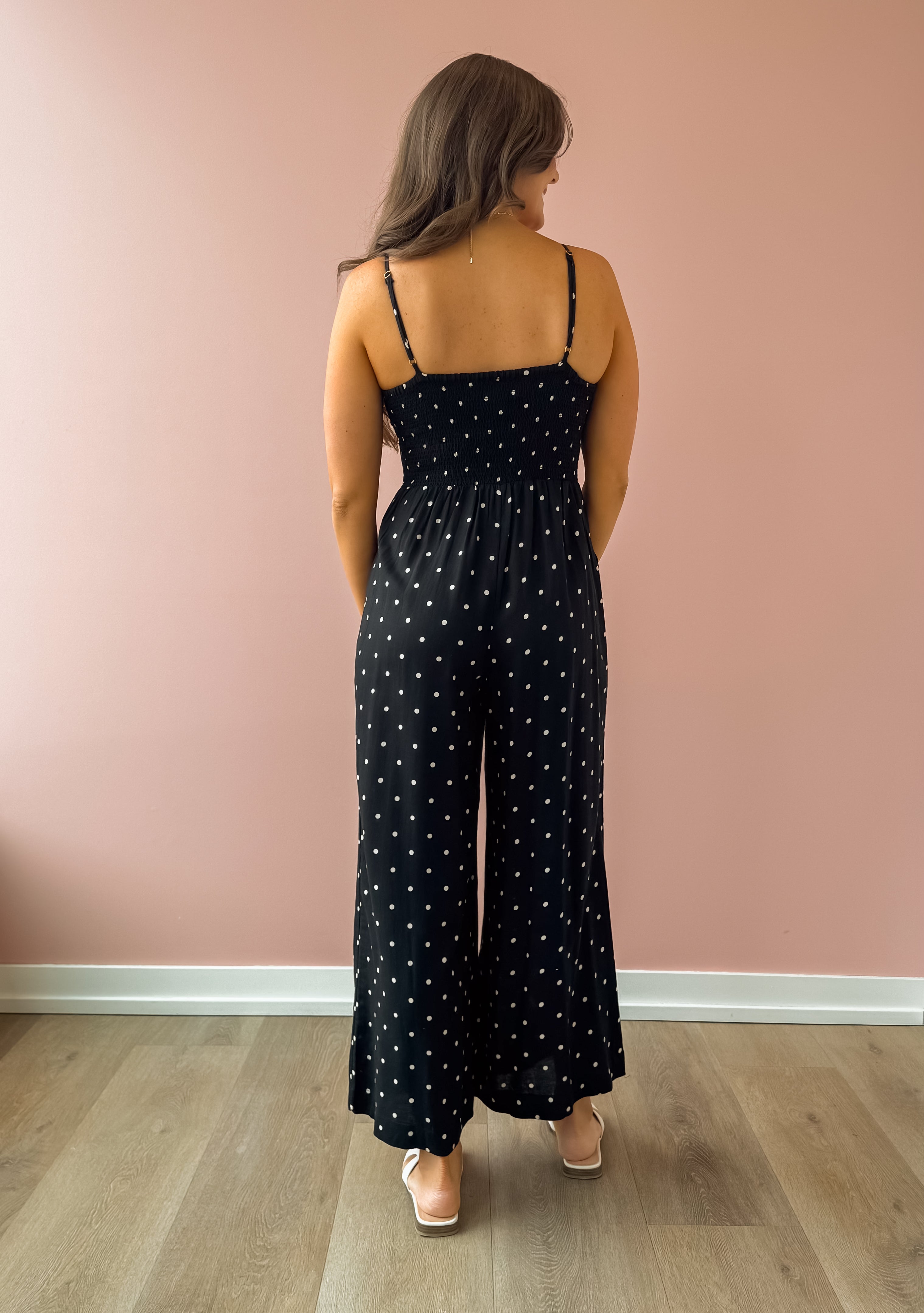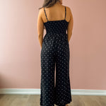 Endlessly wearable, the Shaye Jumpsuit is a one-and-done outfit you’ll love reaching for. Designed in a classic black with delicate white polka dots, this jumpsuit features a fitted bodice with a sweetheart neckline and adjustable spaghetti straps for the perfect fit. The flowy wide-leg silhouette creates an easy, breezy feel, while side pockets add a practical touch we all love. Dress it up with wedges or keep it casual with a sandal- this piece does it all.