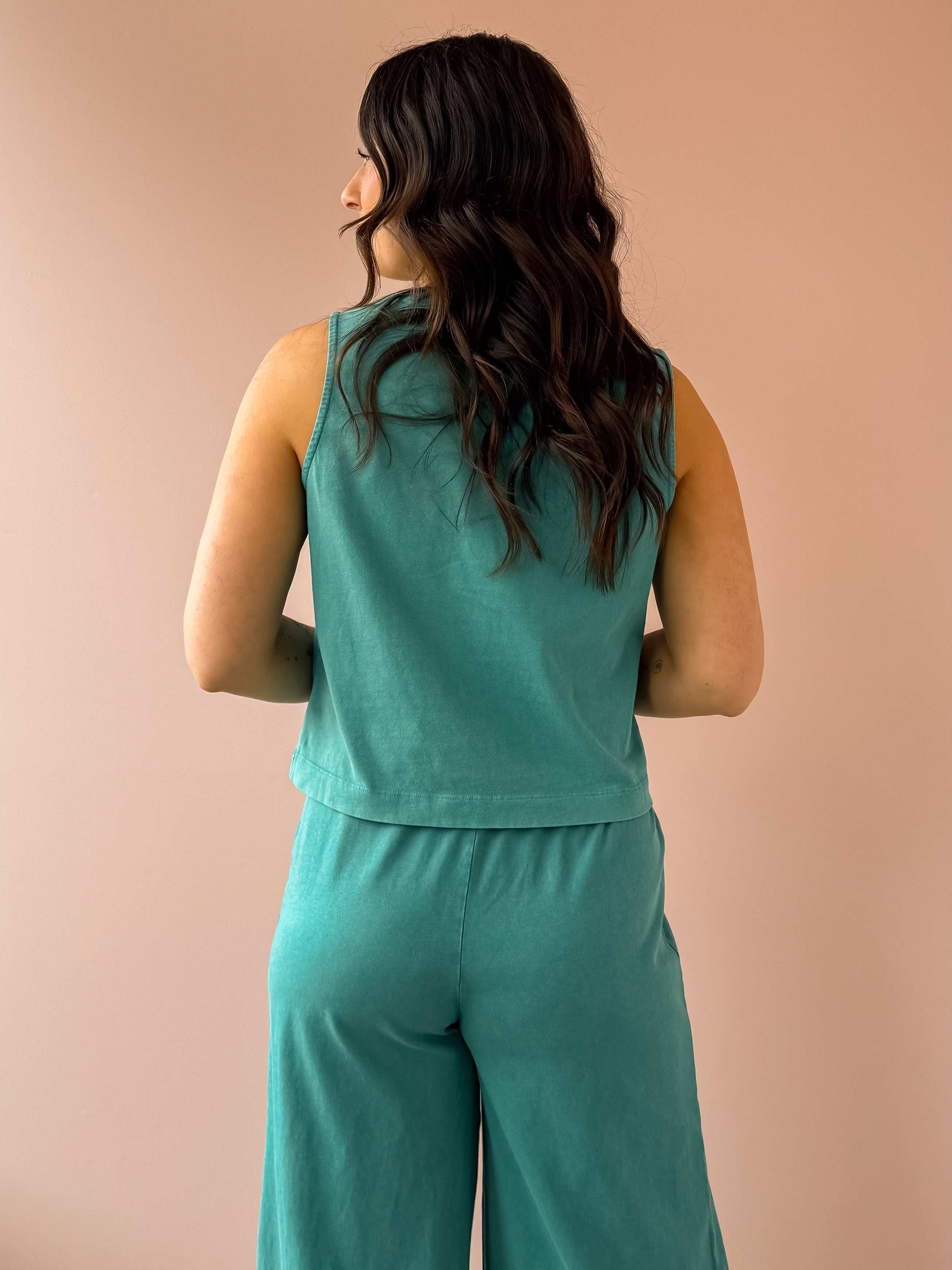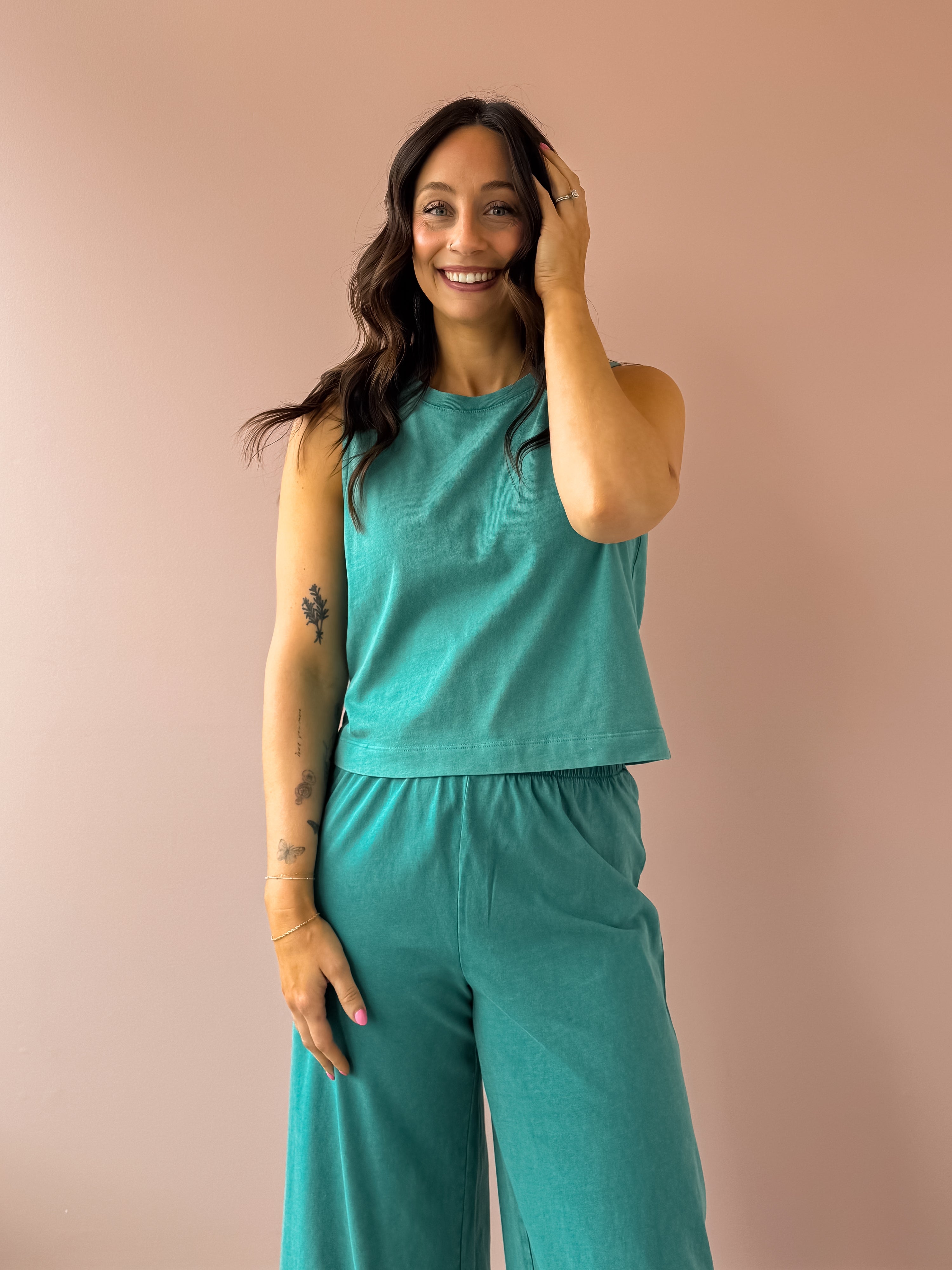 The Sloane Jersey Tank is your go-to everyday essential. Made from soft cotton jersey, this relaxed-fit tank features a crew neck, sleeveless design, and supportive wide straps. The midweight fabric drapes beautifully, hitting right at the hemline for a flattering silhouette. In the stunning La Palma color, it pairs perfectly with our Scout Jersey Crop Flare Pant and sandals for effortless vacation style or casual everyday wear.