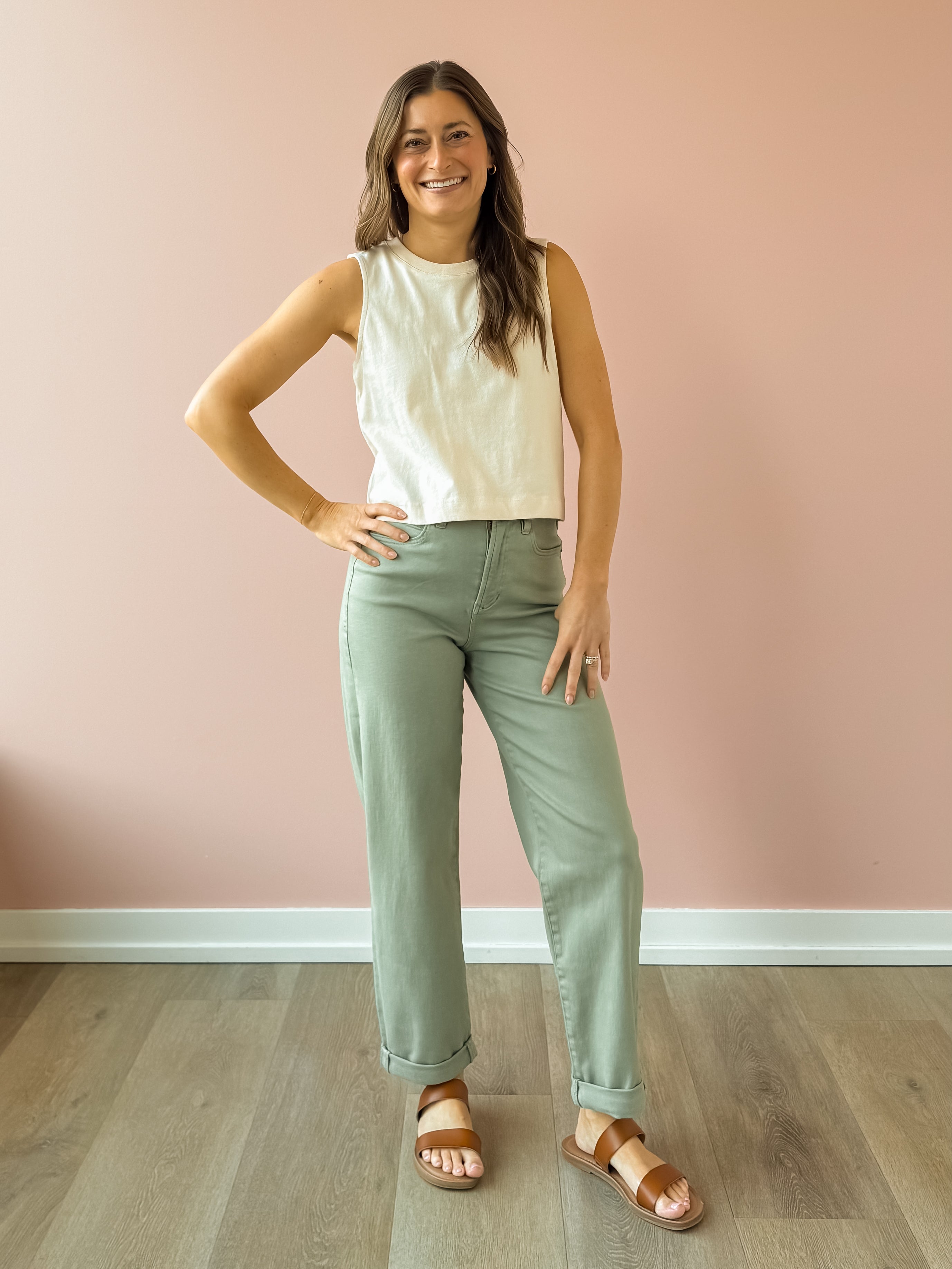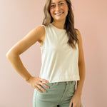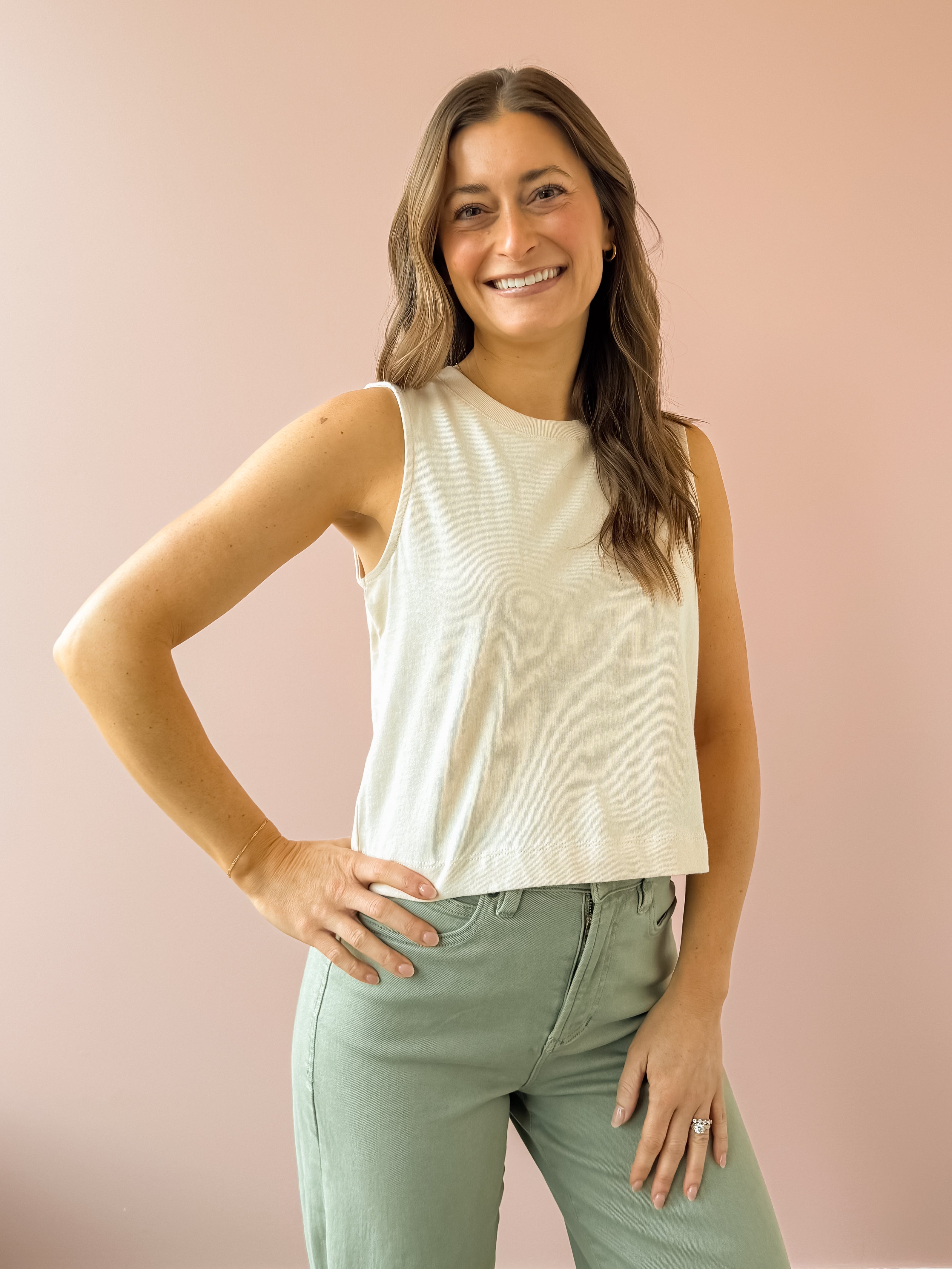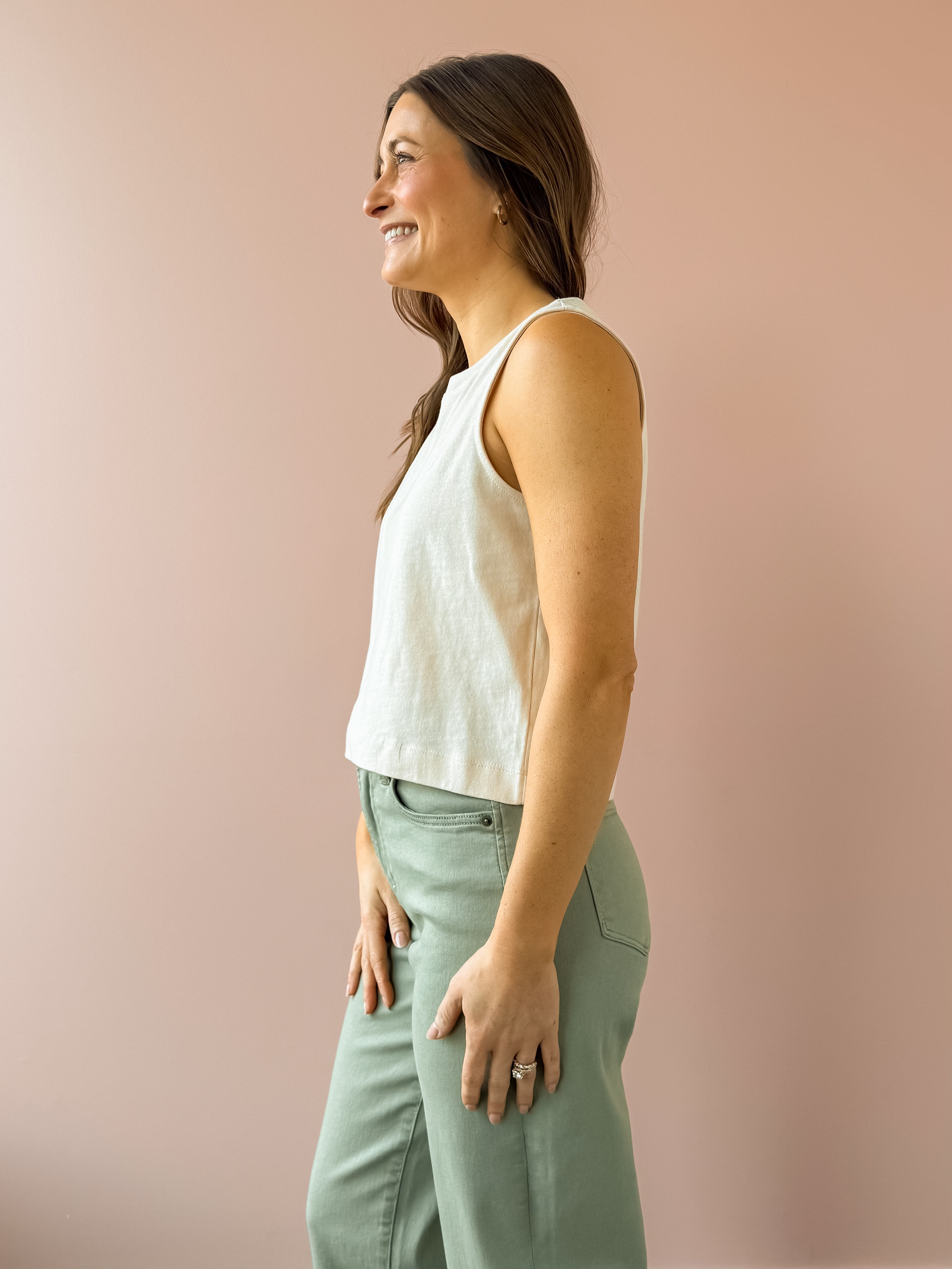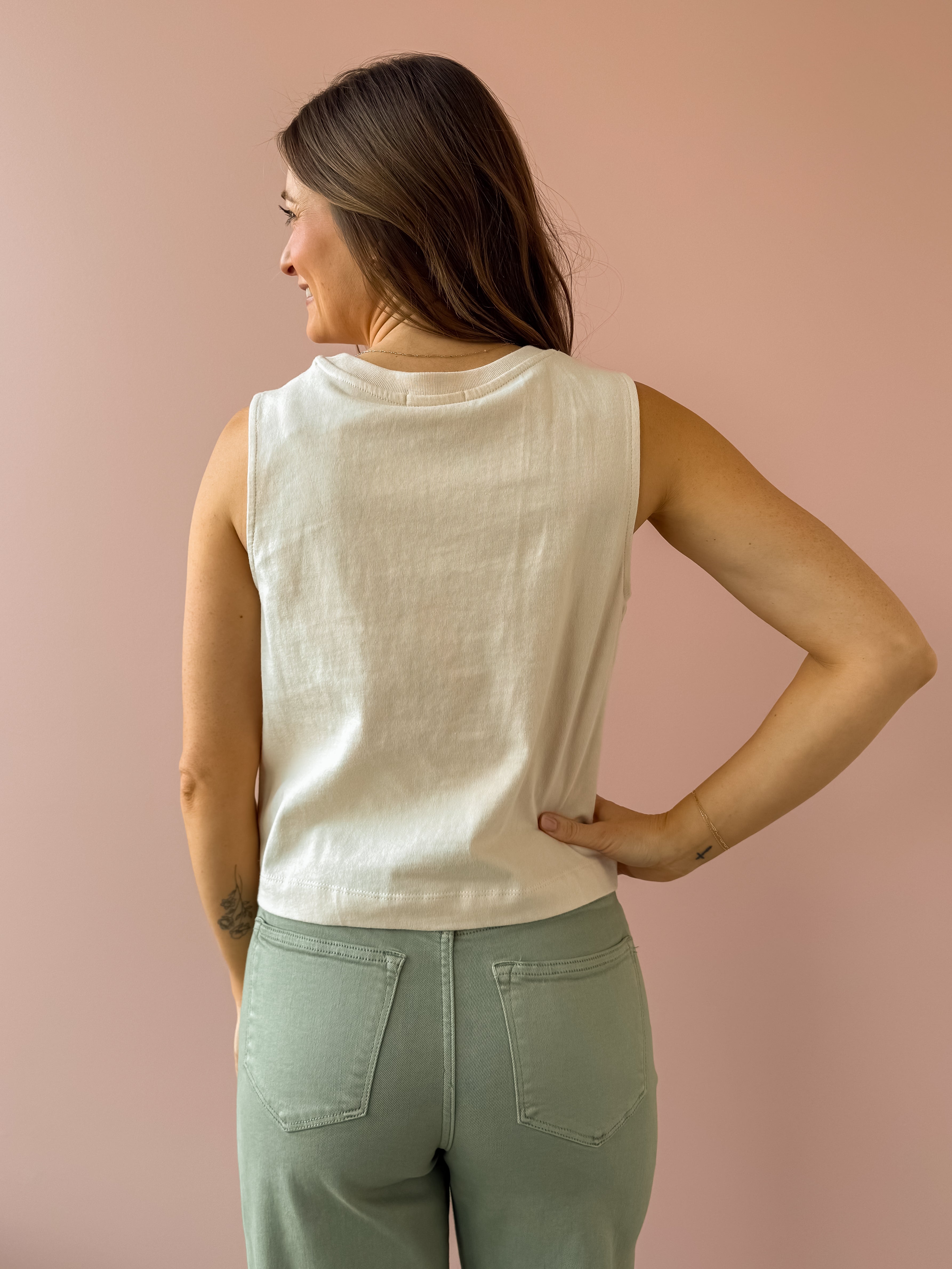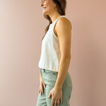 This tank is an everyday essential with a laid-back feel and timeless style. Designed with a relaxed fit, crew neckline, and wide straps, it offers easy comfort that works year-round. The lightweight, softly textured fabric features a subtle mineral wash for a lived-in look that pairs perfectly with everything from denim cutoffs to skirts!