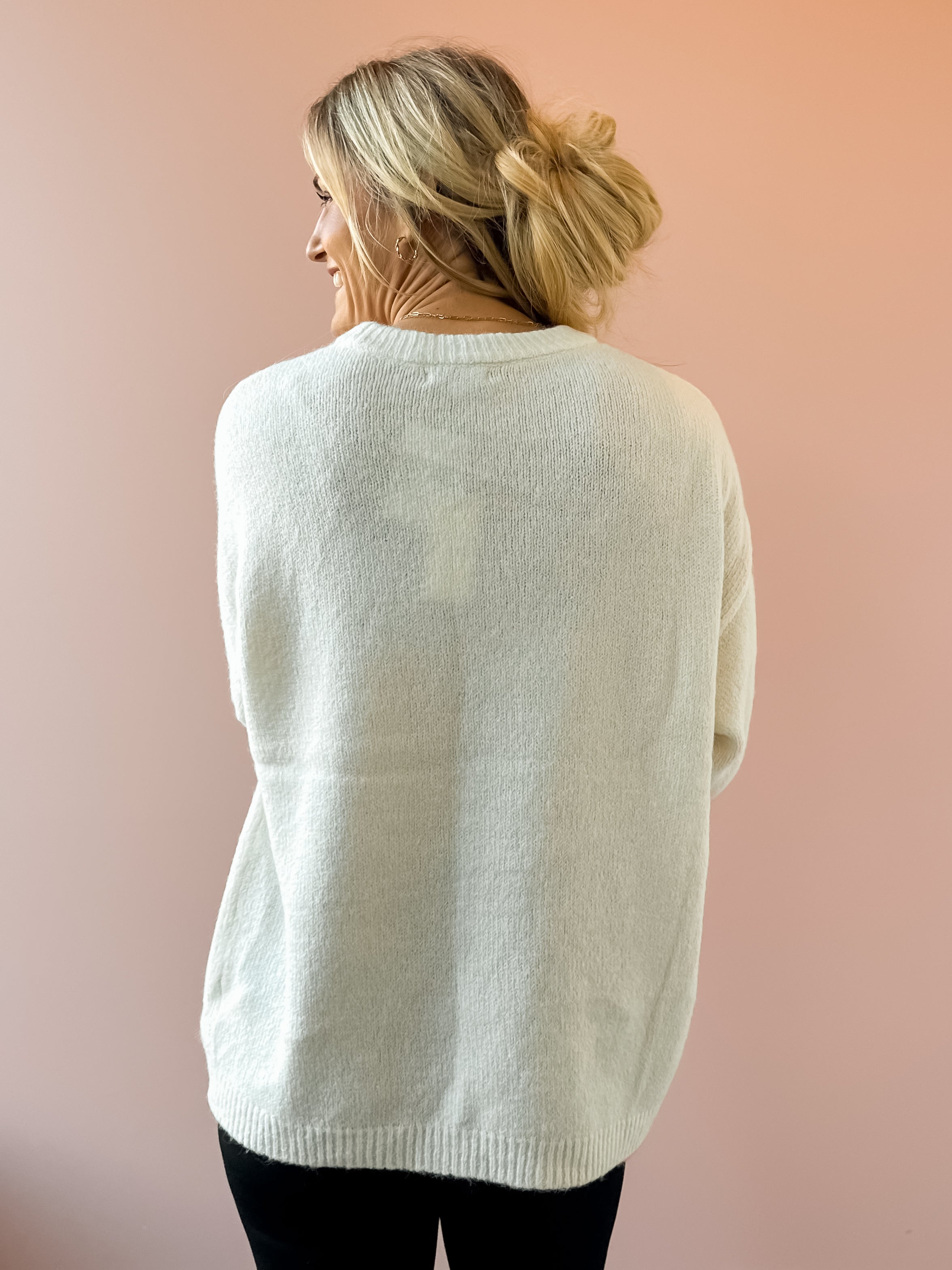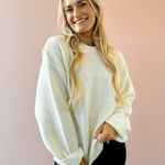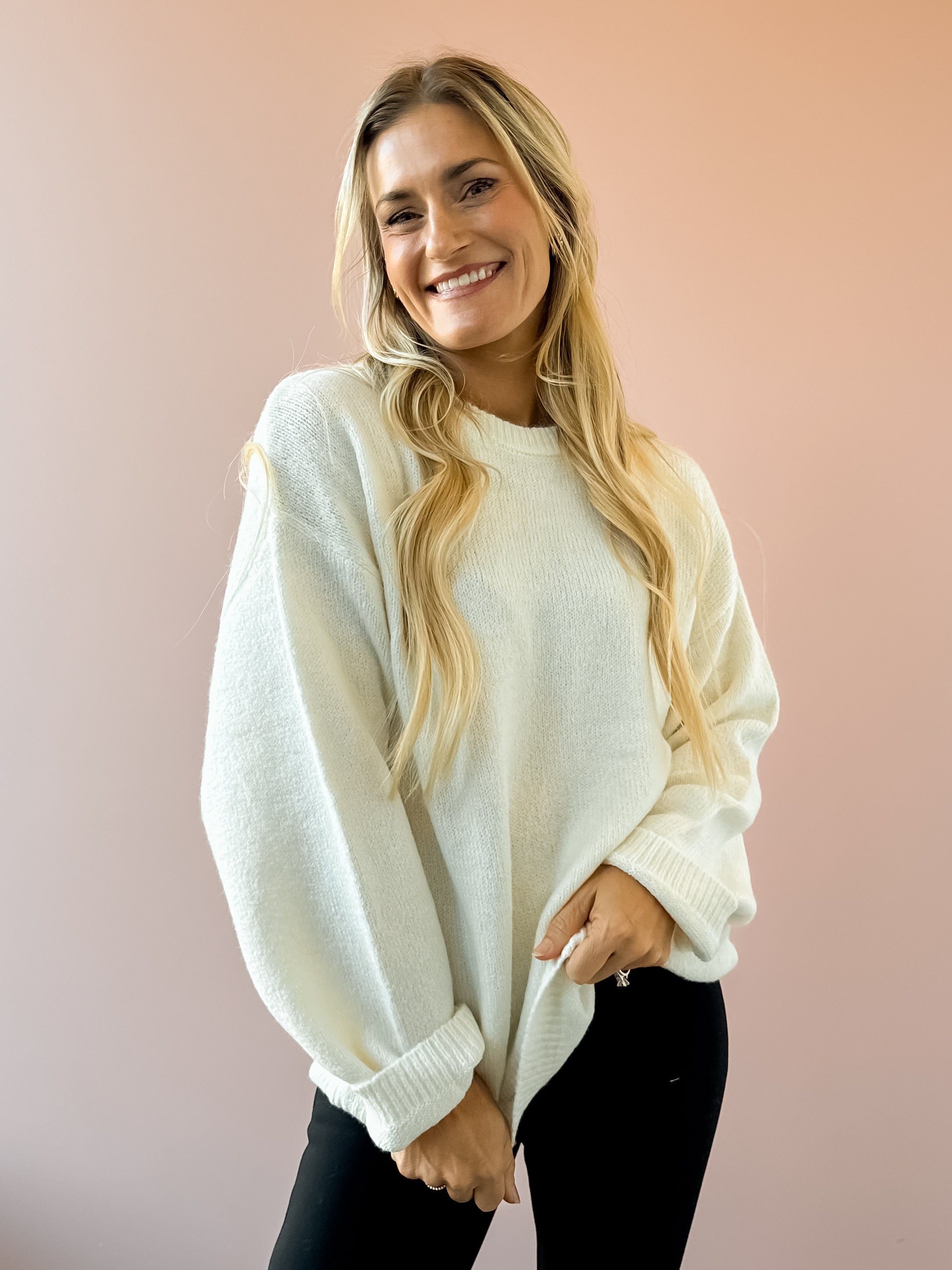 Experience ultimate comfort with the Snowed In Sweater, crafted from soft mohair-blend yarns that offer a cozy, textured feel. Its relaxed fit and crew neck make layering effortless, perfect for transitioning from casual daytime looks to polished evenings. The warm white hue complements any outfit, whether paired with denim and loafers or styled up for a night out.