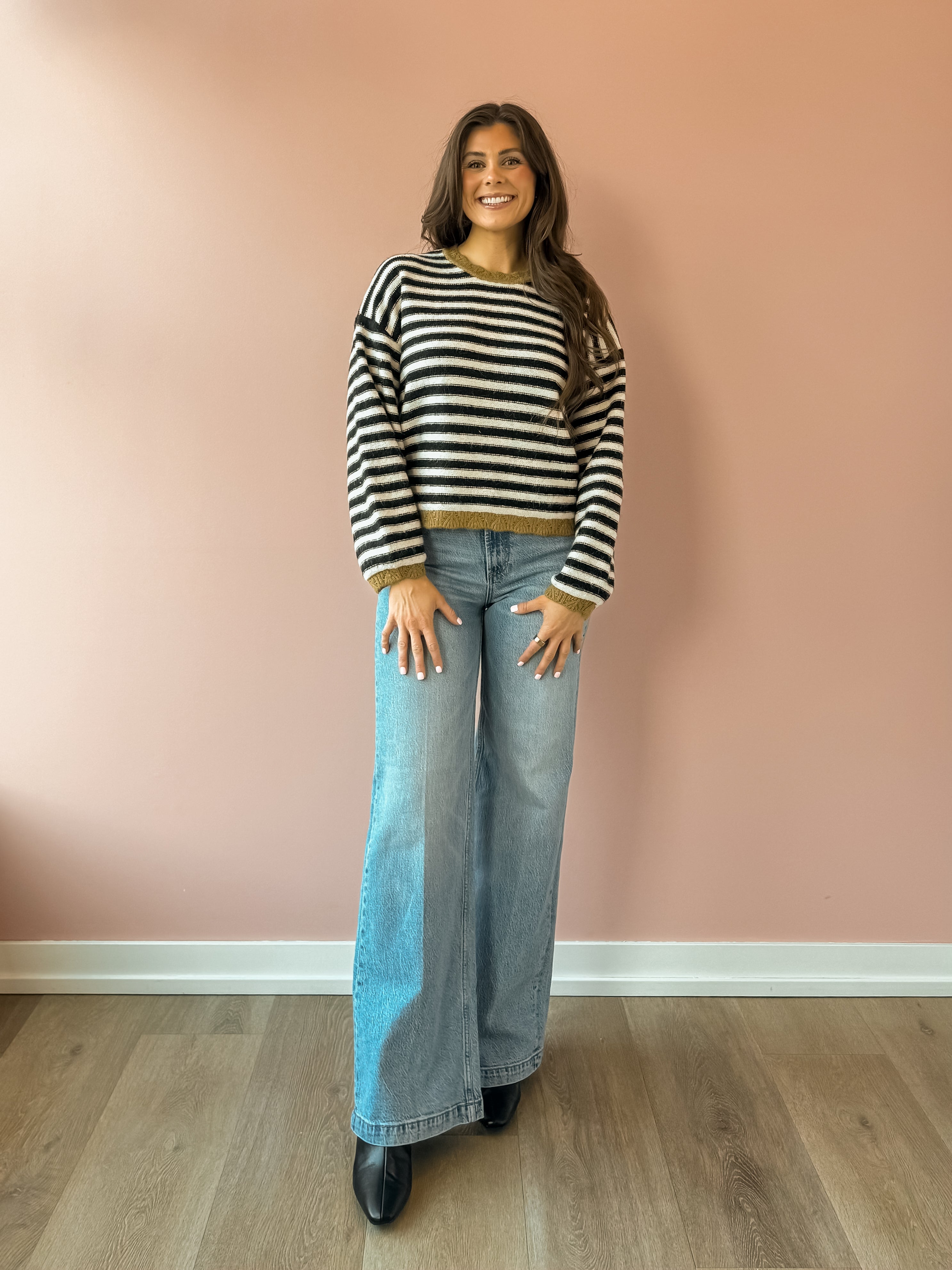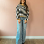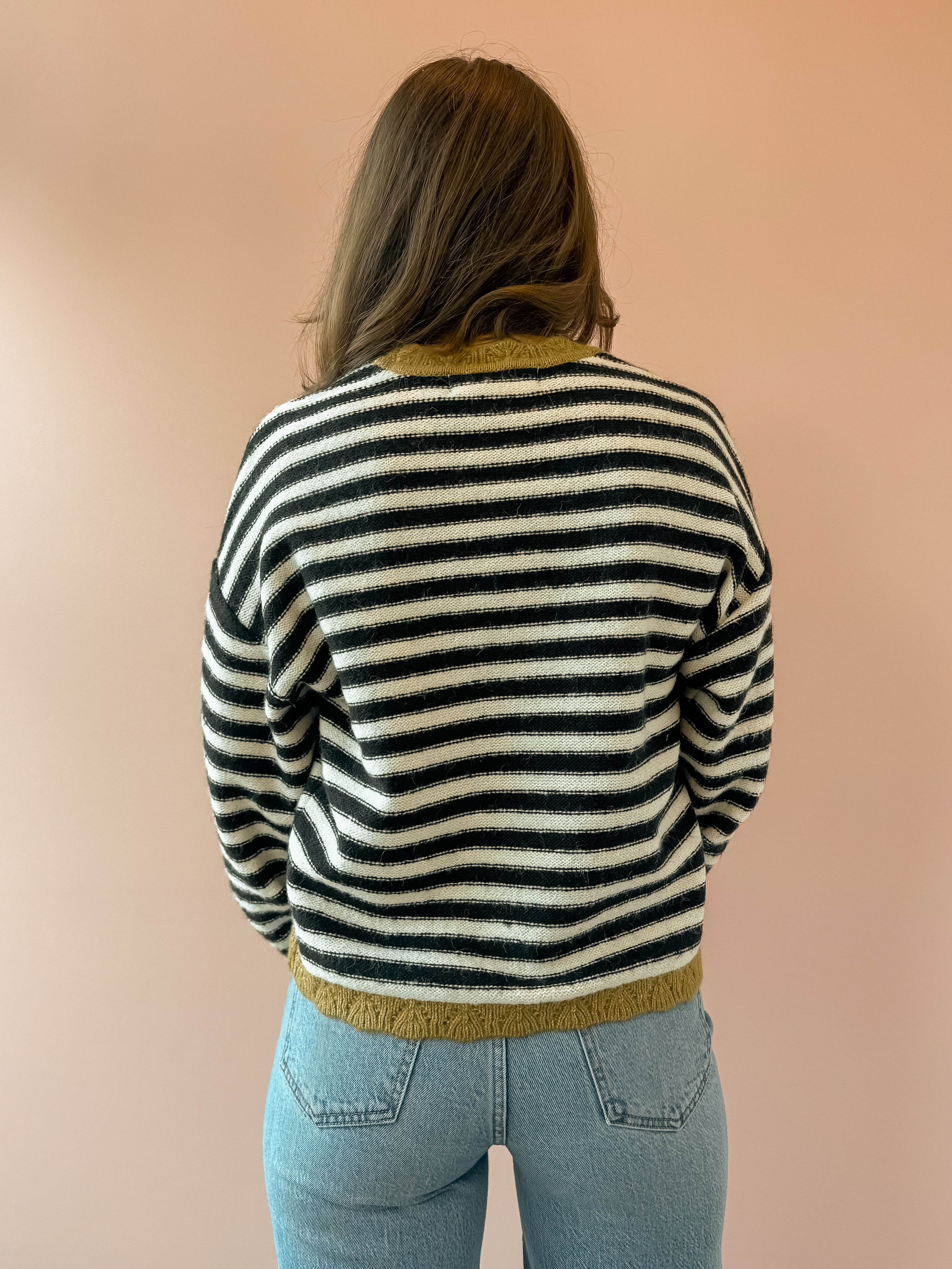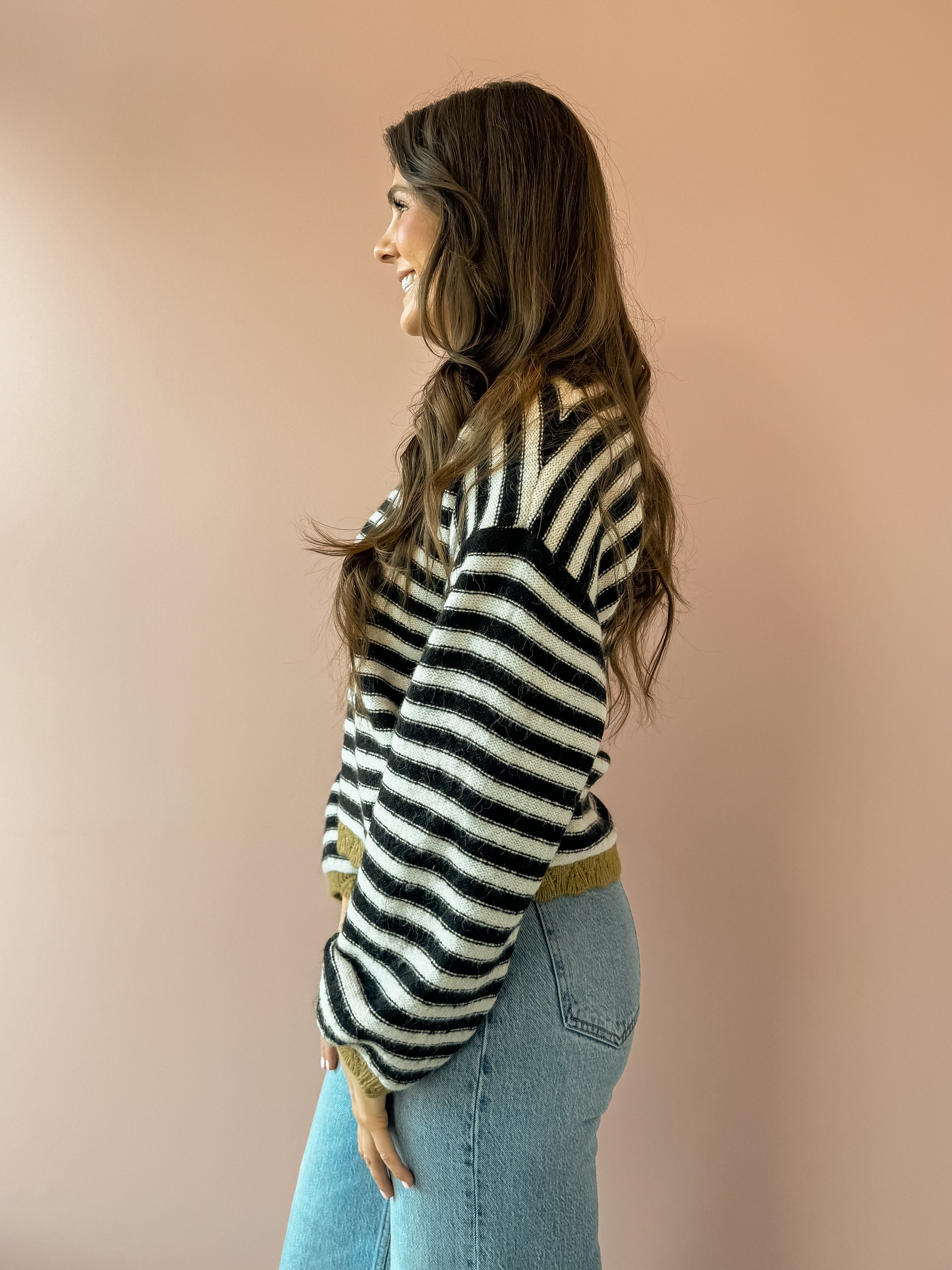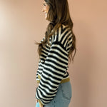 Wrap yourself in effortless comfort with the Stevie Sweater, a must-have layering piece for the season. This oversized sweater features black and white stripes with a green accent, with voluminous balloon sleeves that create a relaxed, on-trend silhouette. The generous fit makes it perfect for pairing with your favorite jeans and boots for a casual-chic look that feels as good as it looks. Ideal for cozy days when you want style without sacrificing comfort.
