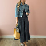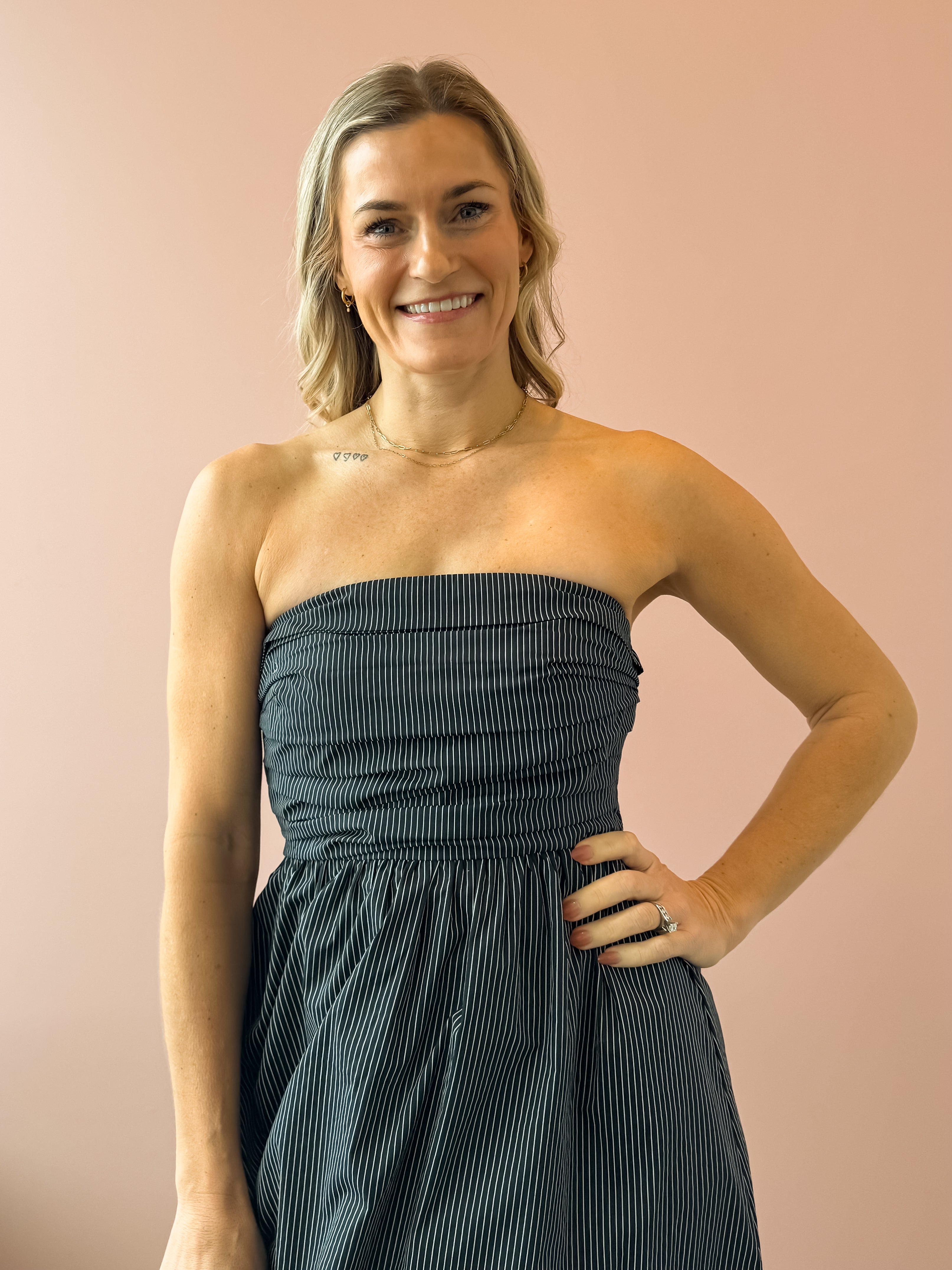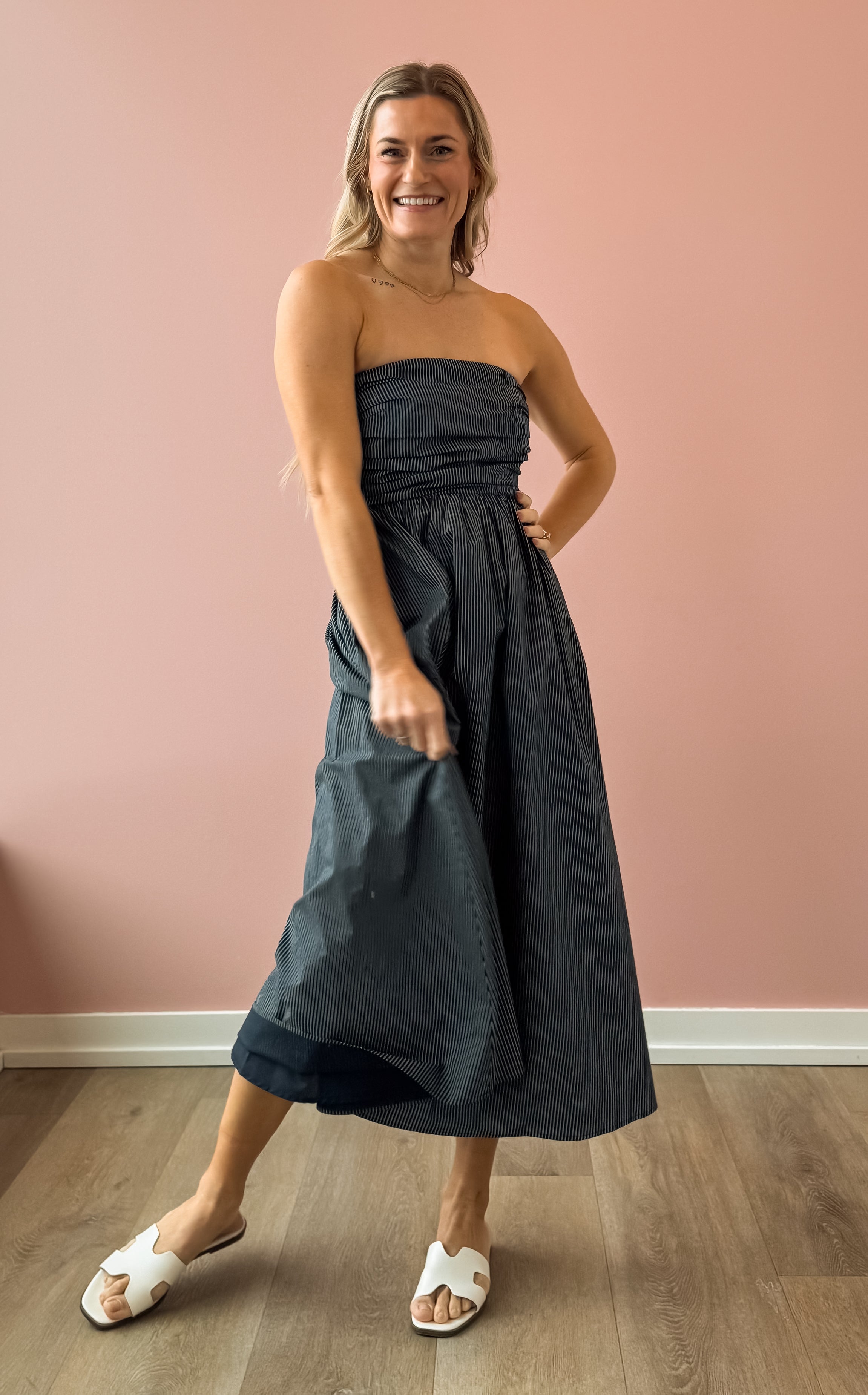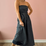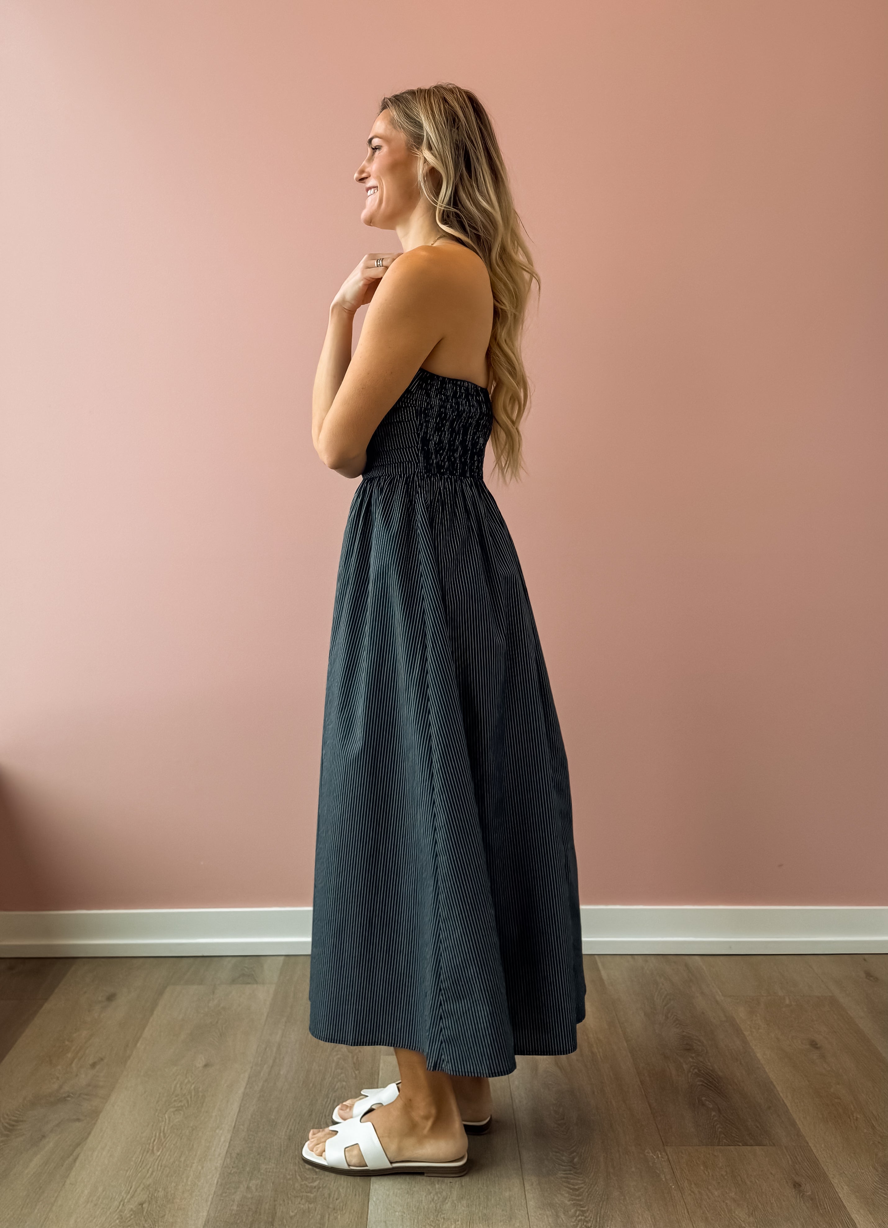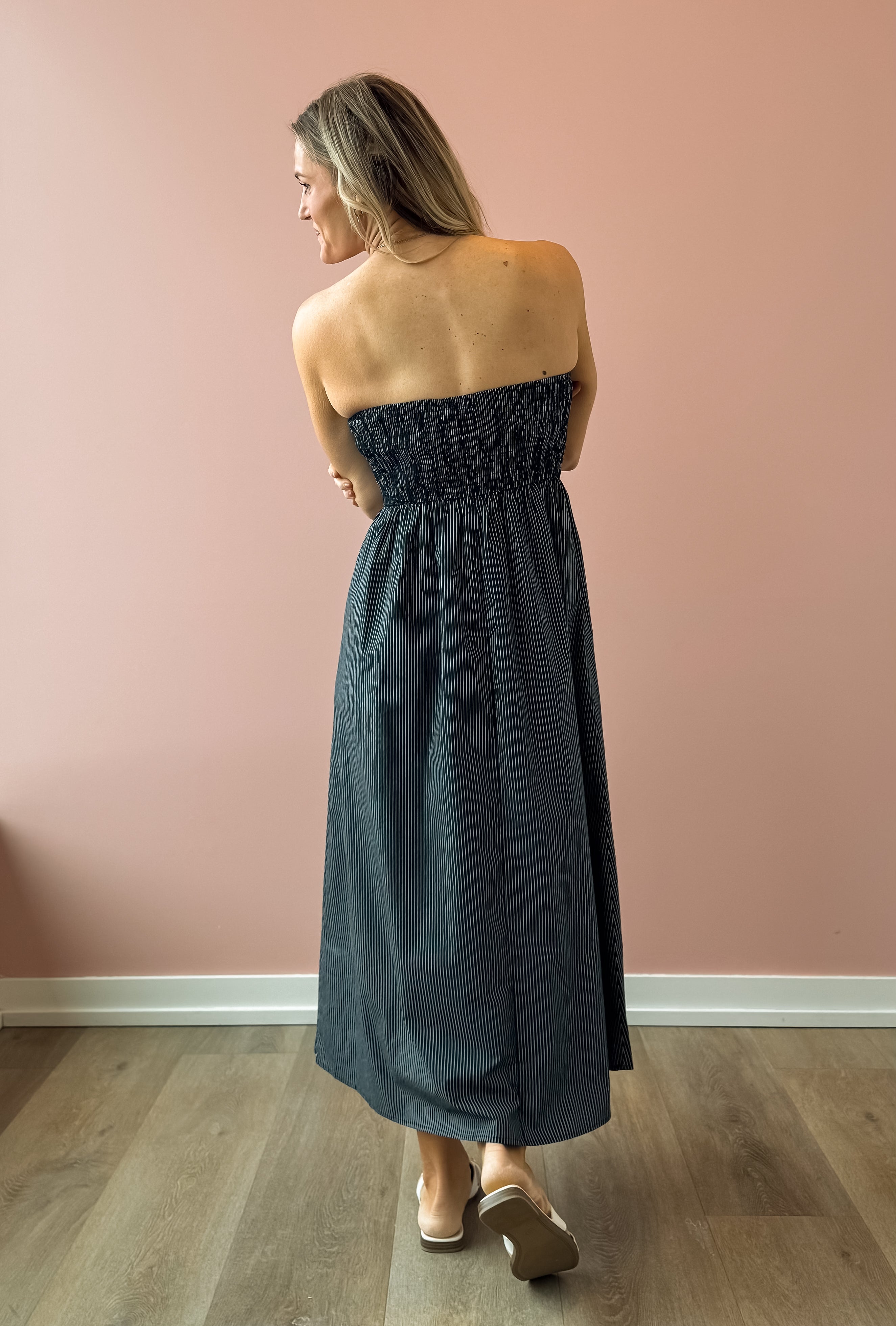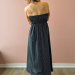 Discover effortless elegance with the Stella Maxi Dress, a versatile piece that transitions seamlessly from day to night. The strapless design with its daring deep V-neckline creates a sophisticated look, while the fitted bodice provides flattering support. An A-line skirt drapes beautifully, offering comfort without compromising style. The classic navy and white stripe pattern is timeless and pairs perfectly with everything in your wardrobe—elevate it with heels for evening events or keep it casual with sneakers and a jacket for laid back weekends.