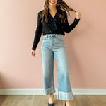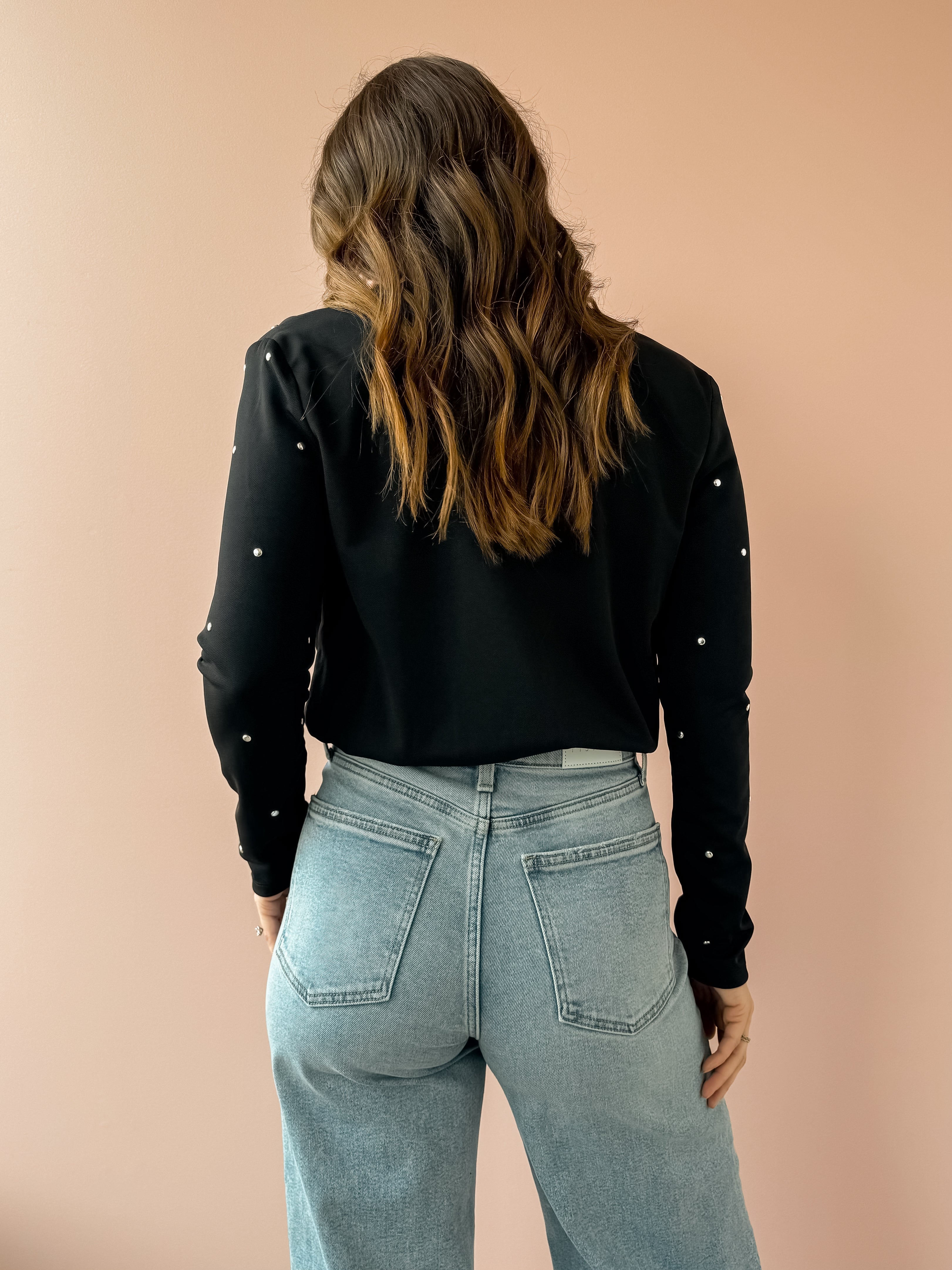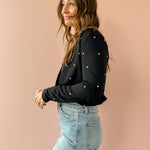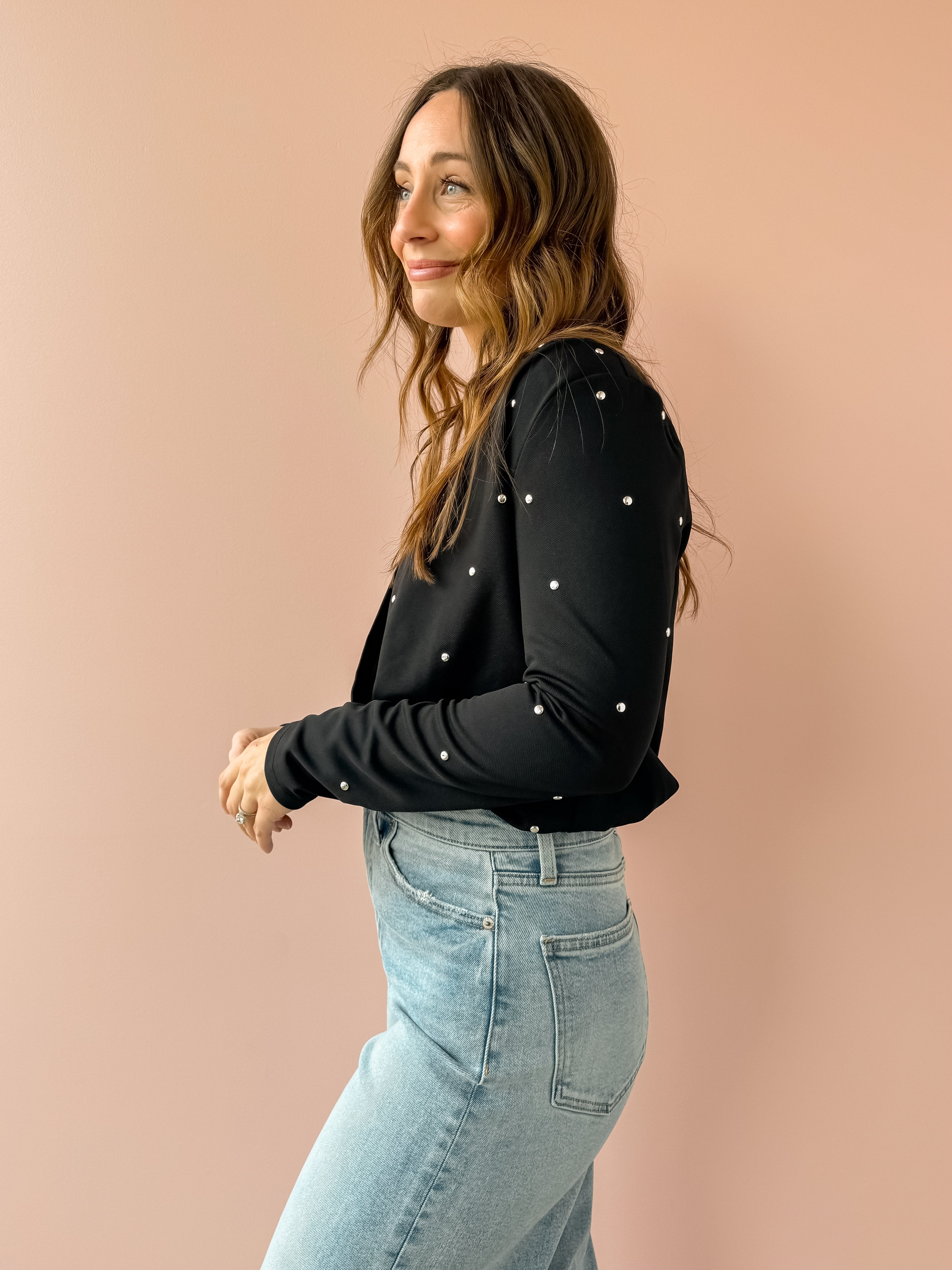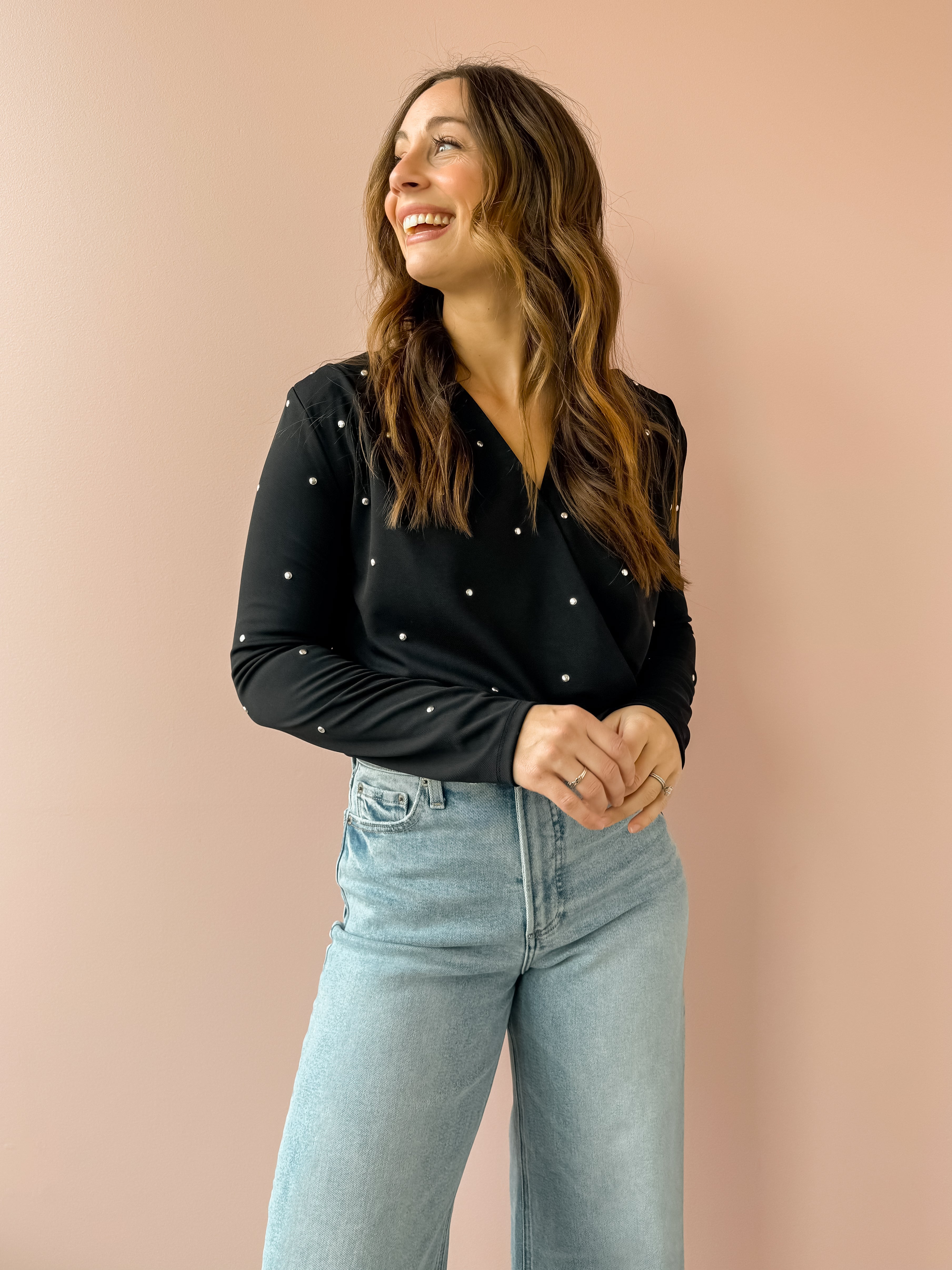 Elevate your holiday wardrobe with the Sarah Studded Bodysuit—a show-stopping piece that combines edge with elegance. This long-sleeve design features a daring deep V-neckline and all-over studs for instant glamour, while decorative shoulder caps add festive flair. Pair it with denim and black boots for a night out or holiday celebration that turns heads.