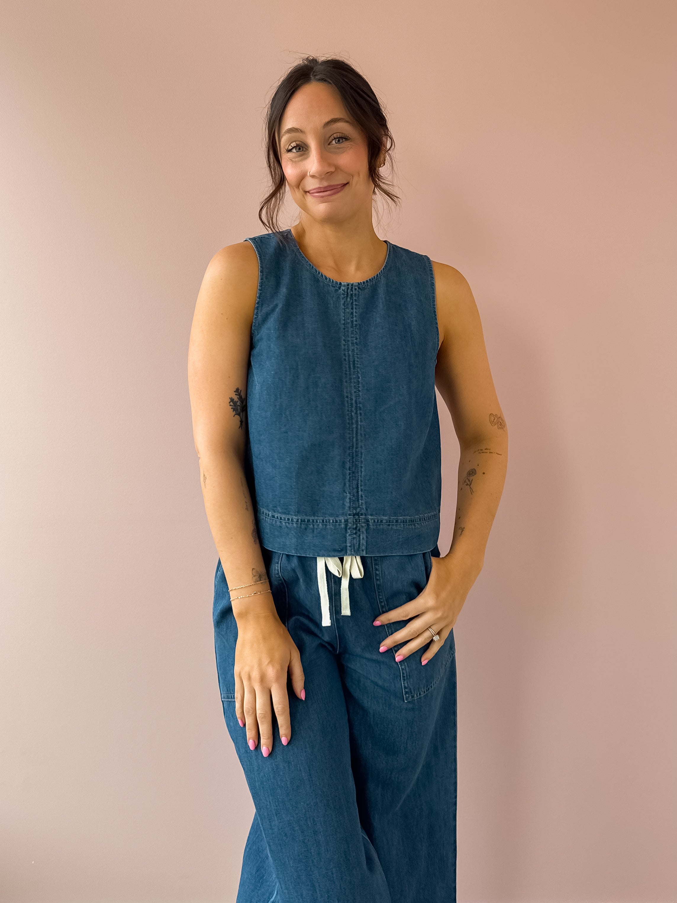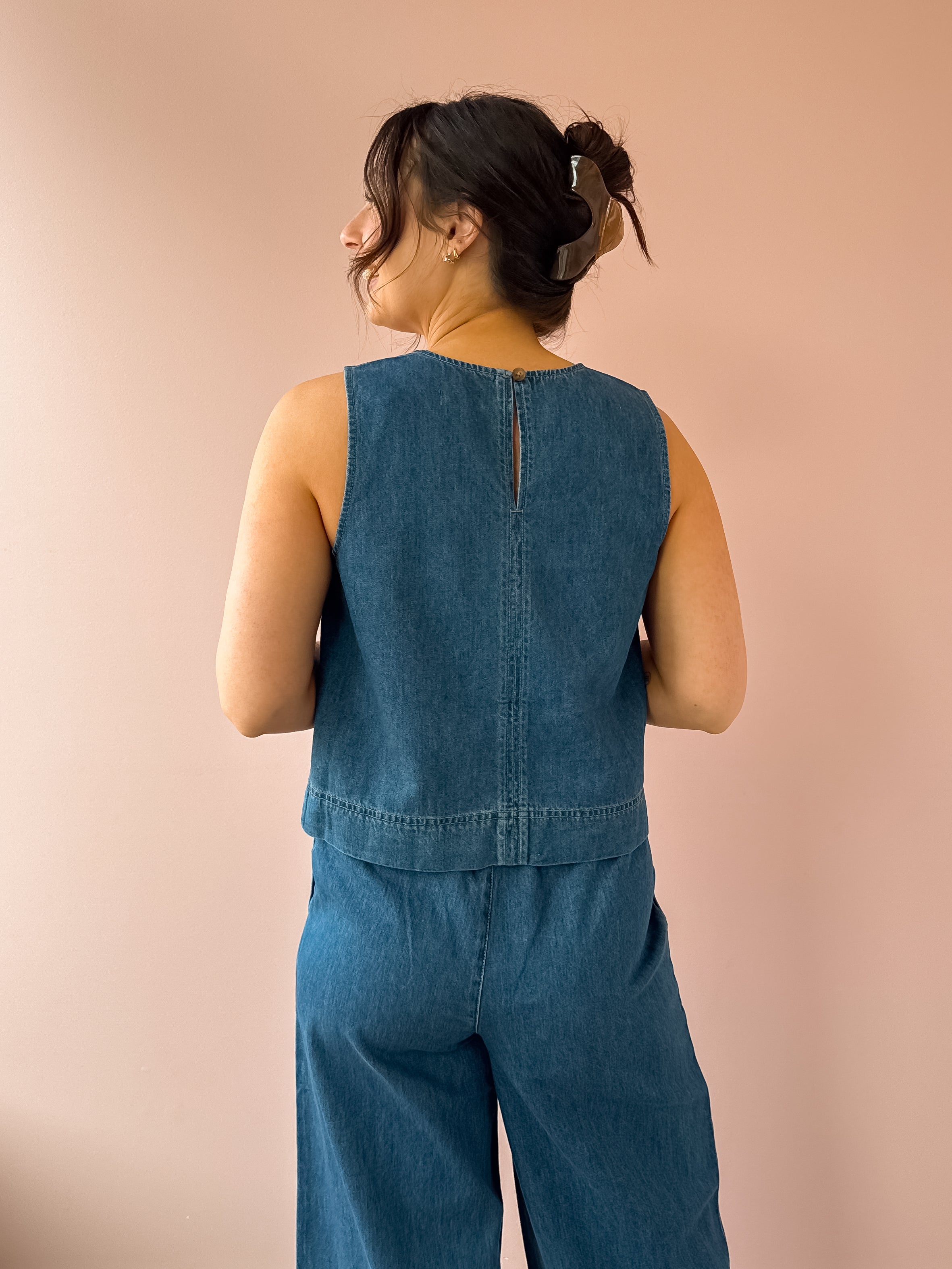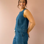 A modern essential with a timeless feel, this ultra-soft crop top is crafted from 100% cotton denim for effortless, everyday style. Designed with a classic crew neckline and clean sleeveless silhouette, it delivers a relaxed yet polished look that’s easy to wear season after season. Pair it with the Daycation Denim Pant for a coordinated look or style it with a linen trouser for laid-back appeal. An easy staple you’ll reach for again and again!