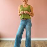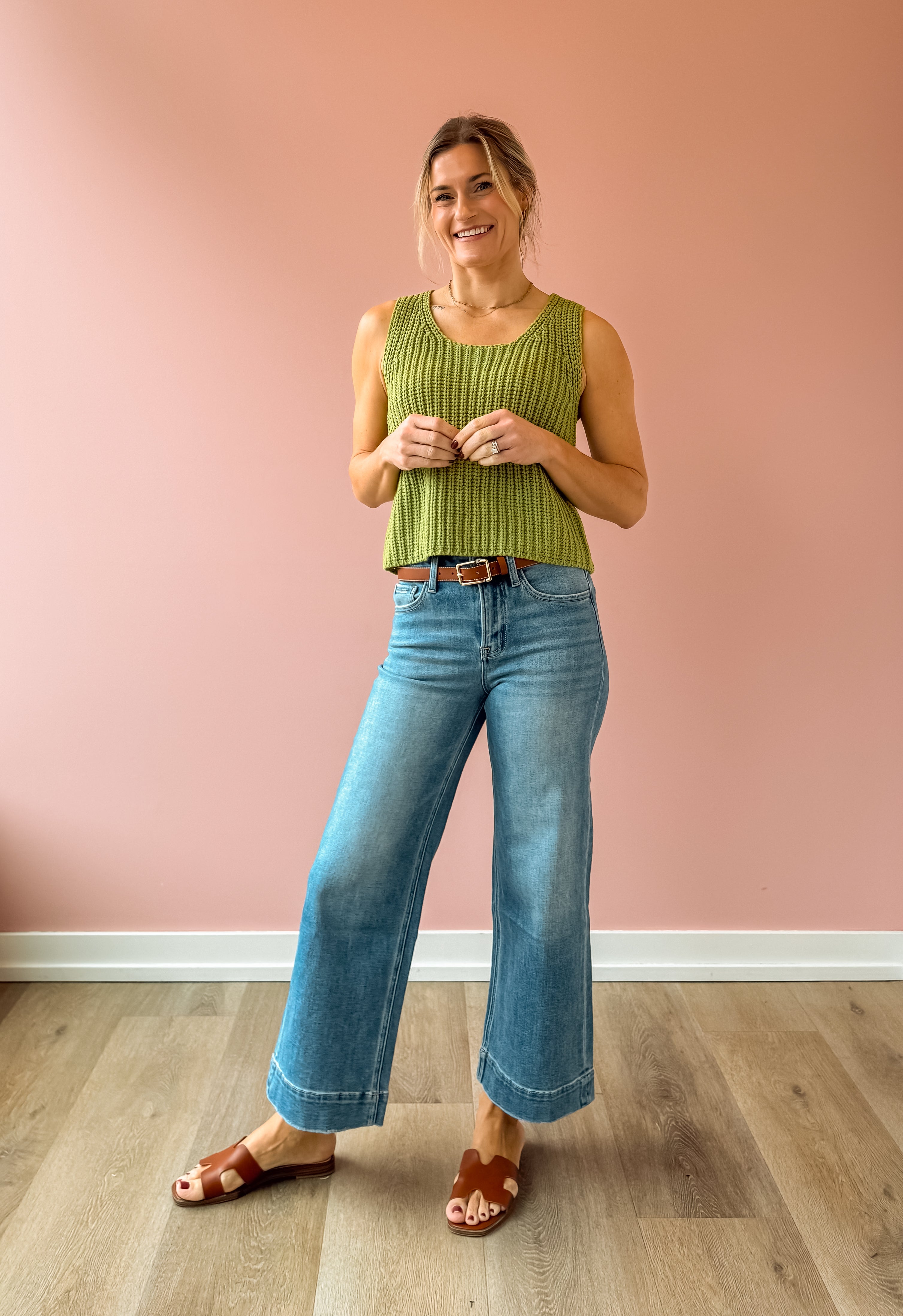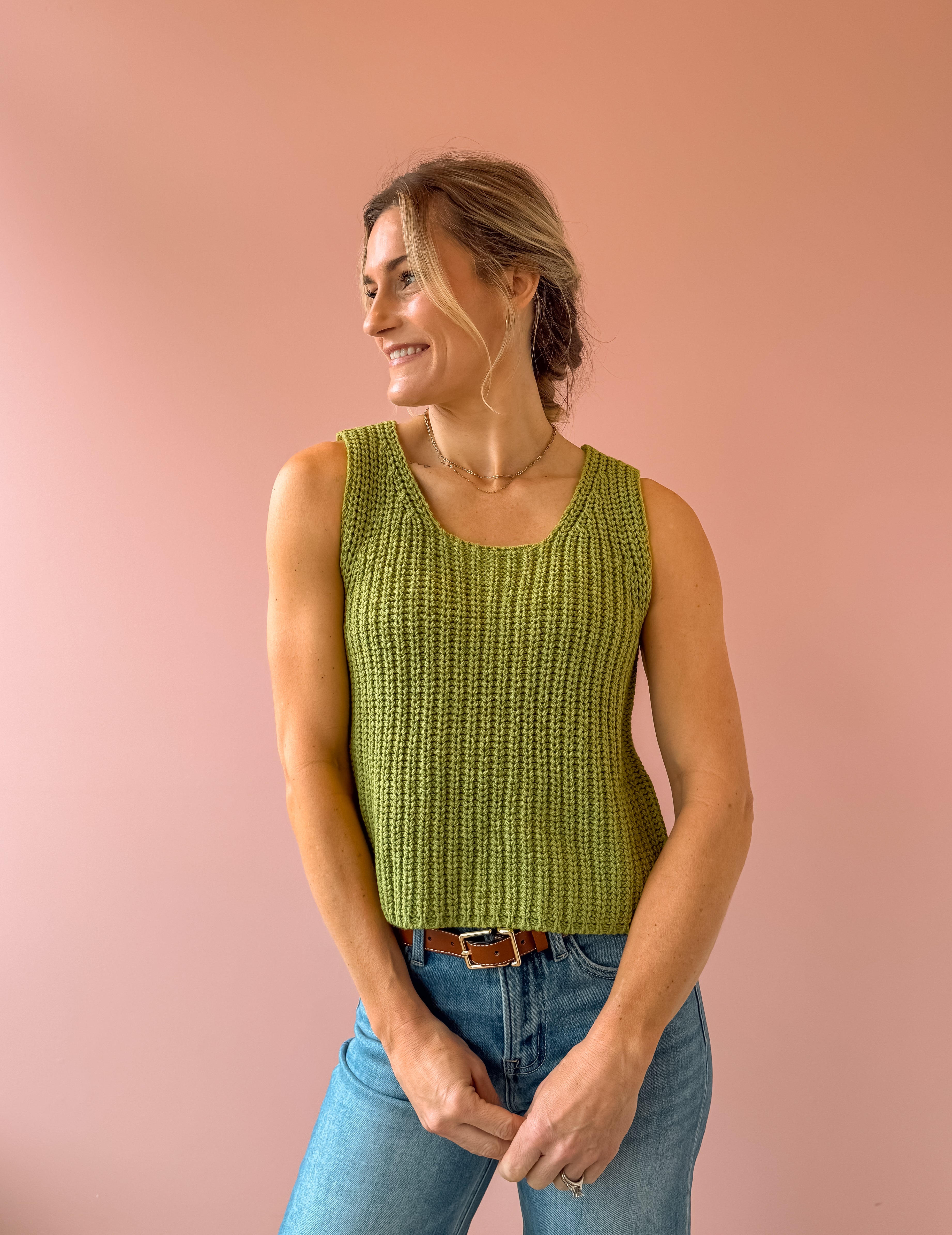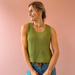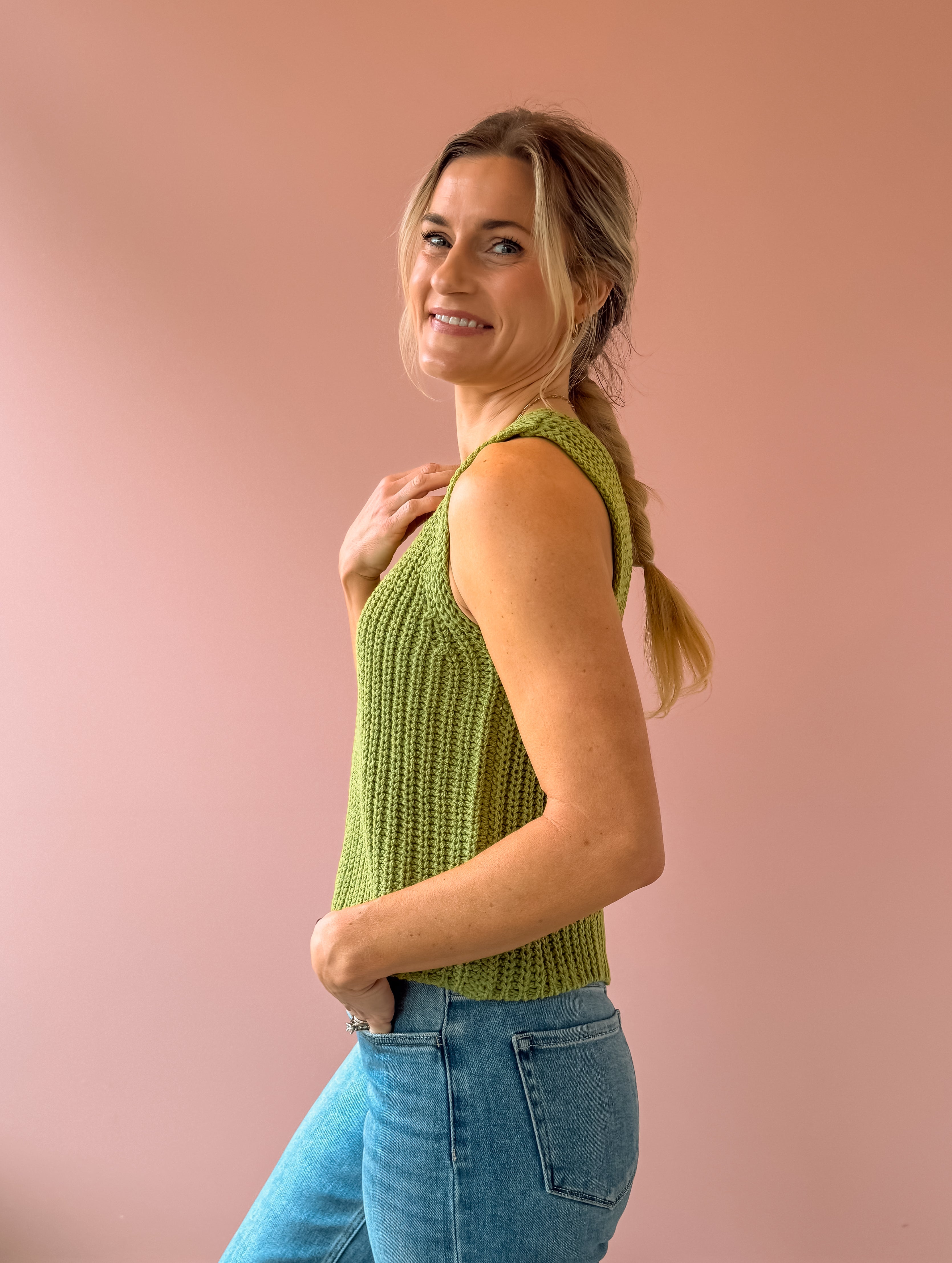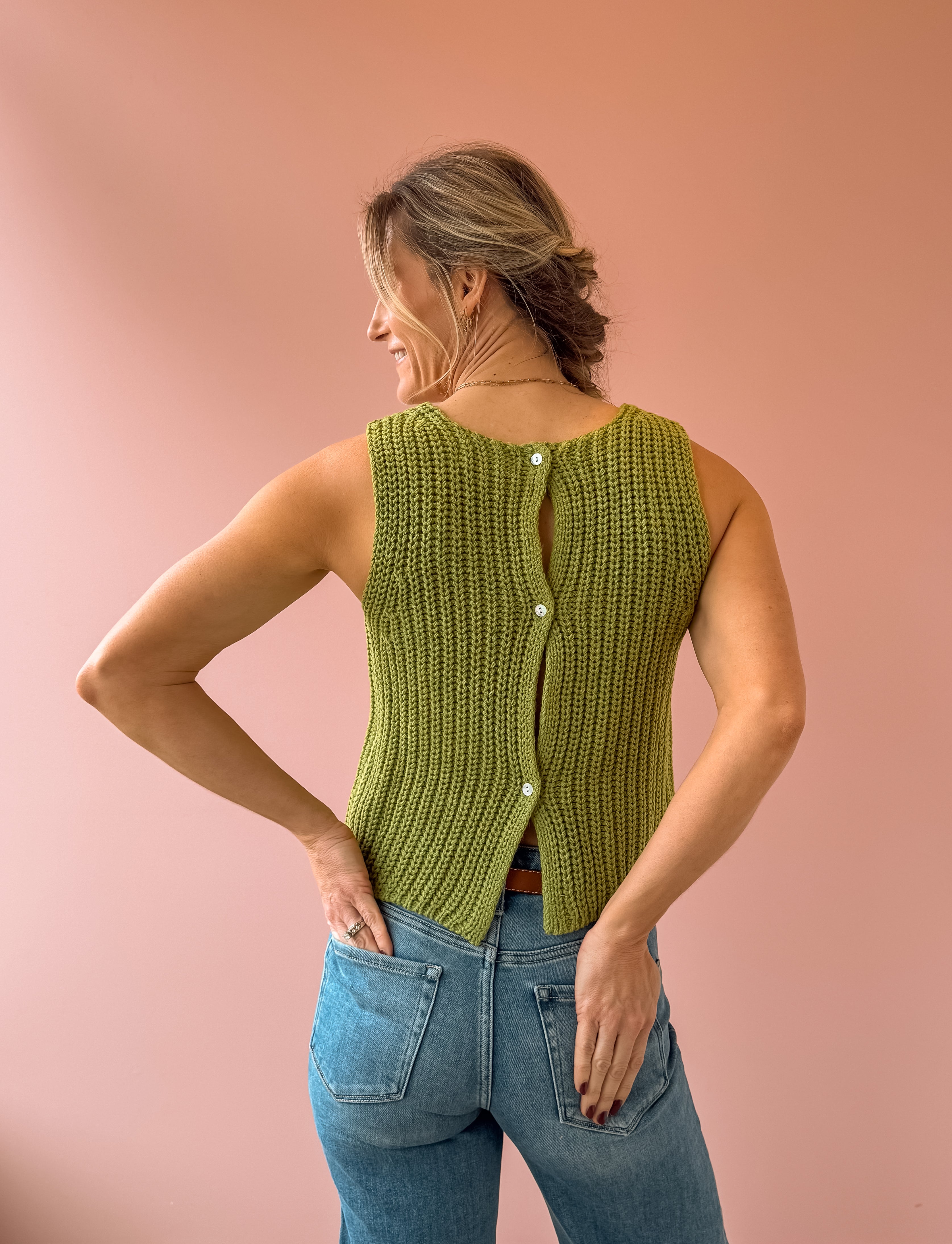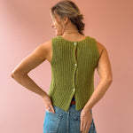 Elevate your casual wardrobe with this timeless green sweater tank. Crafted from soft, luxurious sweater knit, it features wide supportive straps and a flattering scoop neckline. Distinctive button closures along the back add an unexpected touch of sophistication. Perfect for layering on cooler evenings, pair it effortlessly with denim shorts, jeans, or your favorite bottoms and sandals for an understated, polished look.