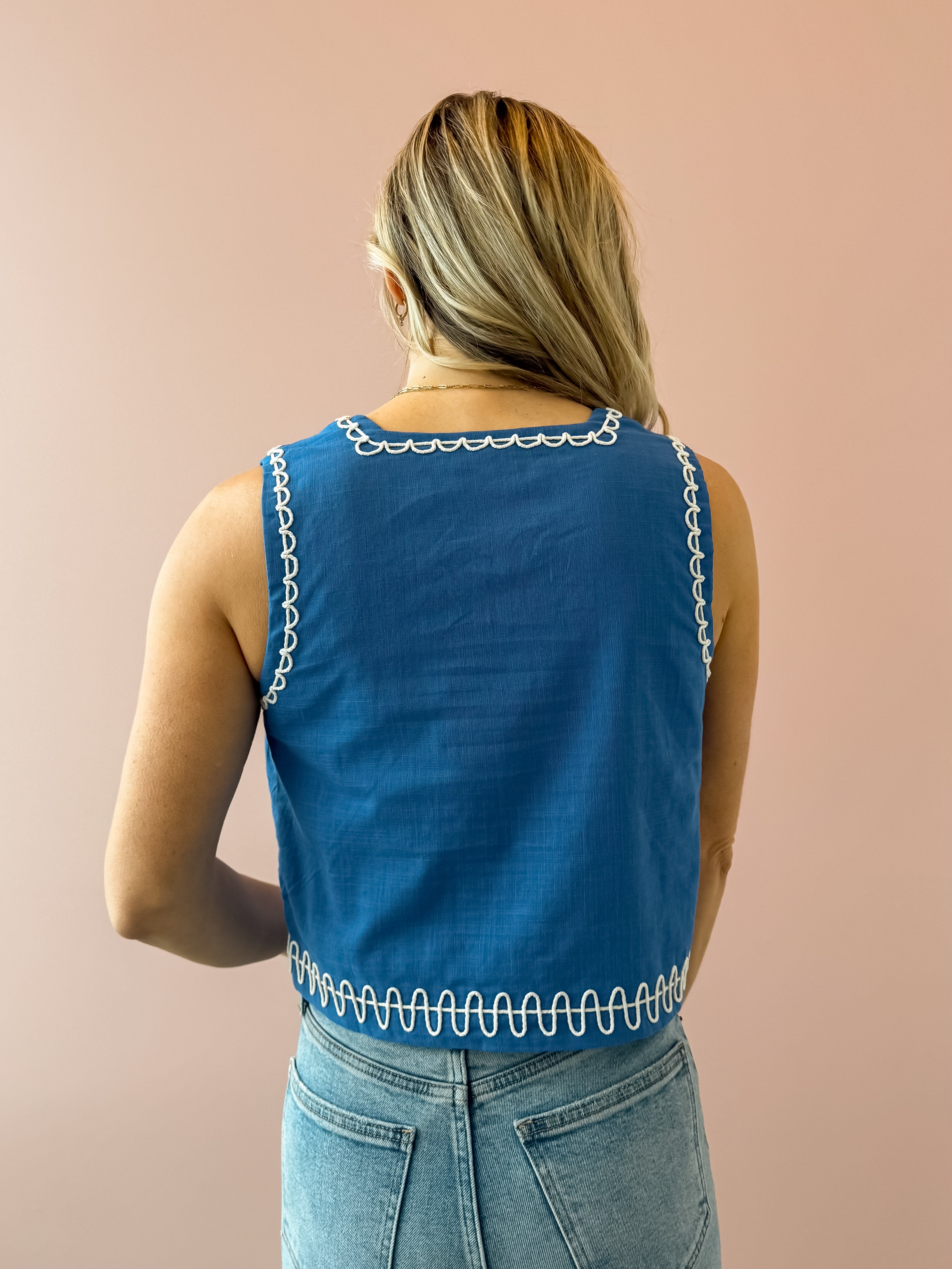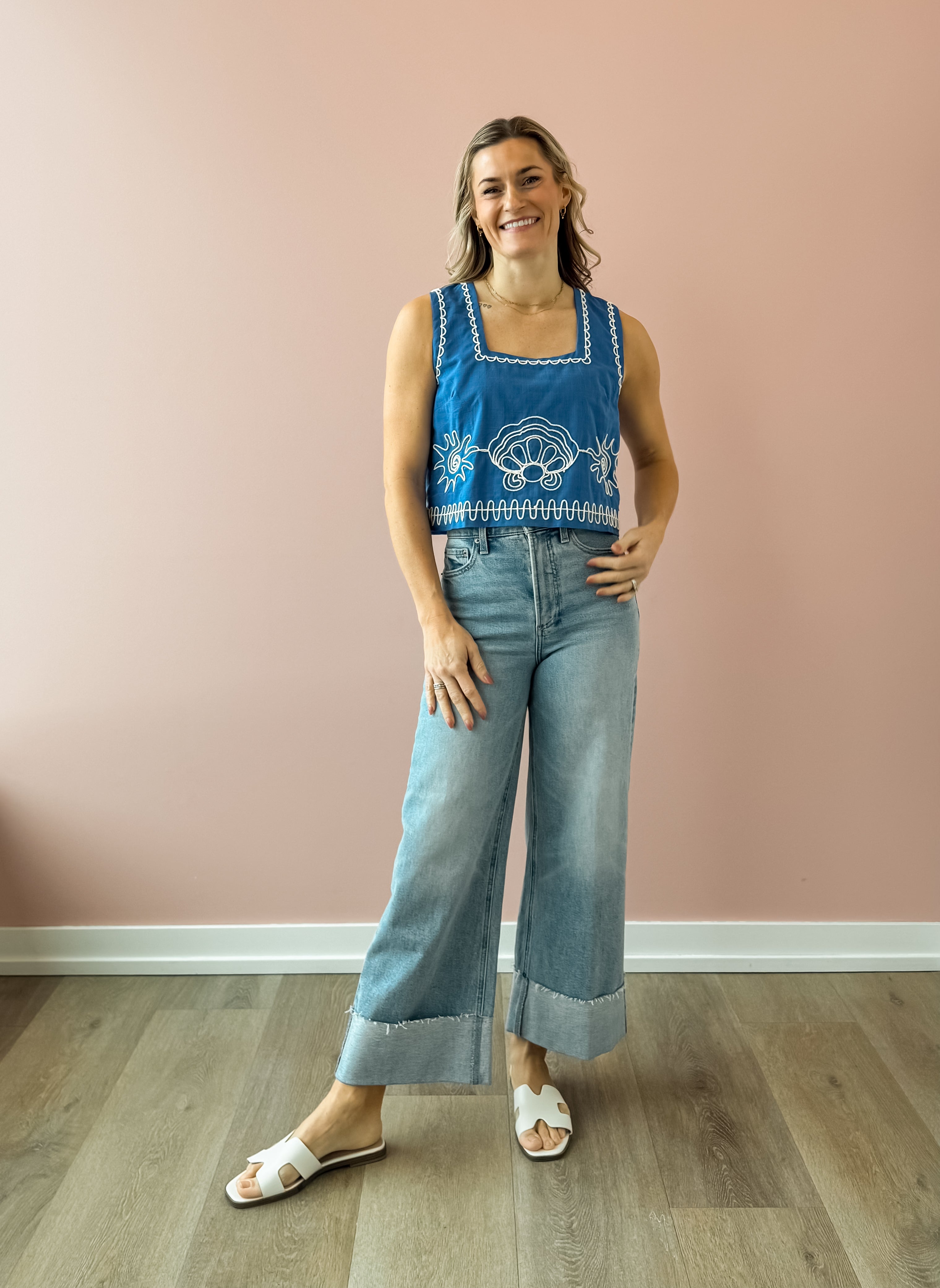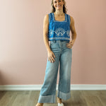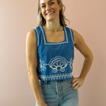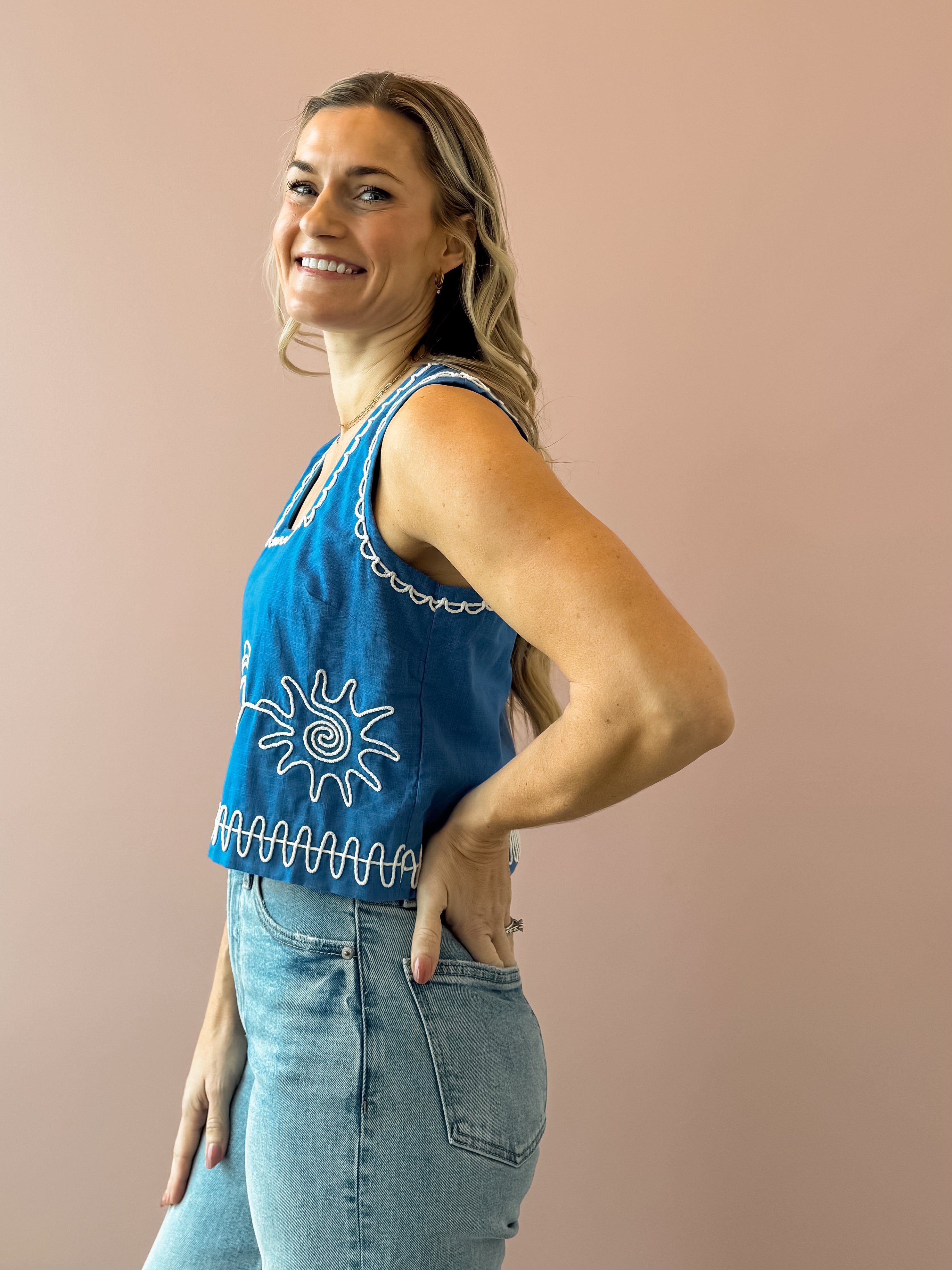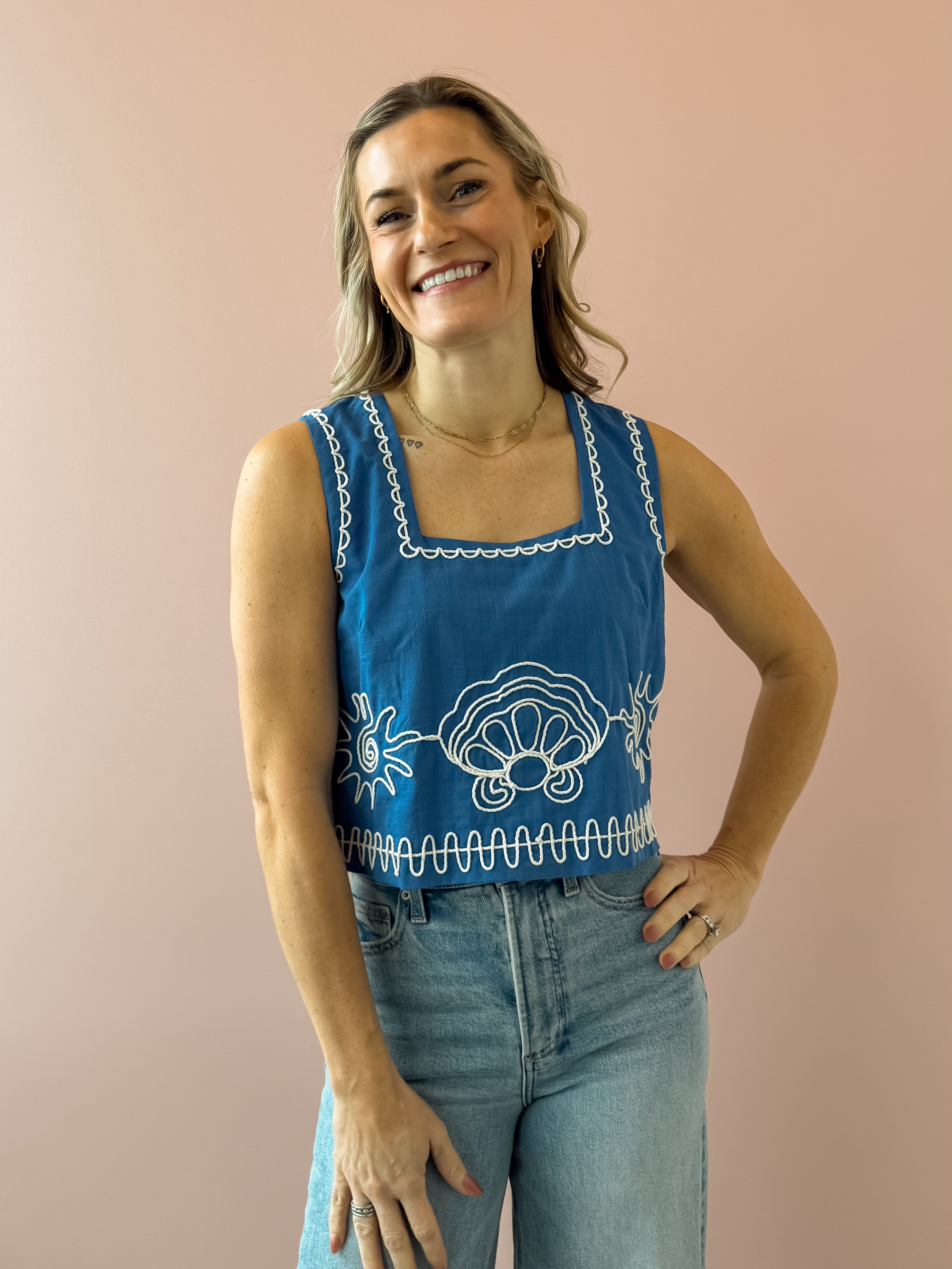 This royal blue tank top features delicate white sun and seashell detailing for a fresh, coastal touch. Designed with a flattering square neckline, semi-cropped length, and an easy, flowy fit, it drapes beautifully without clinging. Lightweight and effortless, it’s perfect for warm days and relaxed evenings, pairing seamlessly with high-rise denim, tailored shorts, or a breezy linen pant for an easy, polished look.