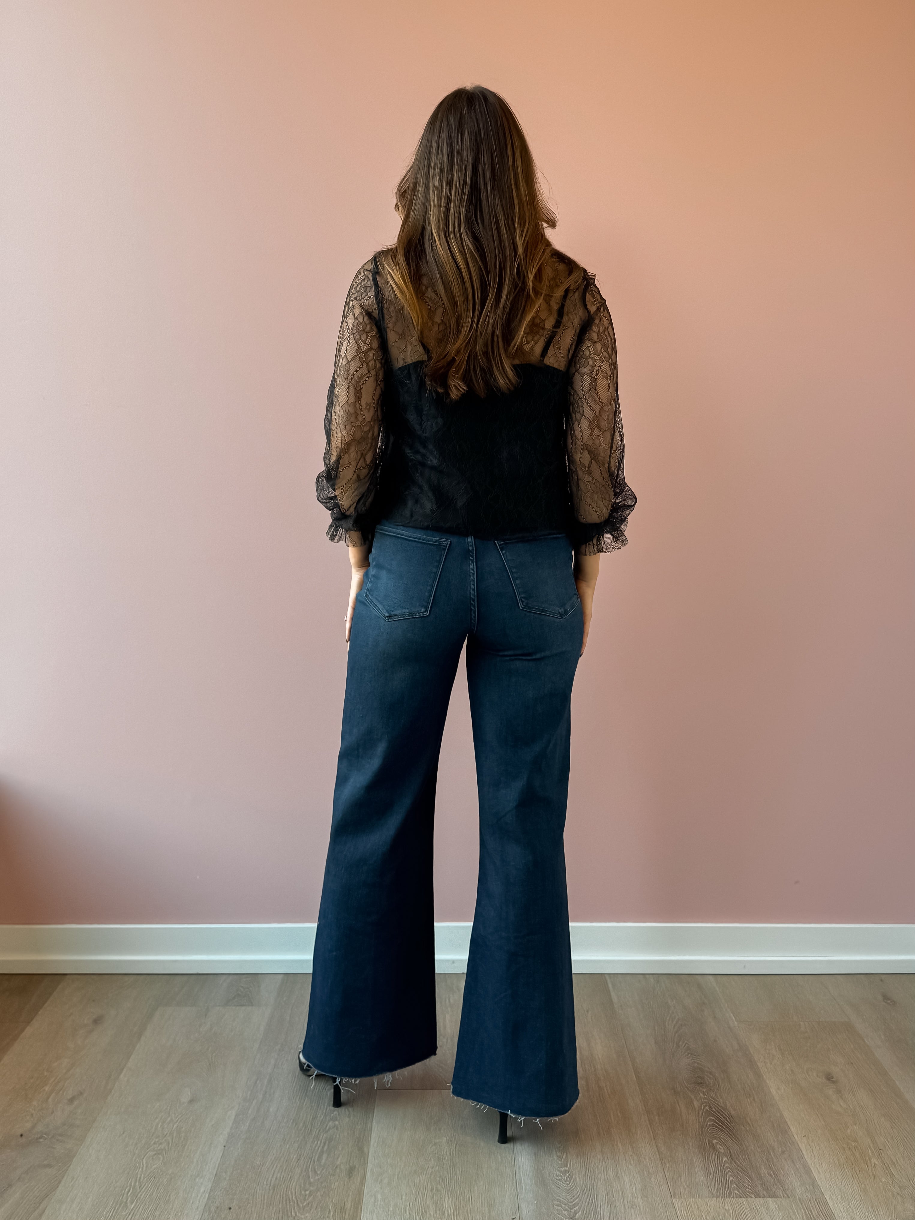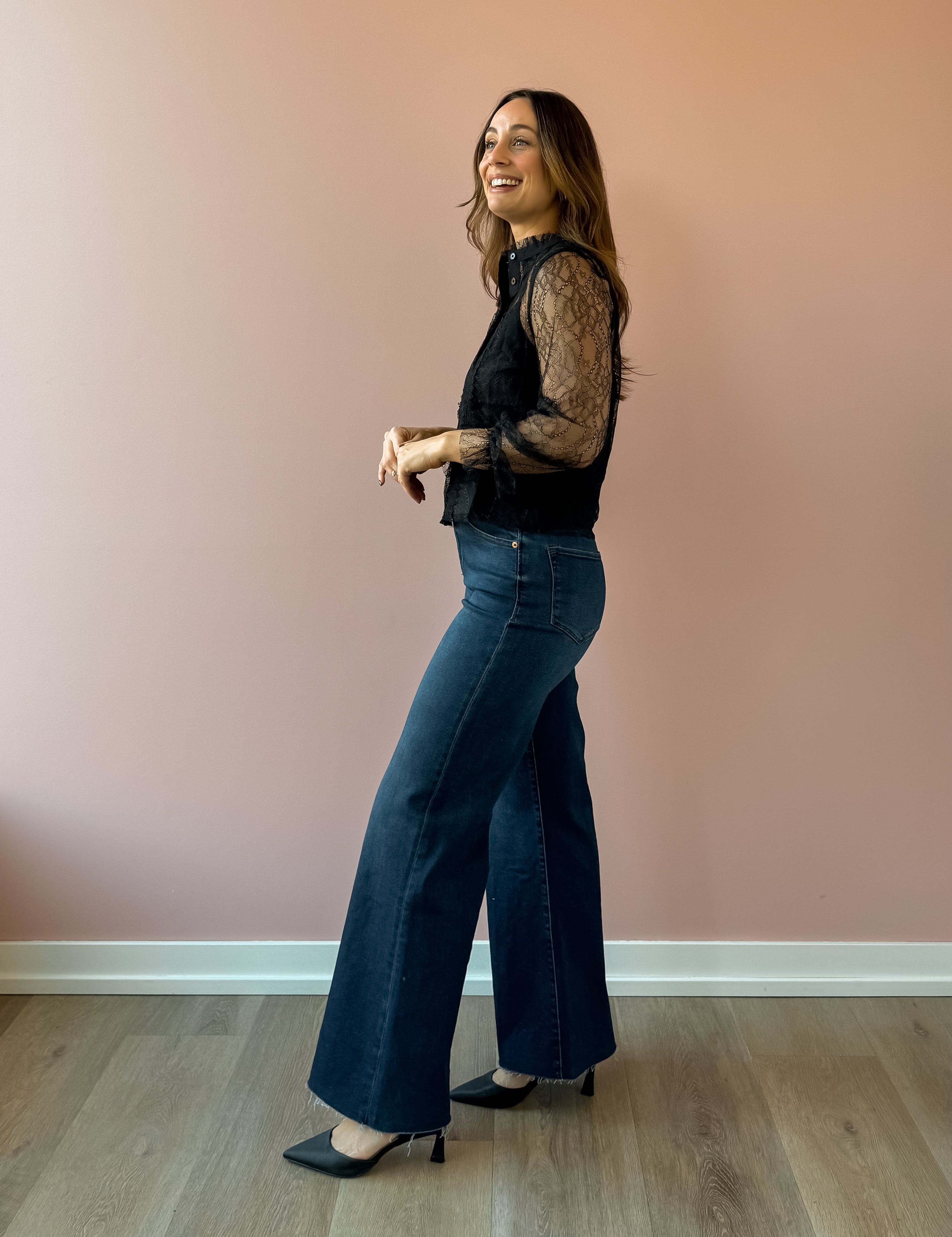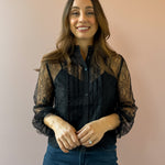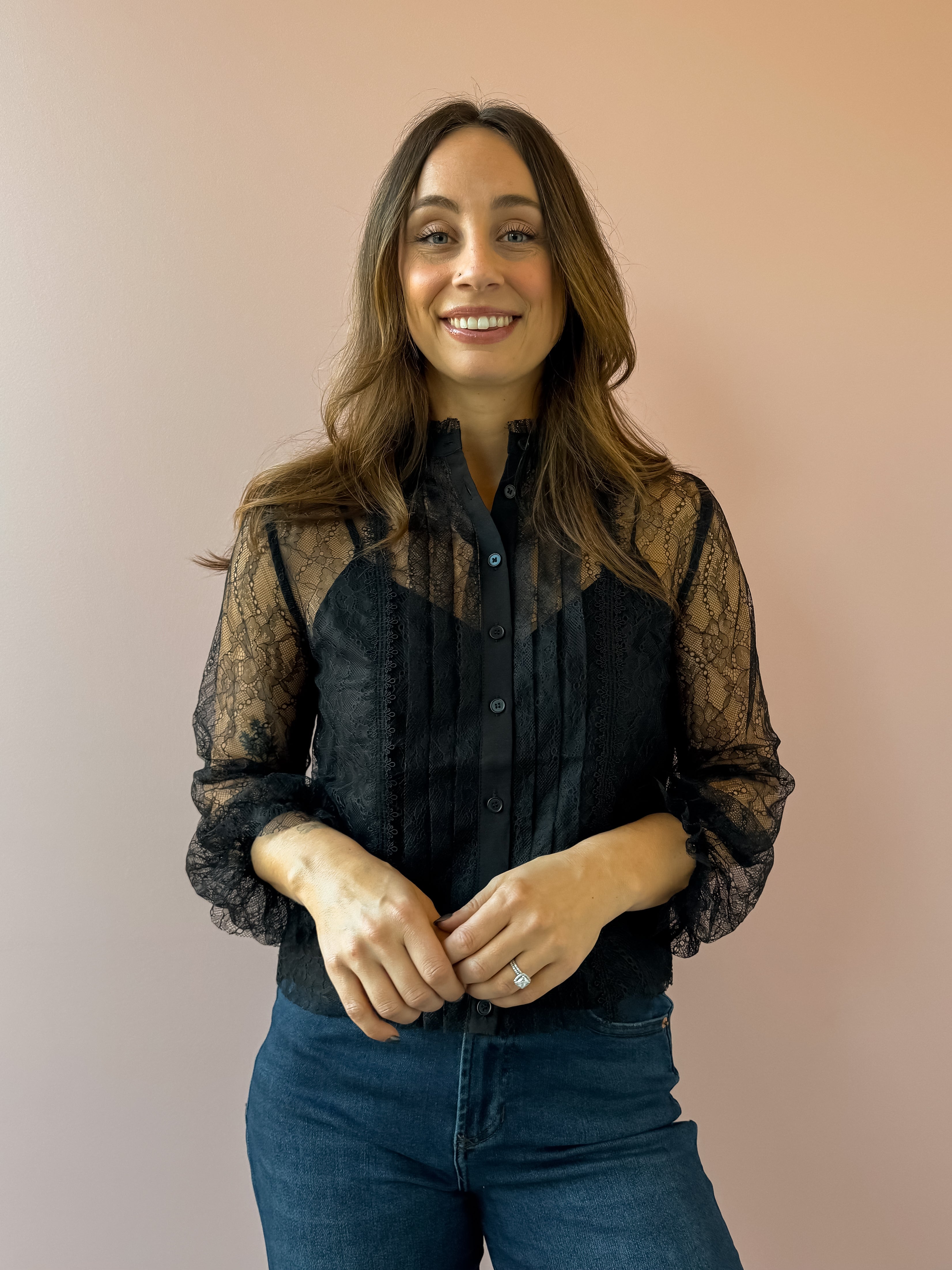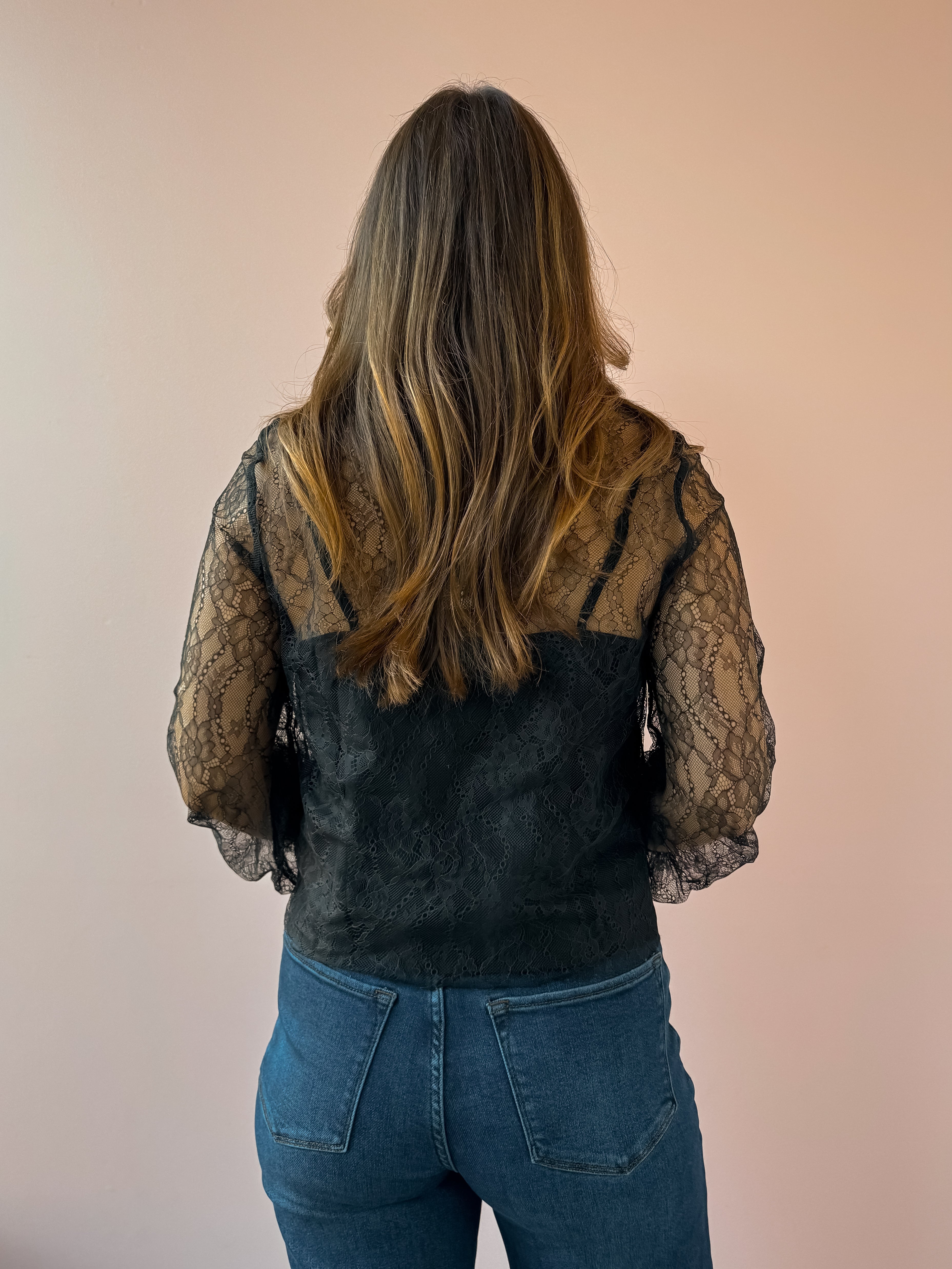 Elevate your wardrobe with the Lizette Top, a sophisticated long sleeve piece that blends classic elegance with a touch of edge. Featuring a sleek black slip tank layered beneath a delicate lace button-up, this top effortlessly transitions from day to night. Pair it with your favorite denim and heels to create a chic, confident look perfect for any night out.