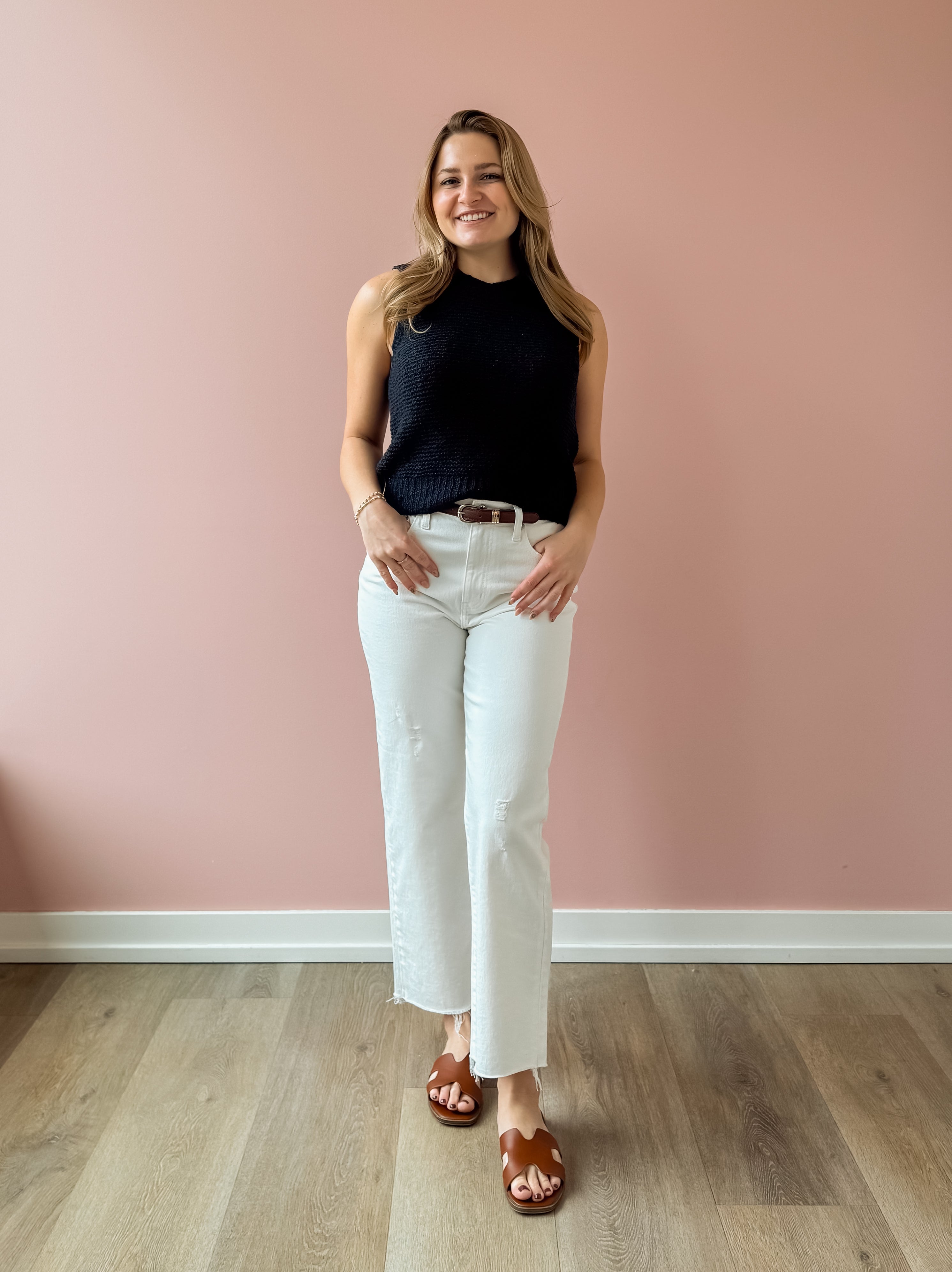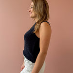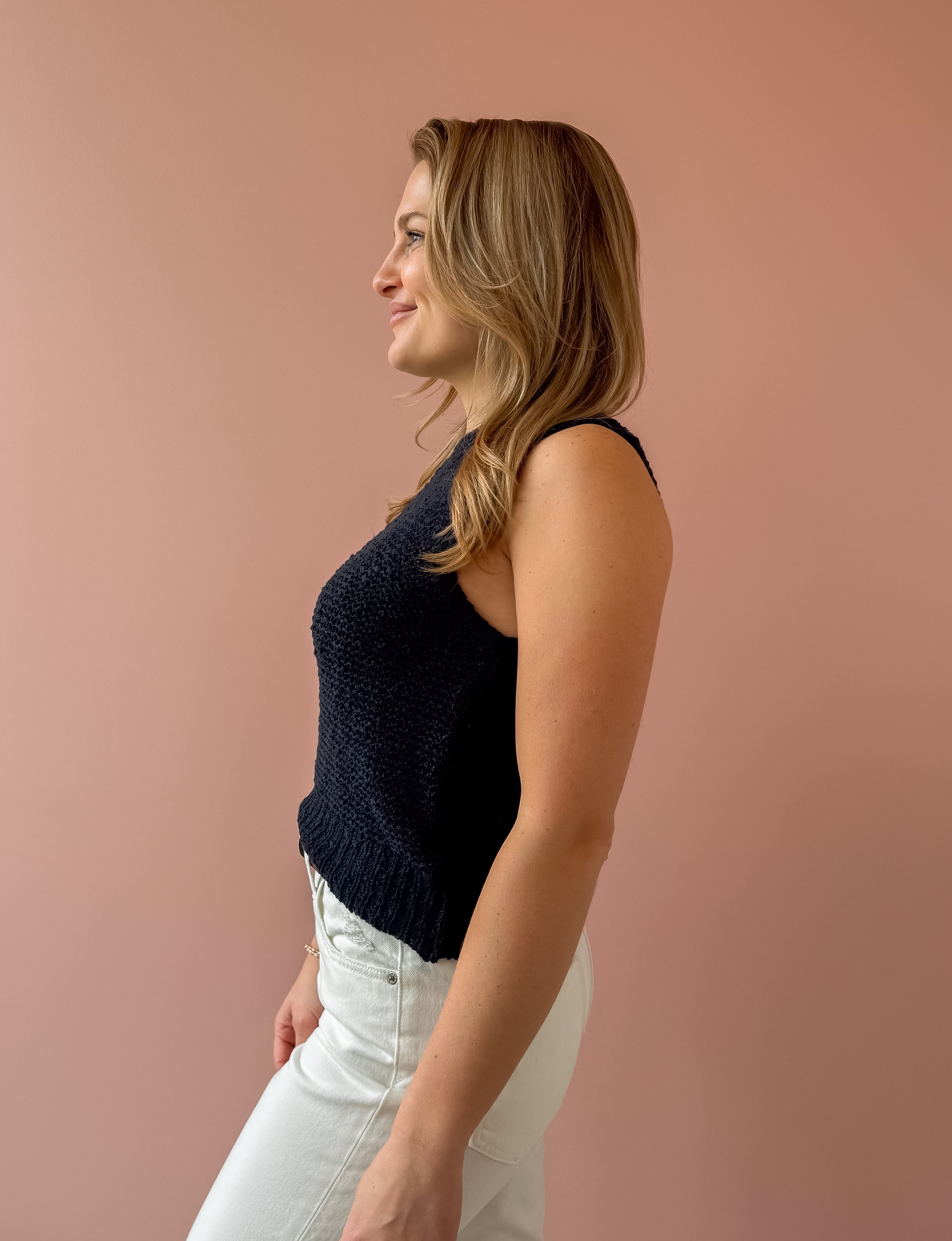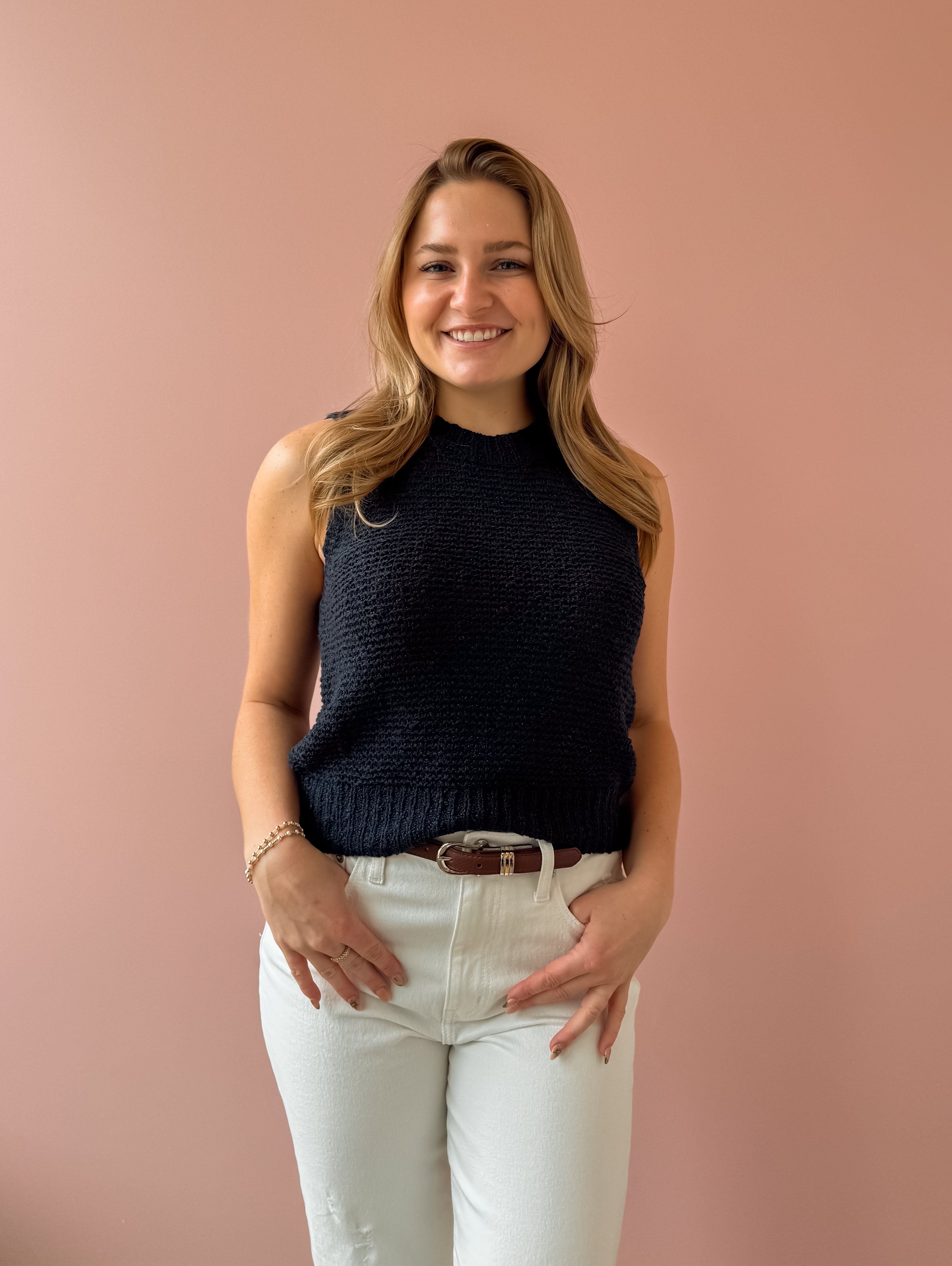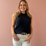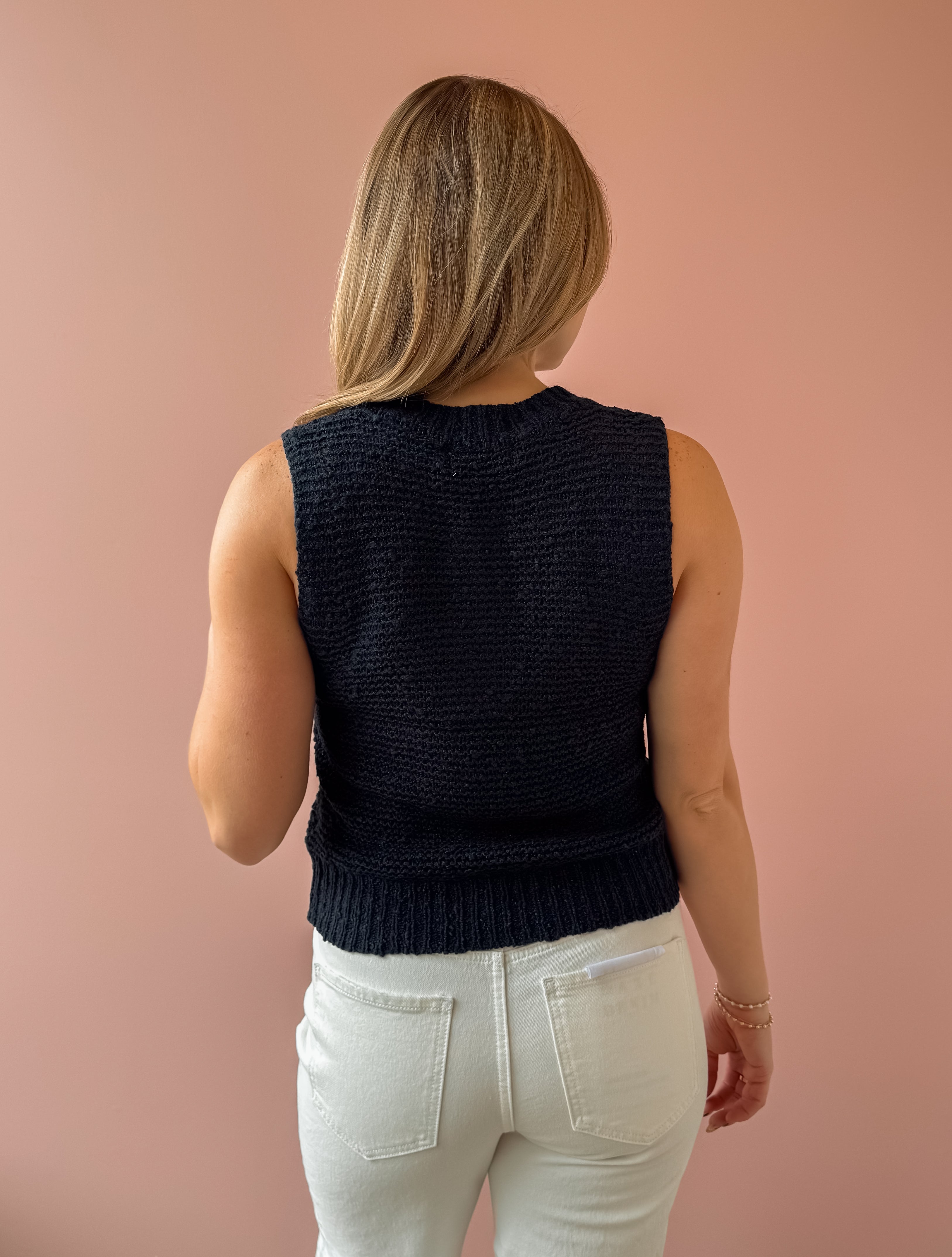 Classic with a modern edge, this navy knit sweater vest is the layering piece your wardrobe has been waiting for. Designed with a timeless crew neckline and a slightly cropped silhouette, it features a rich textured knit that adds depth while keeping the look clean and refined. The sleeveless cut and ribbed hem create a flattering, easy fit that pairs effortlessly with high-rise denim, tailored trousers, or layered over a crisp button-down.