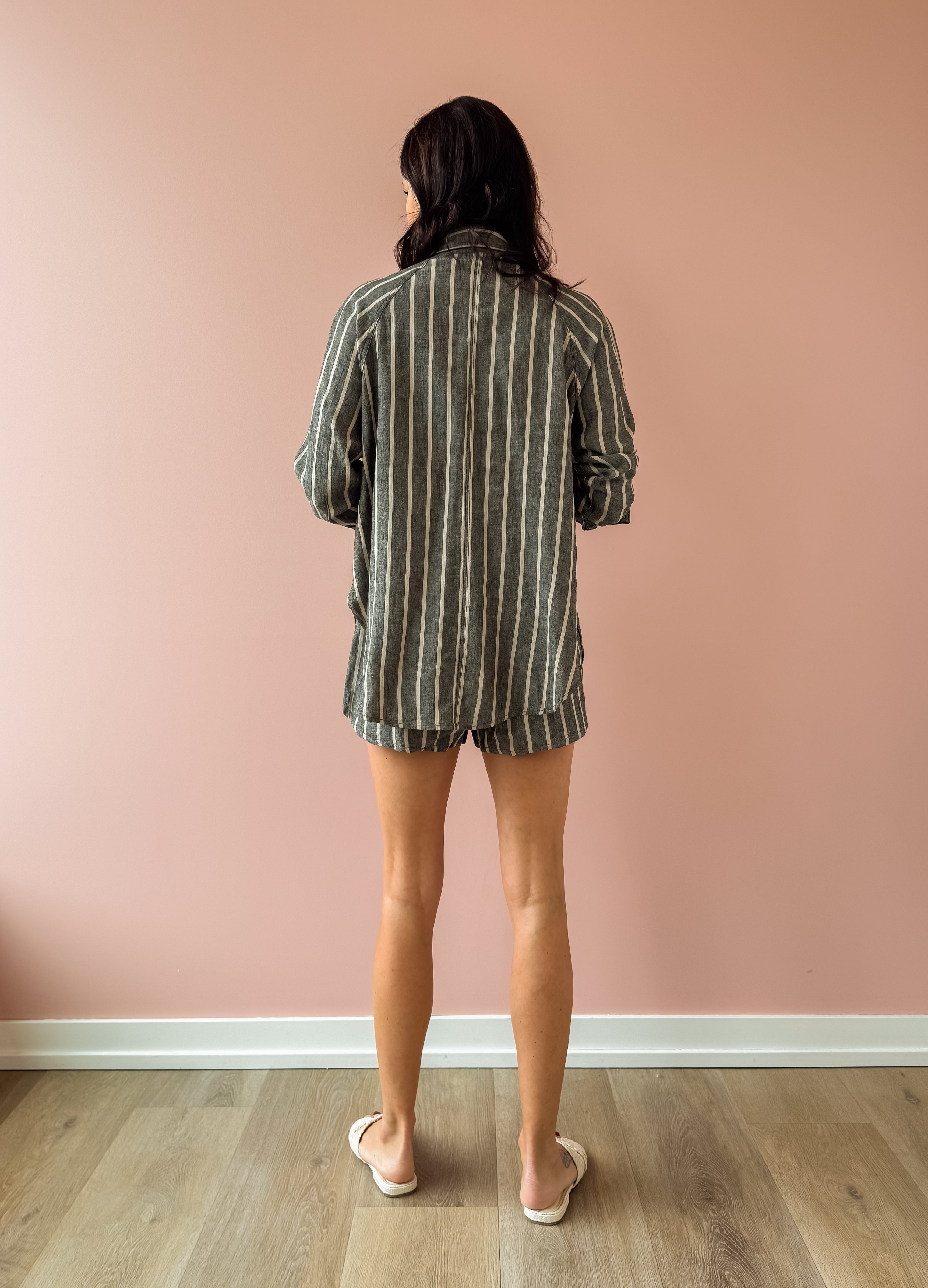 From beach days to nights out, The Perfect Line Short is your go-anywhere essential. Crafted in a soft linen blend with classic stripes, these shorts transition seamlessly across your lifestyle. Functional side pockets and a comfortable elastic waistband keep you at ease, while the lightweight fabric works as a chic cover-up or standalone piece. Style them with the matching top for a coordinated set, then finish with flat sandals for relaxed elegance or platforms for an elevated edge.