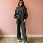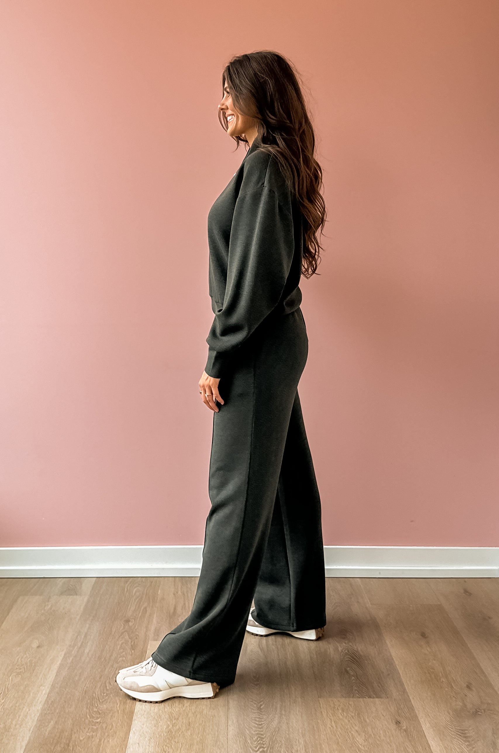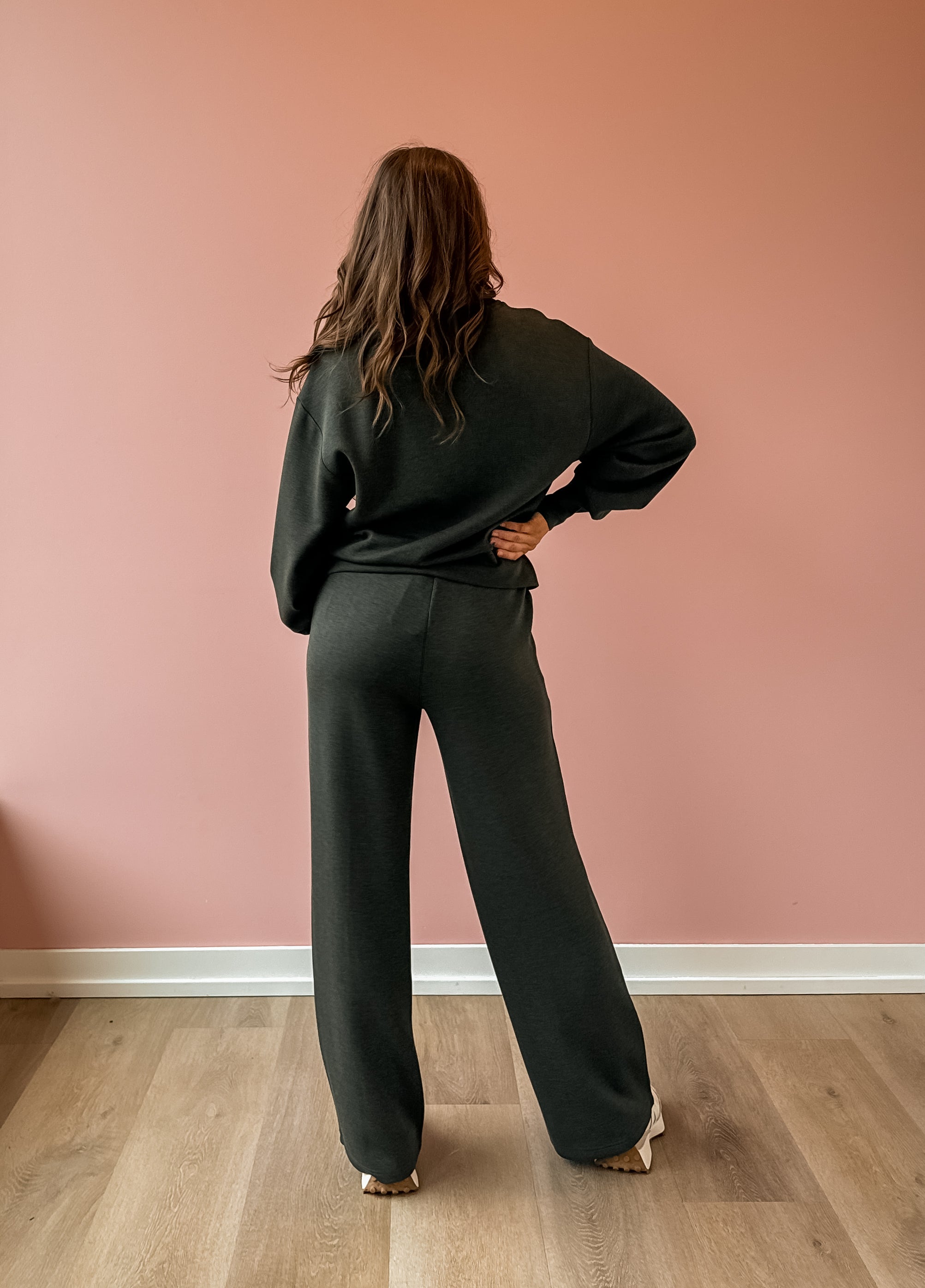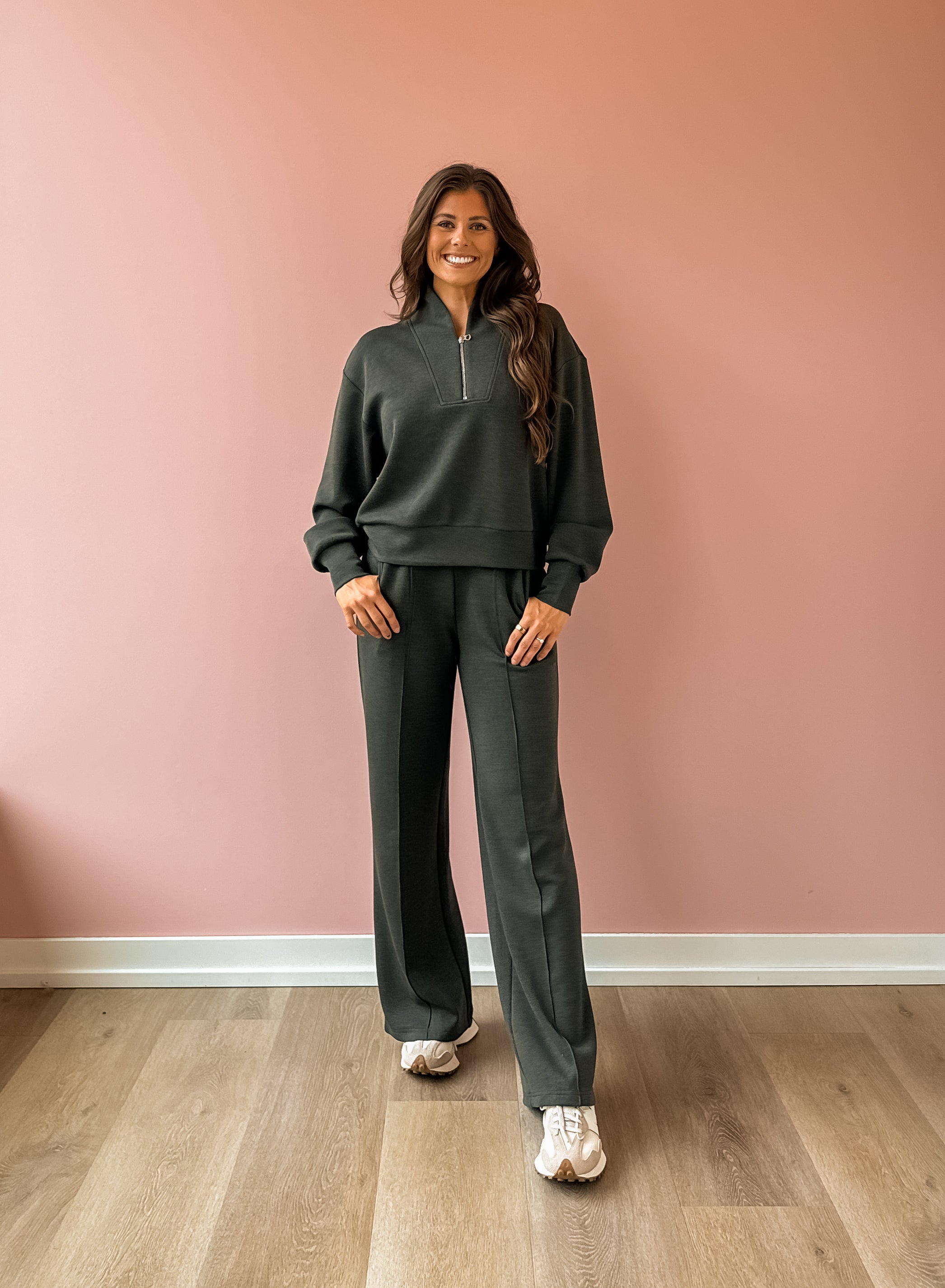 Experience unmatched comfort and style in these DoubleSoft® pants. Featuring a high-rise waist, wide-leg silhouette, elasticated waist with internal drawcord, and elegant pintuck detailing, they're a versatile wardrobe essential in a wearable Olive Marl. Pair with the Davidson Sweatshirt and sneakers for an easy everyday set!