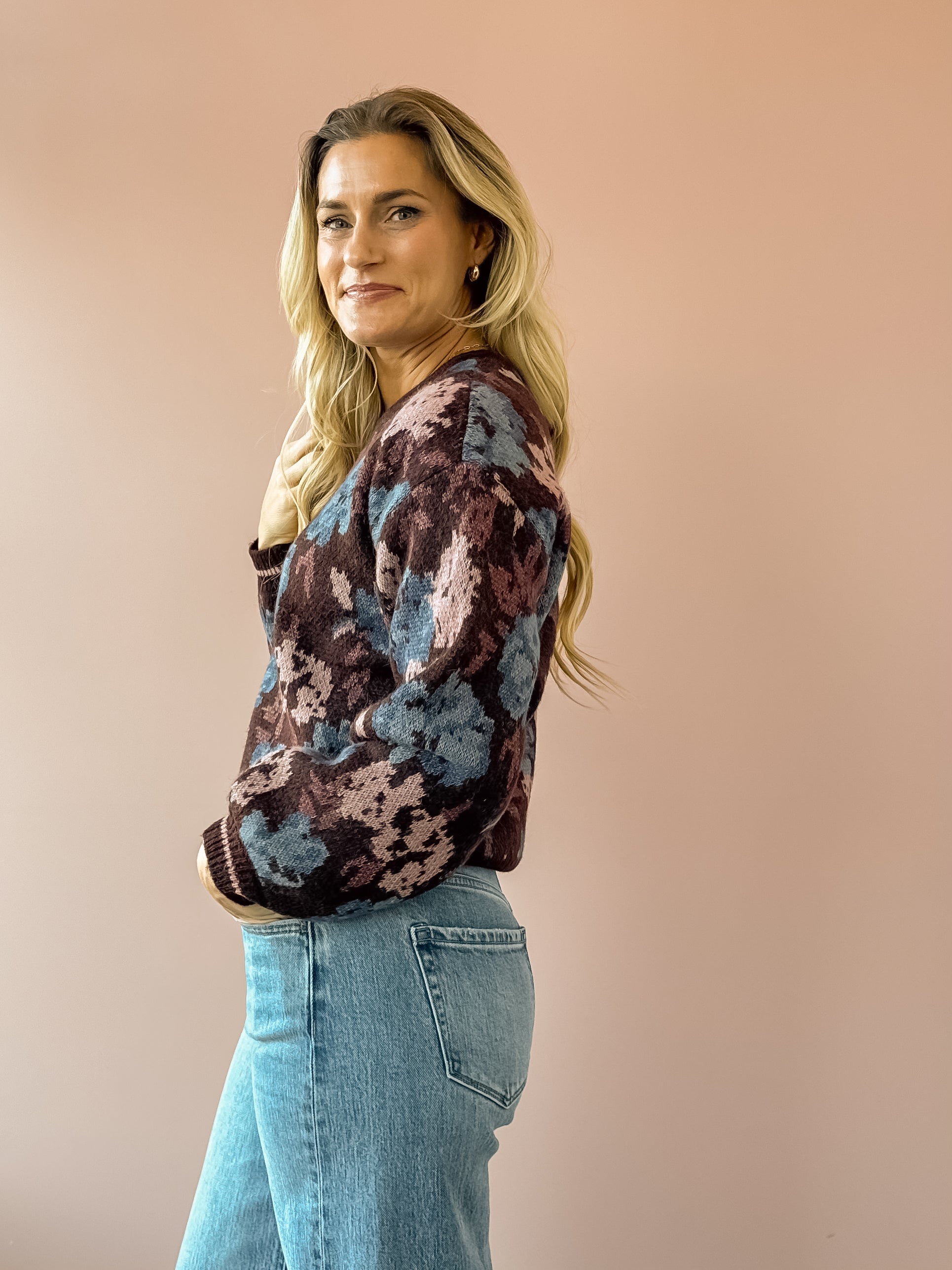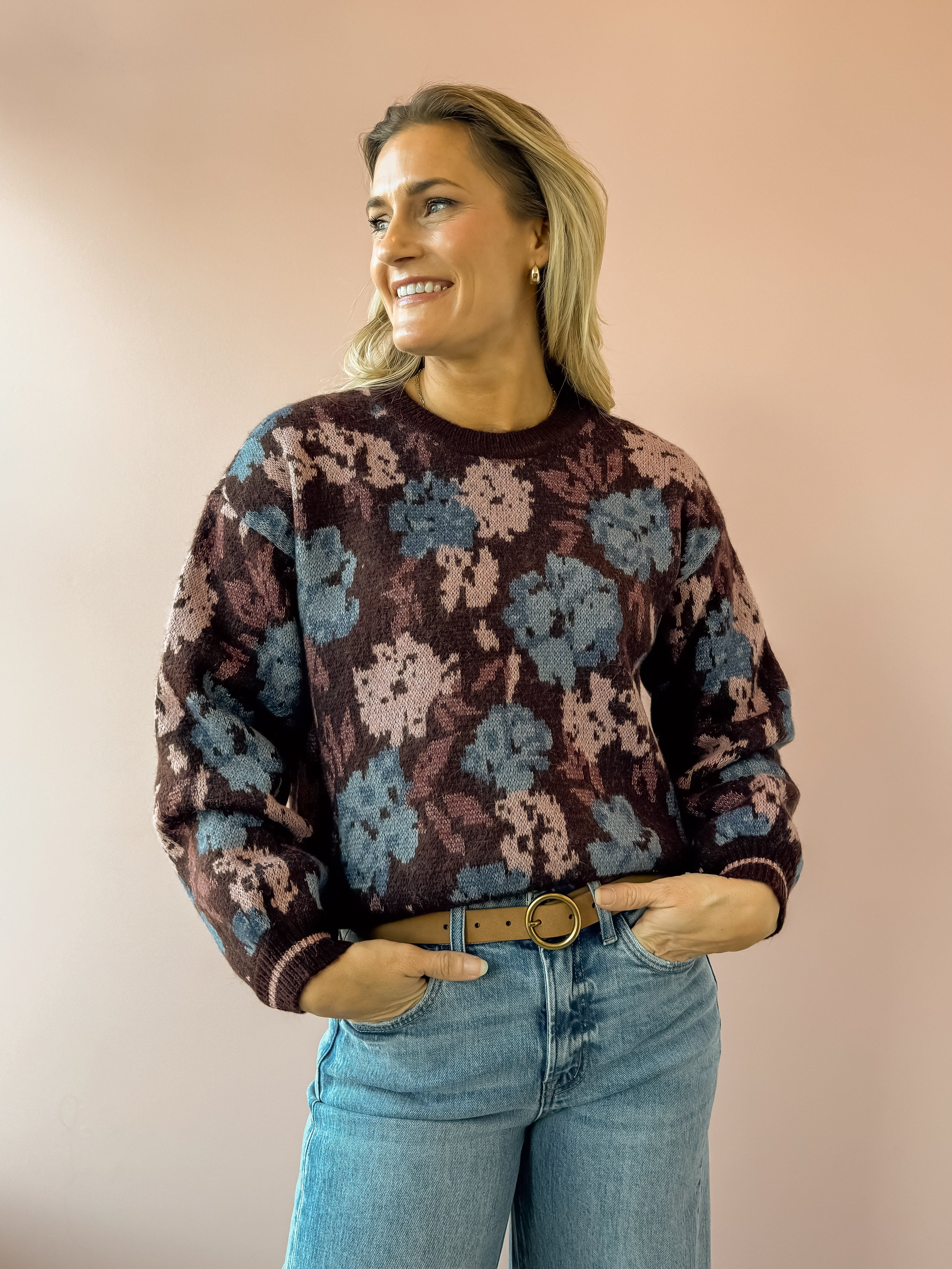 The Thorian Sweater features a colorful floral print and a flattering cropped fit, combining a high boat neck with playful gigot sleeves. This classic yet feminine piece offers easy elegance with a fun, sophisticated touch. Pair this cozy sweater with denim and a bootie!