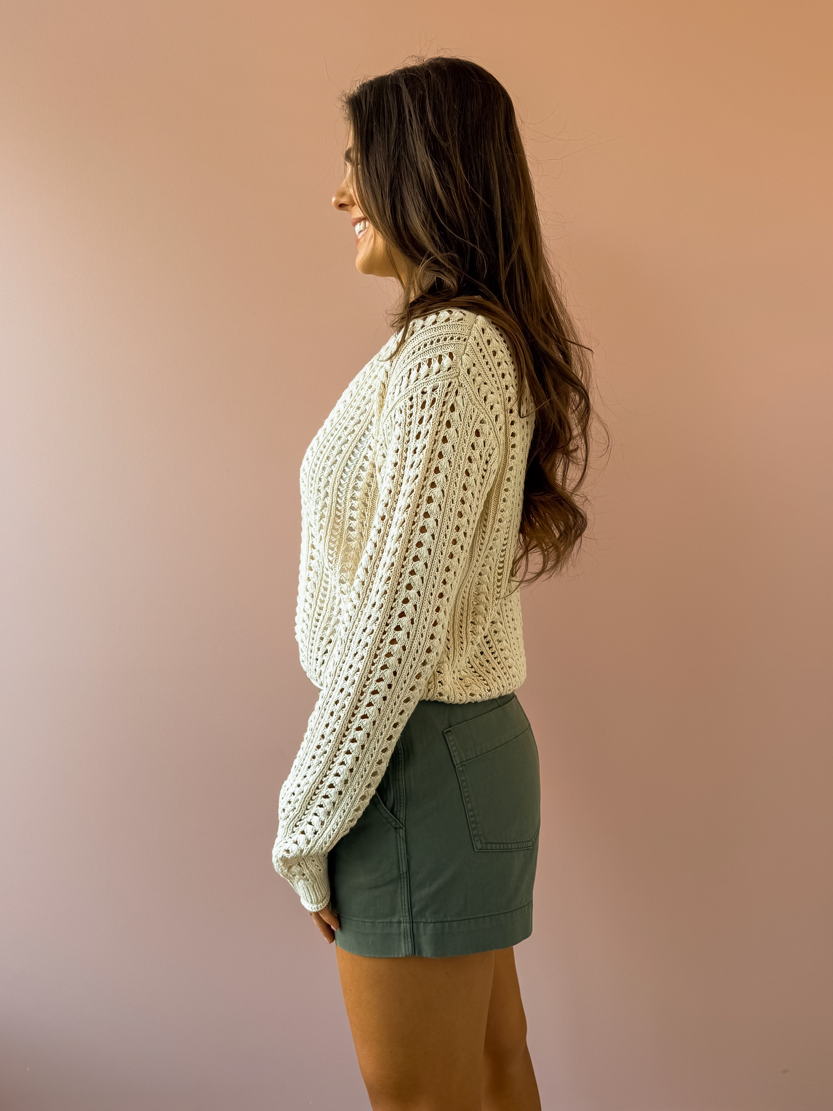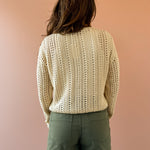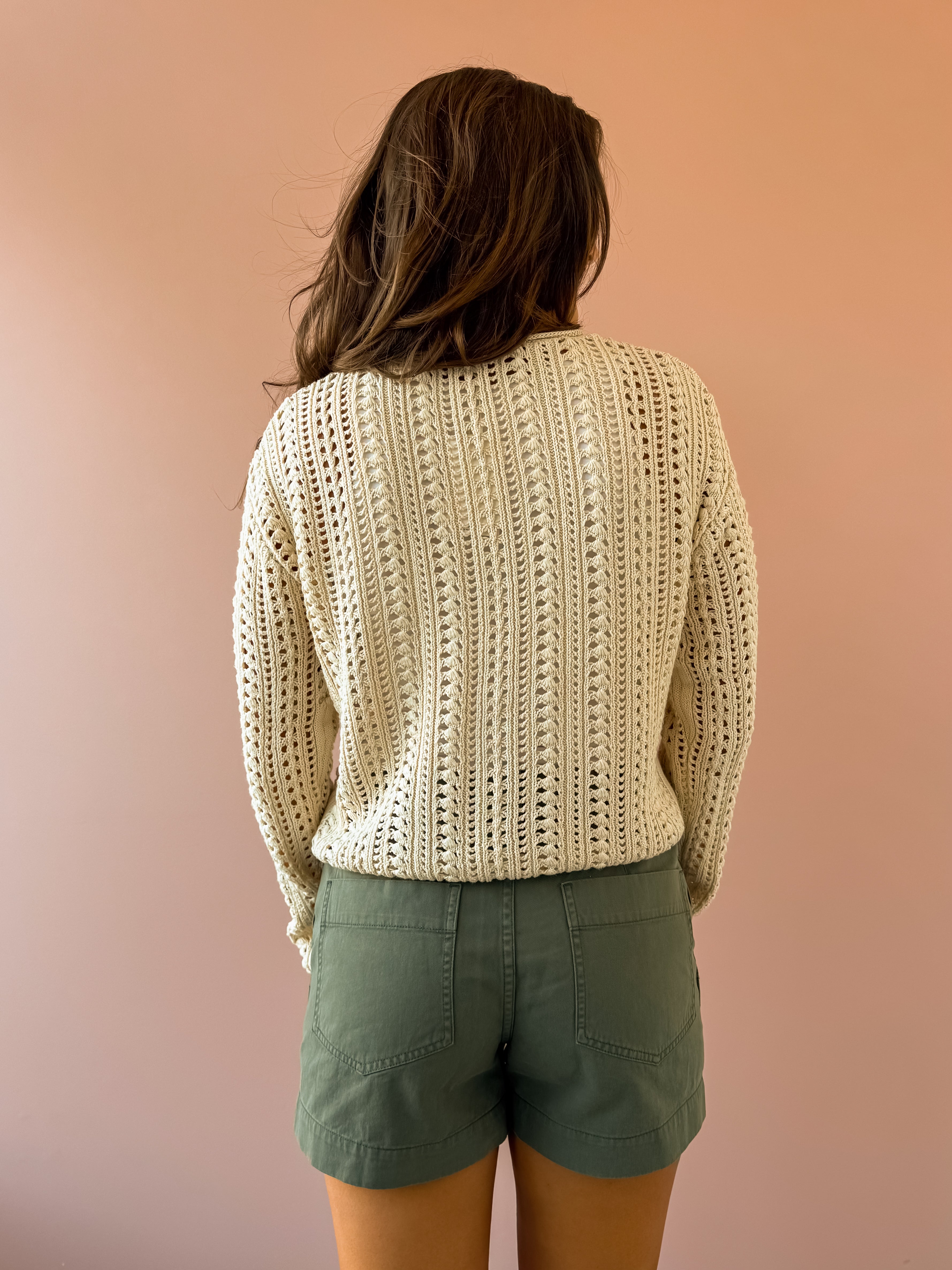 Designed in a soft, open crochet knit, this relaxed sweater feels light and effortless for warmer days. The rolled neckline and ribbed cuffs add subtle texture, making it feel a bit more elevated while still easy to wear. It’s the perfect layer when you want a little extra coverage without the weight. Style it over a simple tank with denim and a flat for an easy, put-together look.