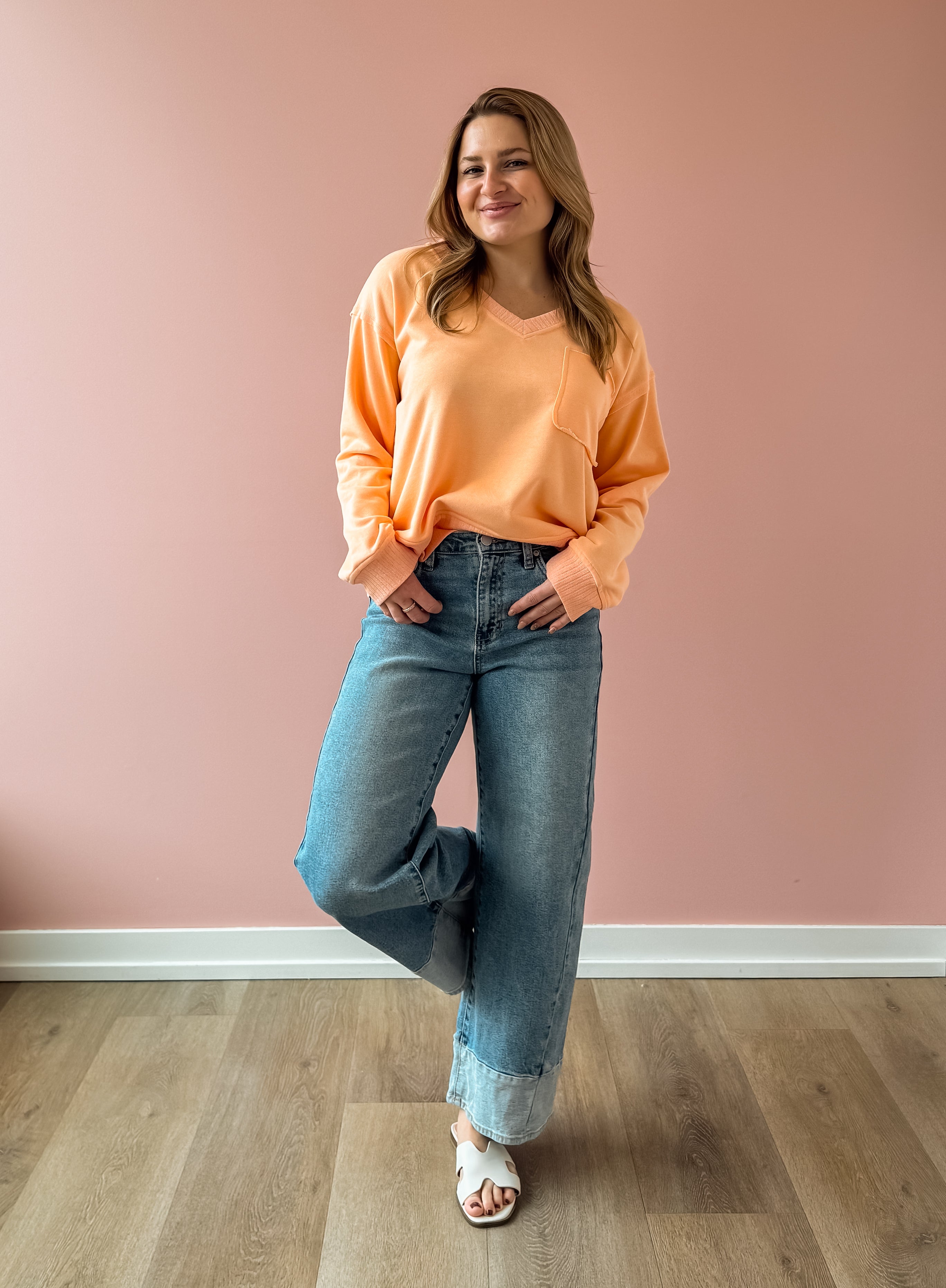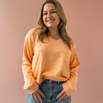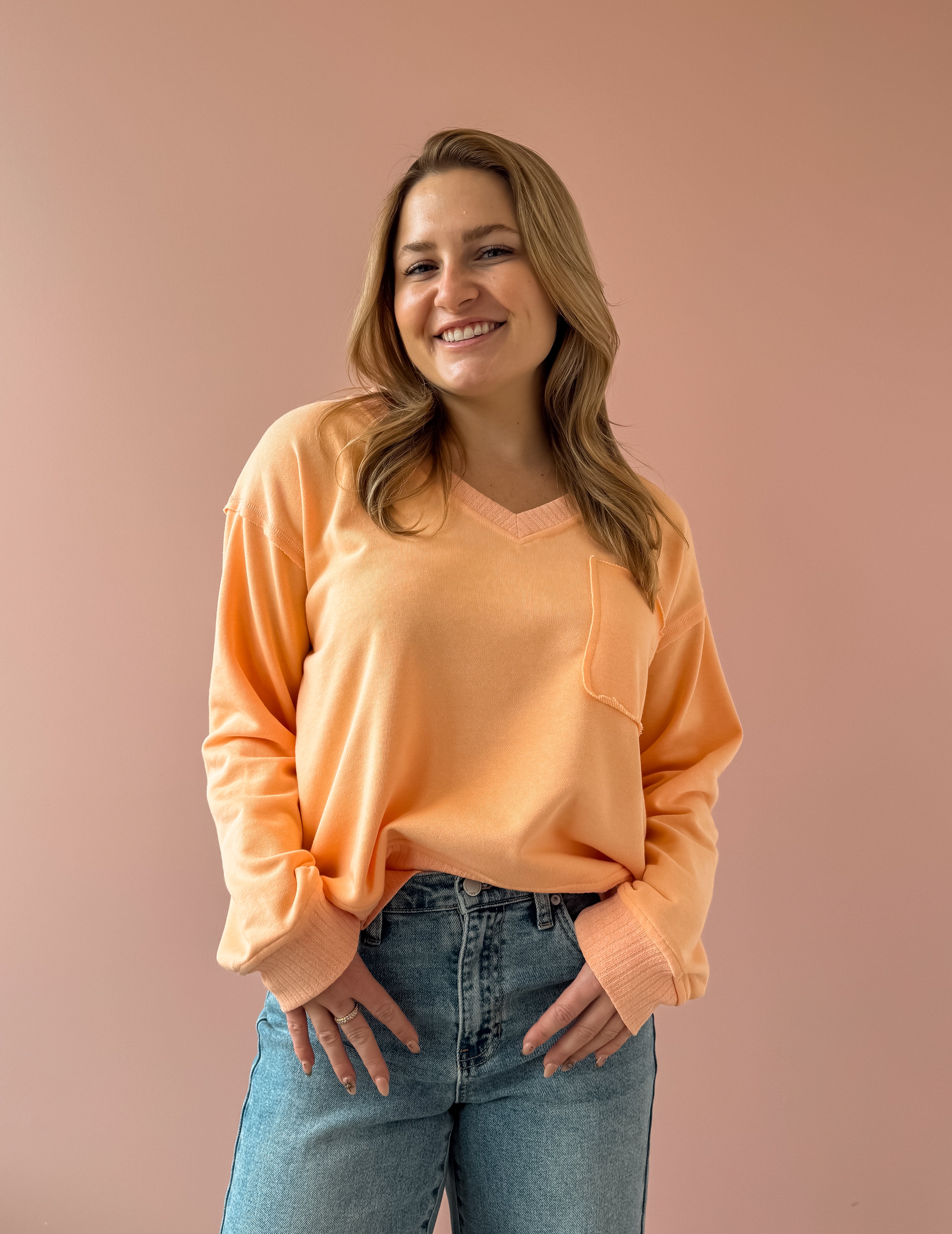 The Jamie V Neck Top brings vibrant energy to your everyday wardrobe. This lightweight essential features a flattering V neckline in a striking orange hue that pairs effortlessly with denim and sneakers for casual sophistication. Its versatile design makes it an ideal layering piece, allowing you to create multiple looks throughout the seasons. We love this with sneakers or a slide!