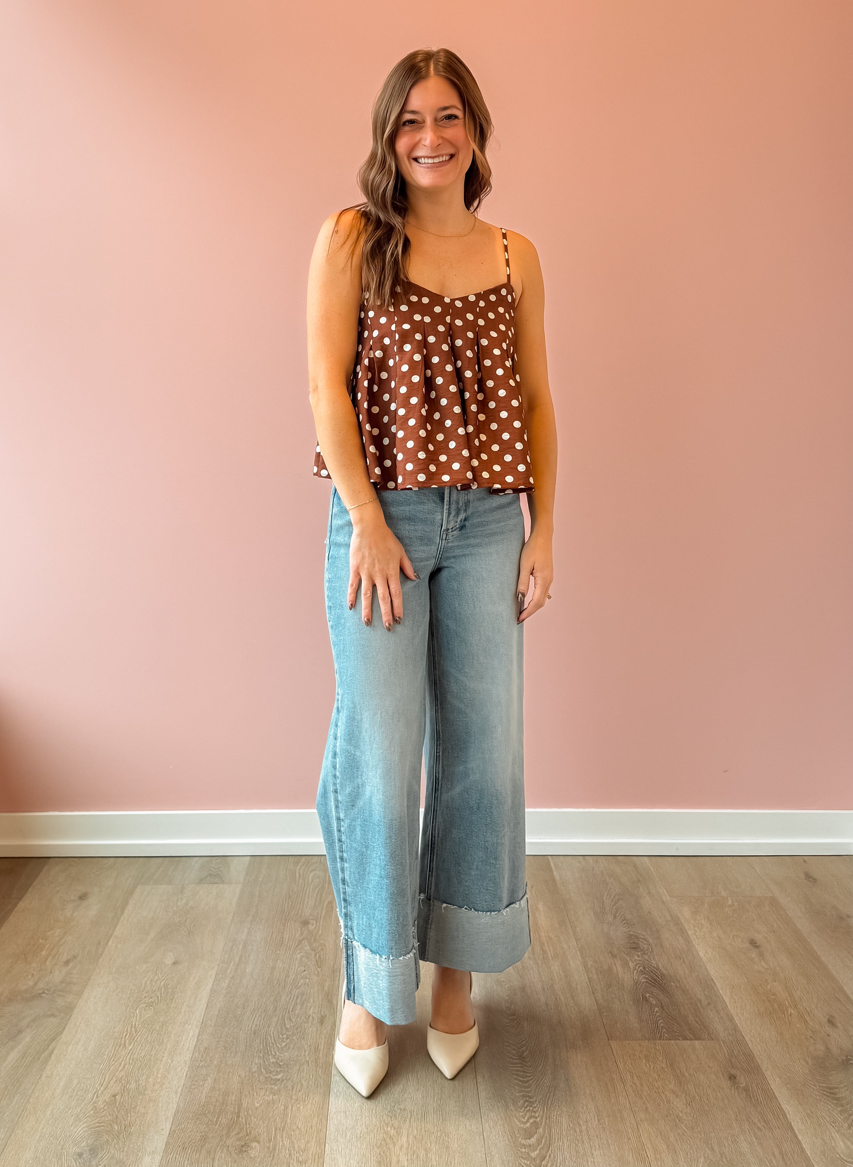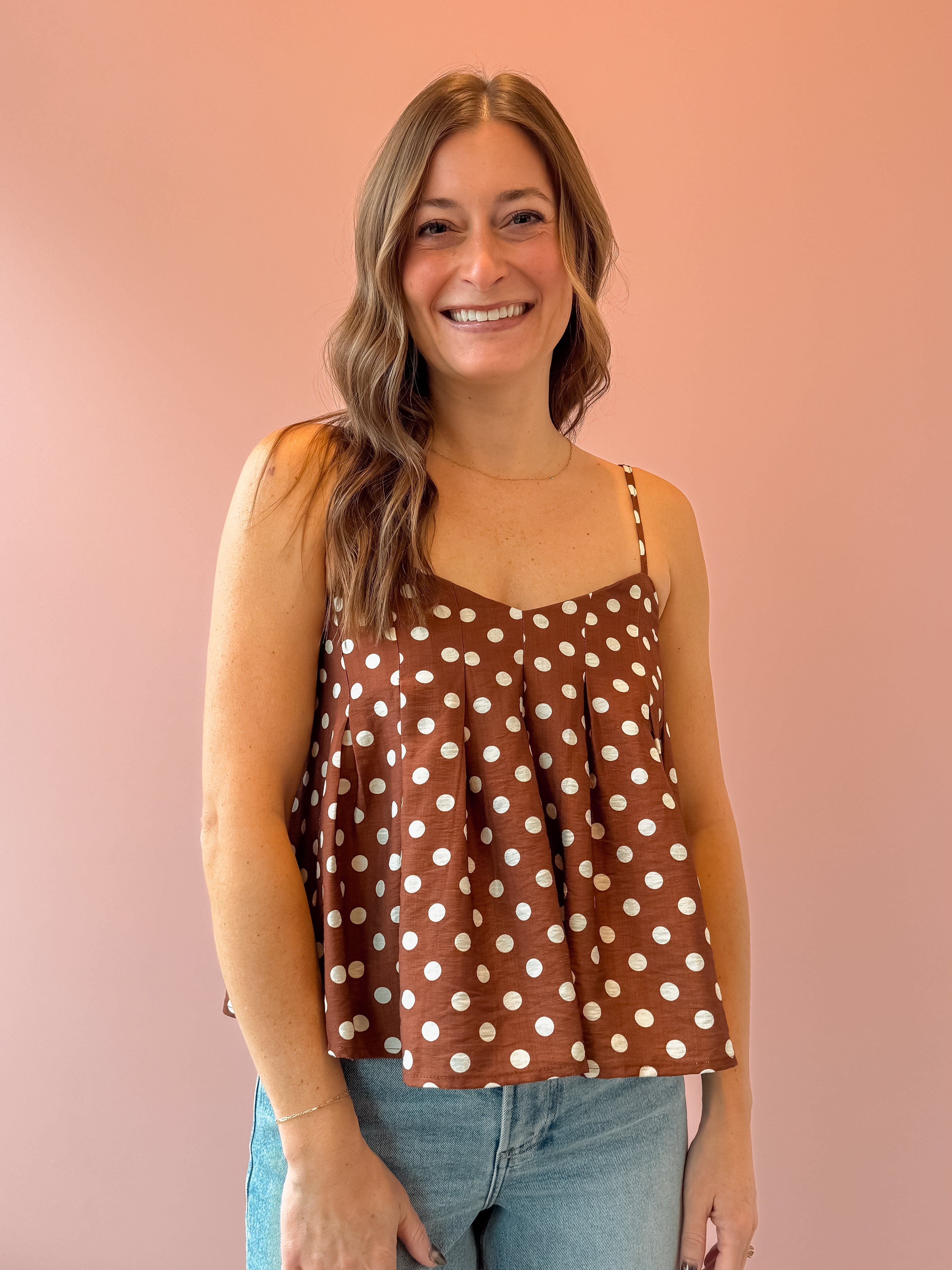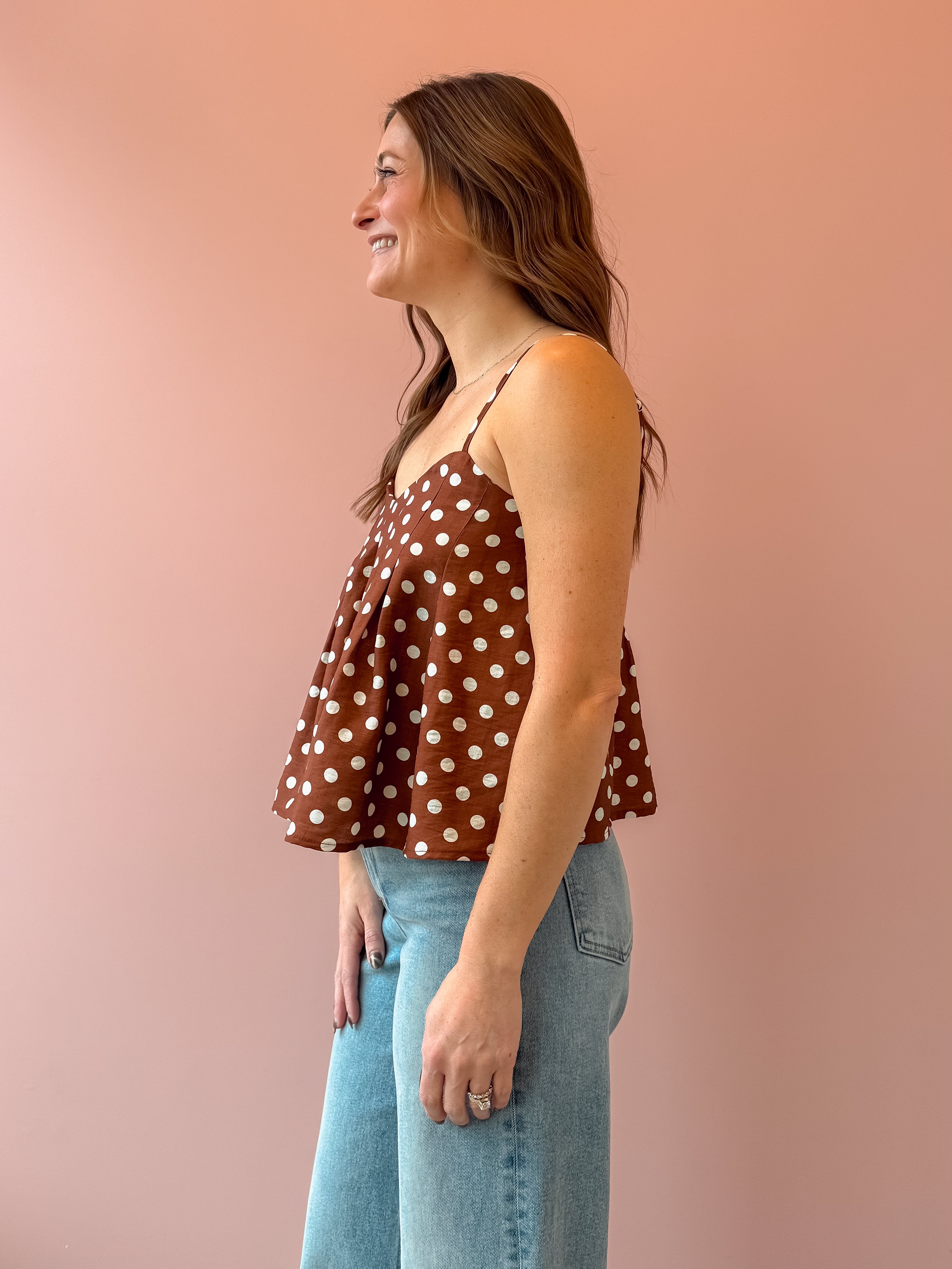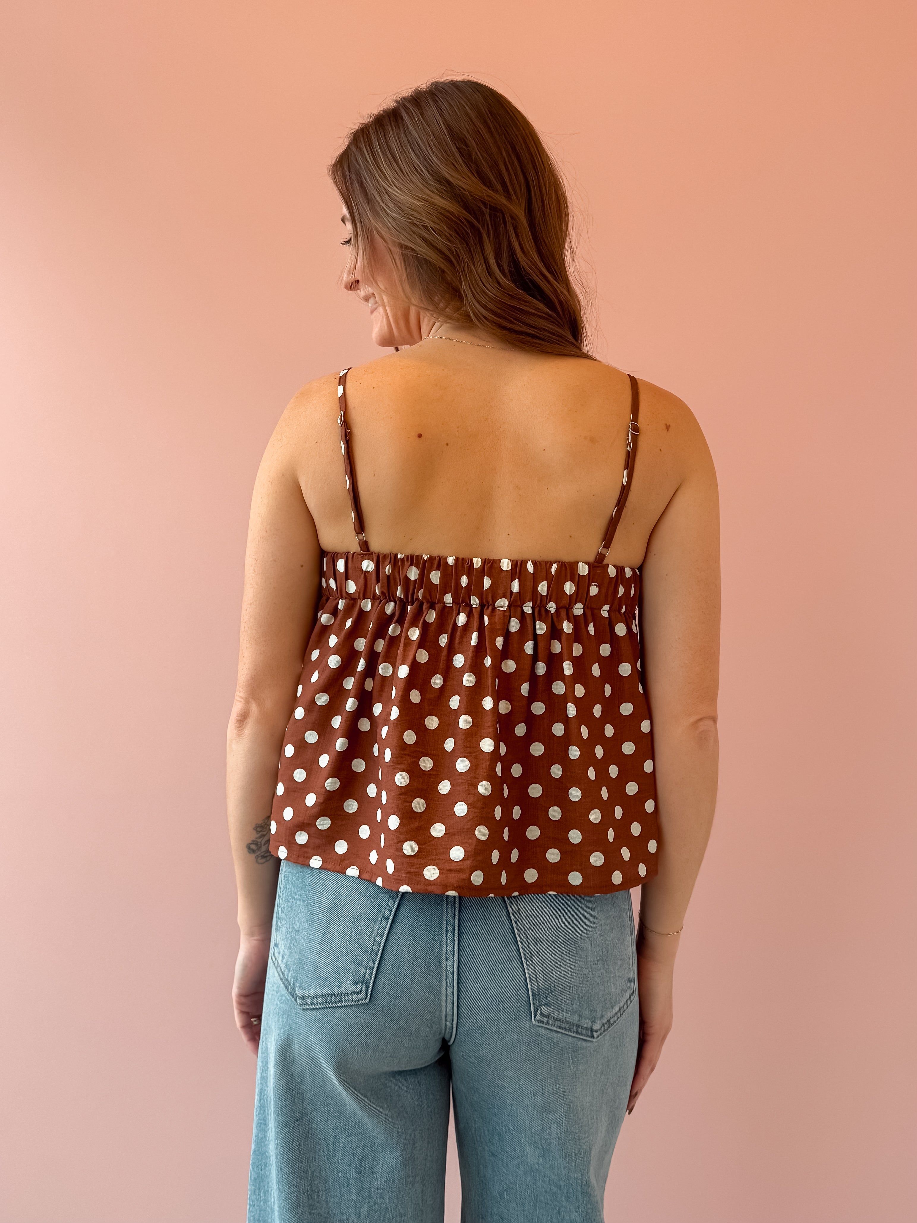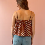 The Sadie Top is a sweet, girly essential with a cropped, flowy silhouette and classic brown-and-white polka dots that feel timeless and playful. Lightweight and easy, it drapes beautifully without clinging—perfect for effortless layering. Style it with high-rise denim or a breezy skirt, then add sandals or heels for an easy, feminine look.