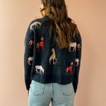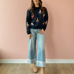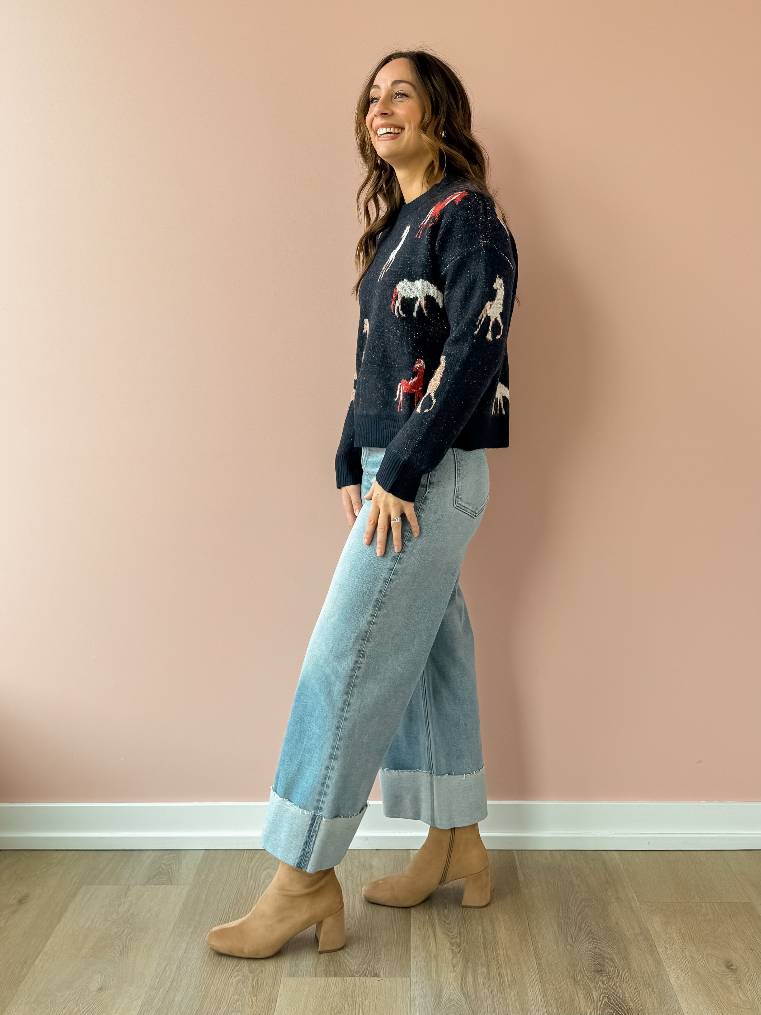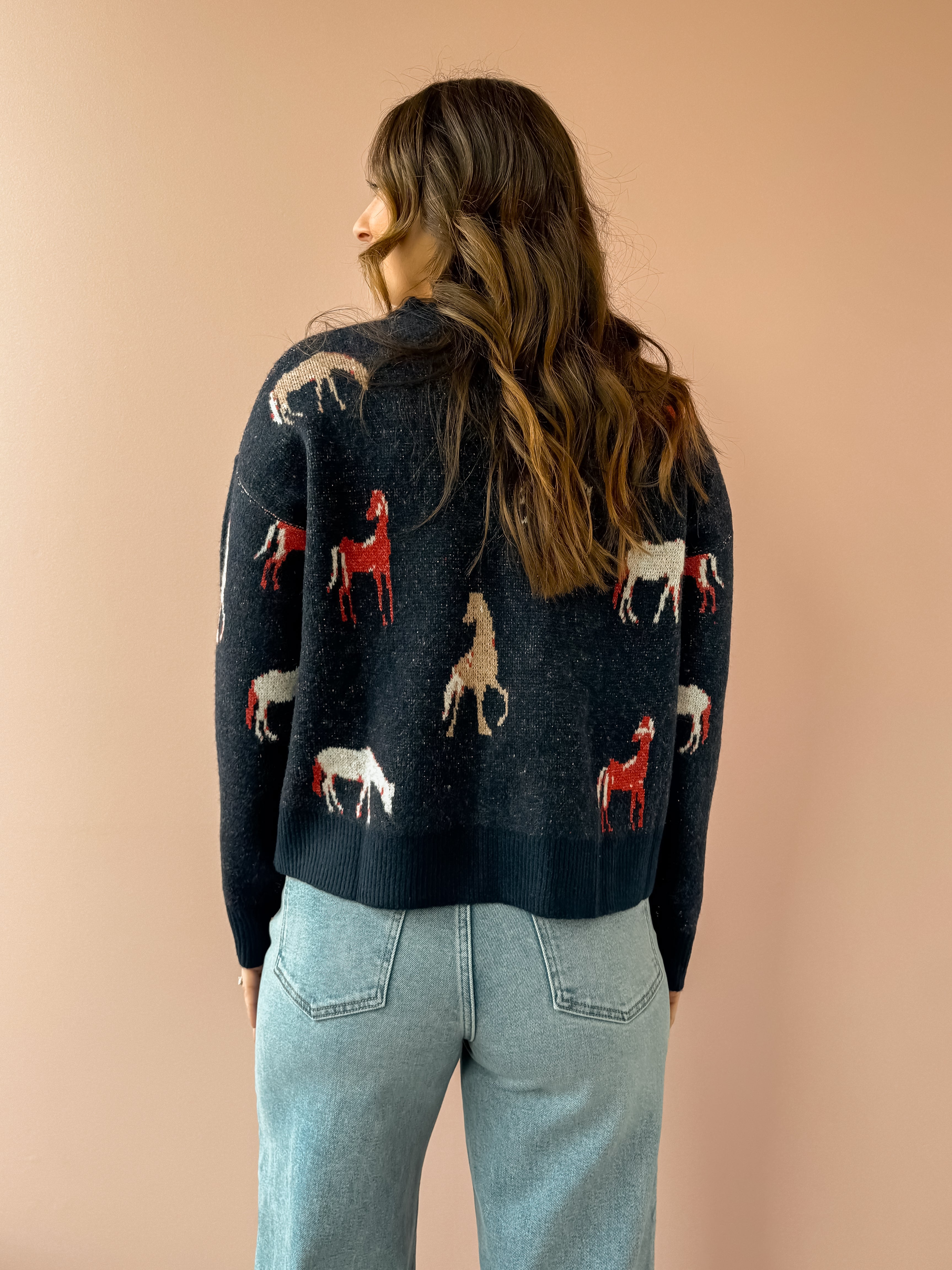 The Wild Horse Sweater combines comfort and style in a cozy navy design featuring charming white, brown, and red horse accents. Its round neckline makes it perfect for layering, while the vibrant horse patterns add a unique touch to your casual wardrobe. Pair it with your favorite denim and boots for effortless, everyday cool look.