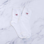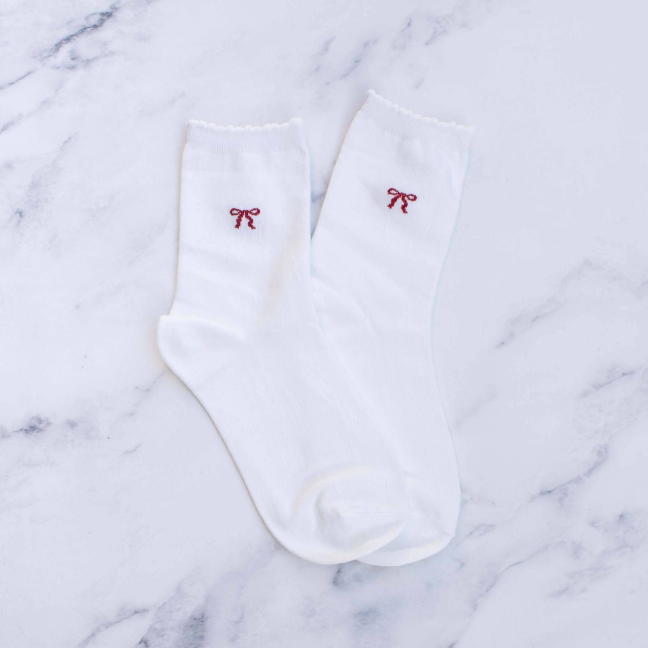 Sweet and simple, these socks feature a charming red bow detail on the cuff, adding a playful and feminine touch to your everyday look. They offer a snug, comfortable fit with subtle stretch. Finished with a delicate scalloped trim, these socks bring a polished detail whether you're dressing up or keeping it casual.