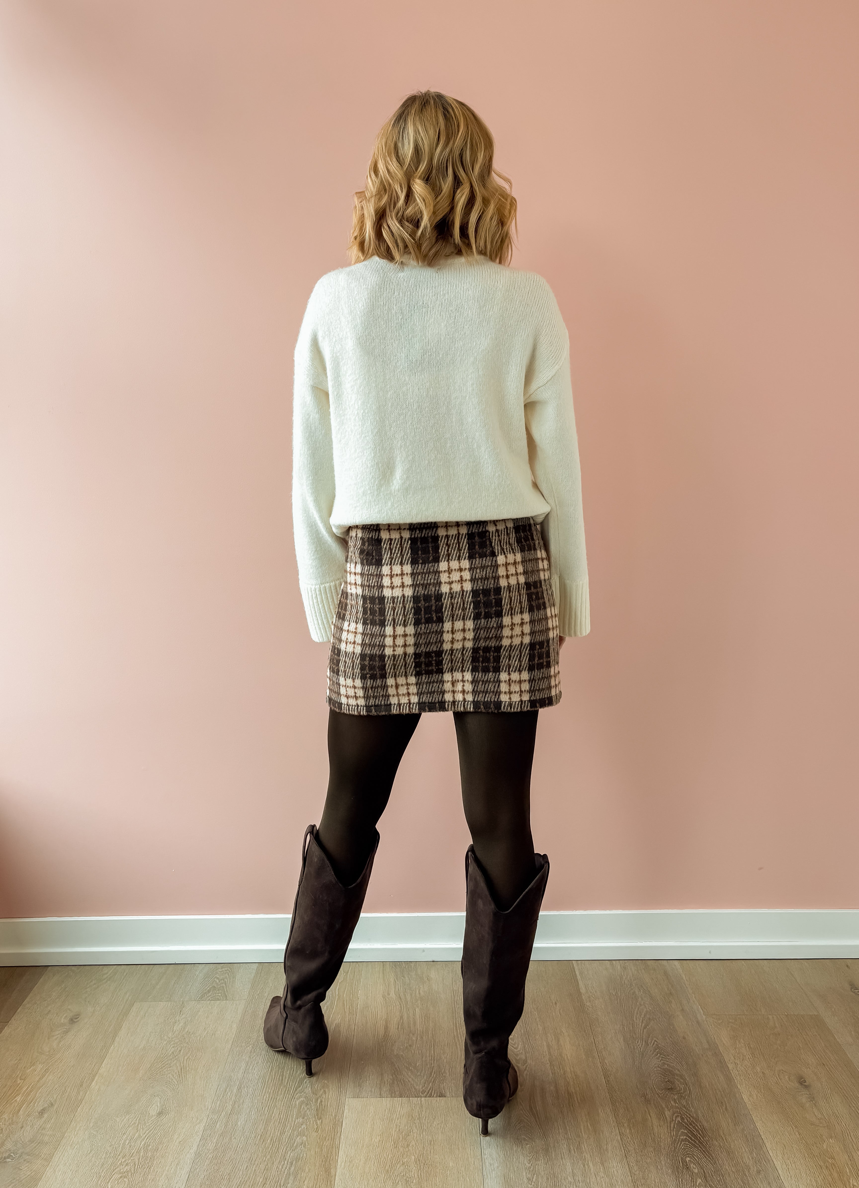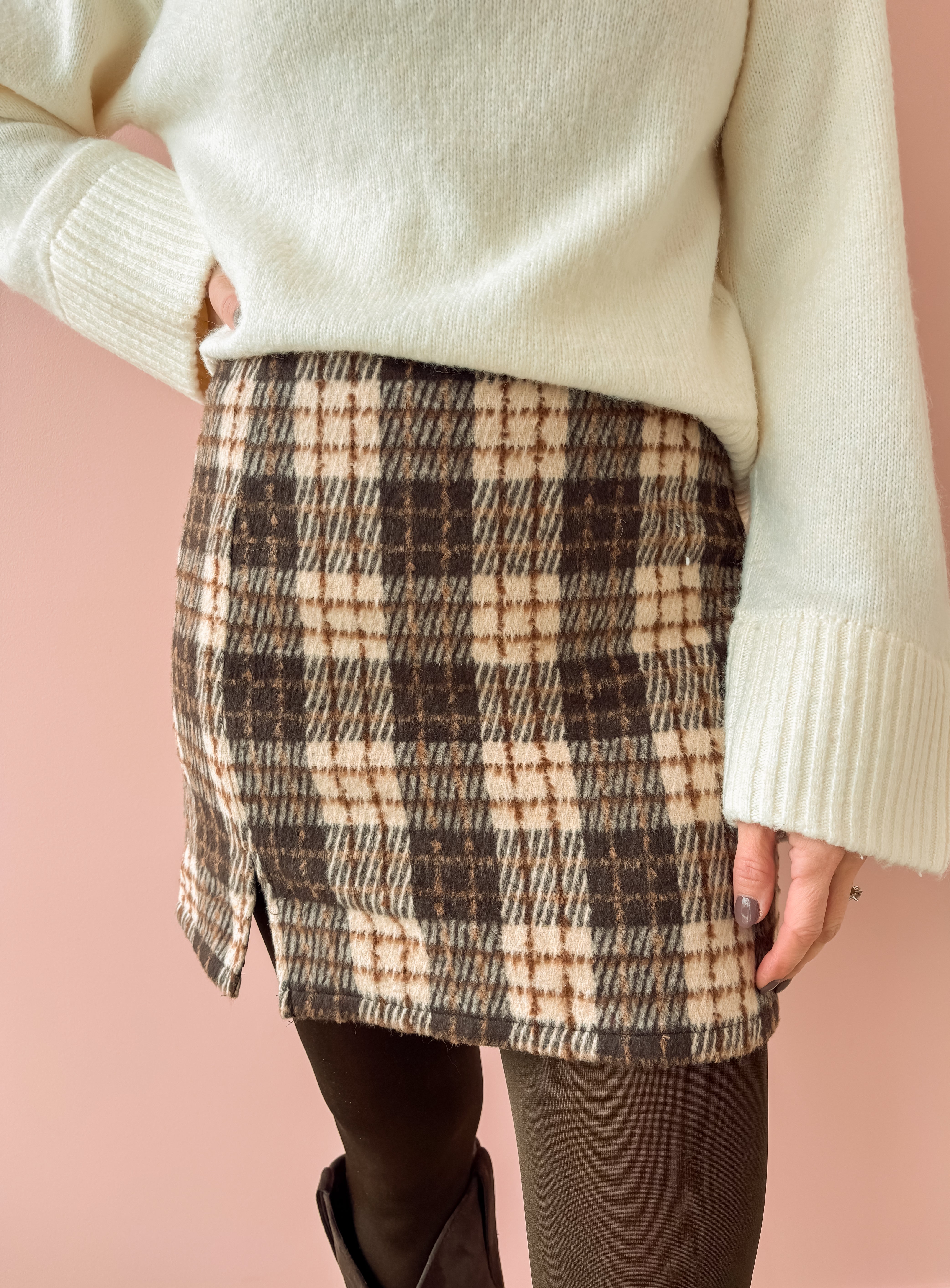 Add a touch of flirtiness and sophistication to your wardrobe with the Emmy Mini Skirt! Featuring shades of plaid brown and a mini side slit, this versatile skirt can easily be dressed up or down. The high rise and mini length make it perfect for pairing with a sweater, tights and tall boots, making it a must-have for any occasion. From the office to date night, this skirt will elevate your style.