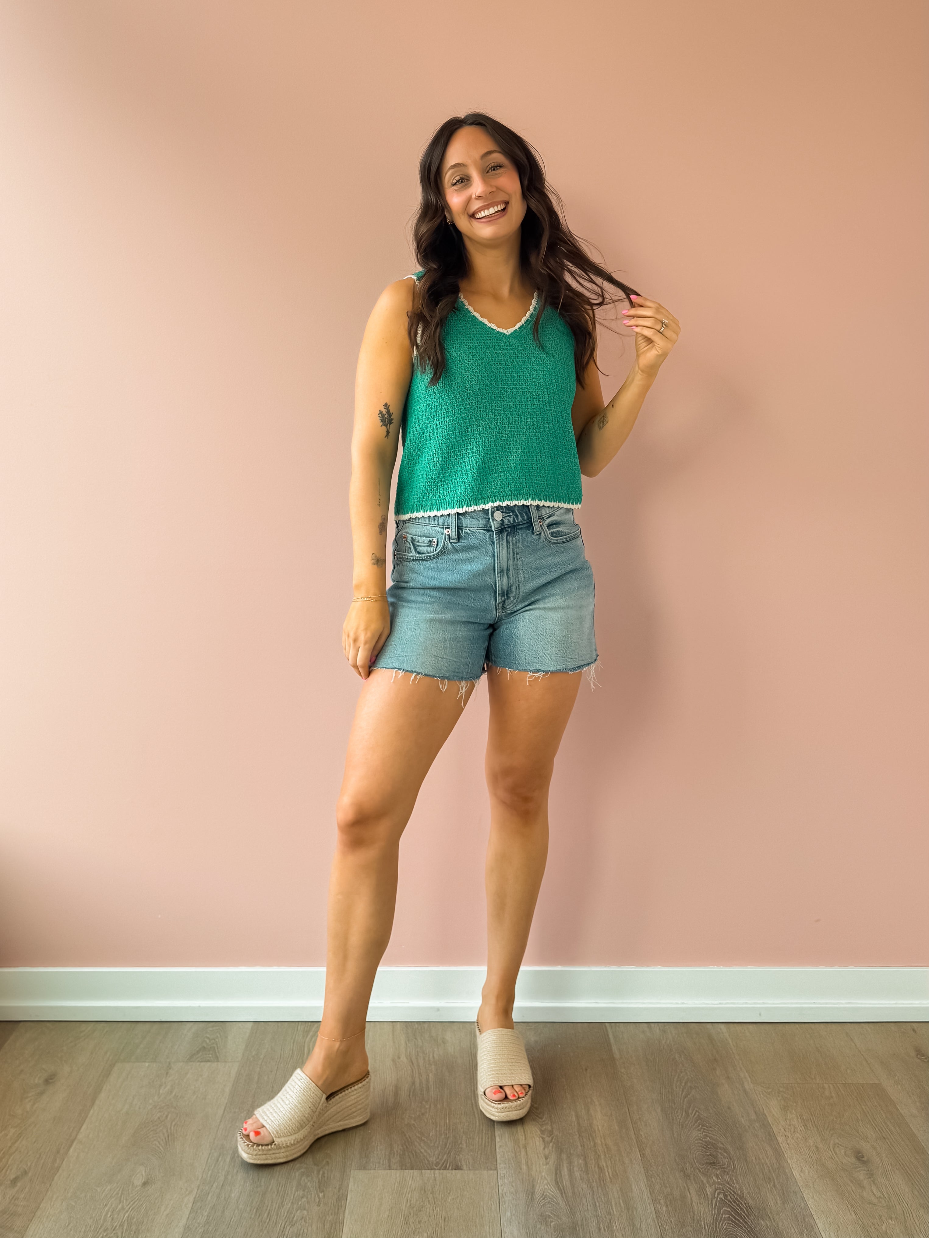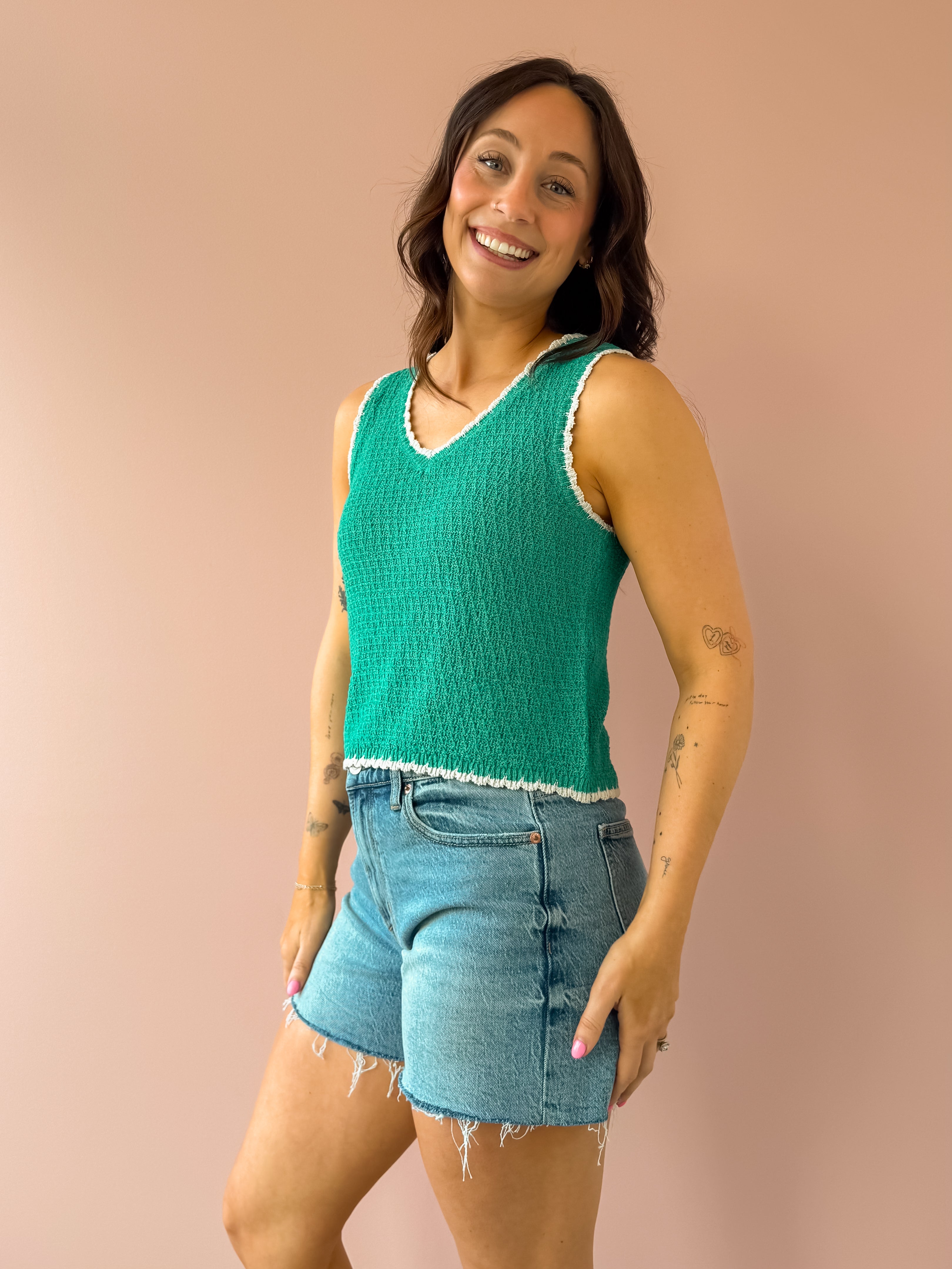 Elevate your casual wardrobe with the Yessenia Whipstitch Tank in La Palma. This sleeveless essential features a striking contrast color trim and soft yarn blend fabric that drapes beautifully. The relaxed V-neck silhouette hits right at the hem for an effortlessly chic look. Pair it with denim and flats for a chic, on the go look!